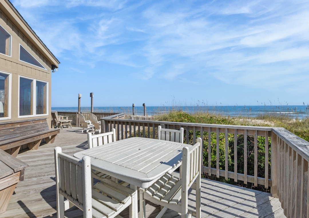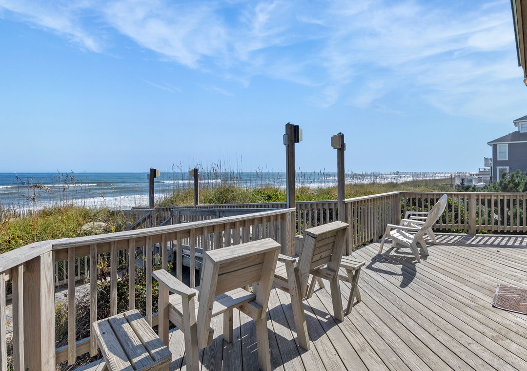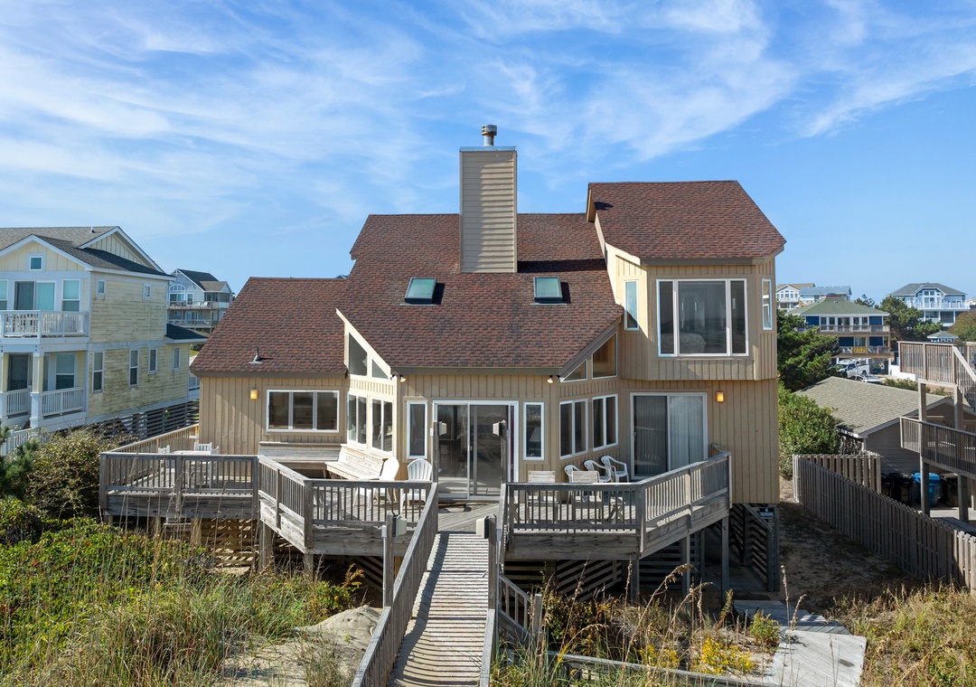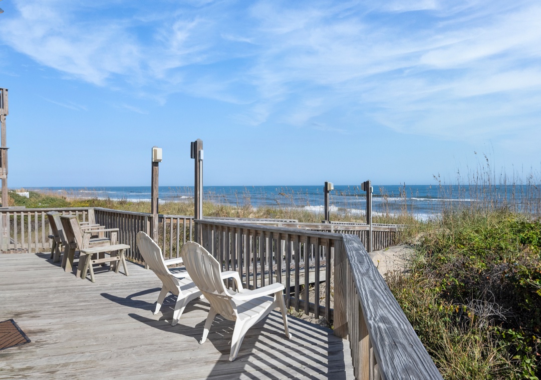 Invite family and friends to discover the natural beauty and simplicity of Chirality (pronounced kie-ra-lity; “chirality” is synonymous with “handedness” Gr. cheir, hand). This oceanfront home in Duck is situated right on the beach with panoramic views of the Atlantic. Enjoy the salty ocean breezes from the expansive sun deck on the east side of the home, then head upstairs to the west-facing screened porch for witnessing phenomenal sunsets. A private walkway takes you from the oceanfront deck across the dunes for effortless access to the beach. Spend the day swimming, surfing, fishing or shelling - the possibilities for around-the-clock oceanfront fun are endless.