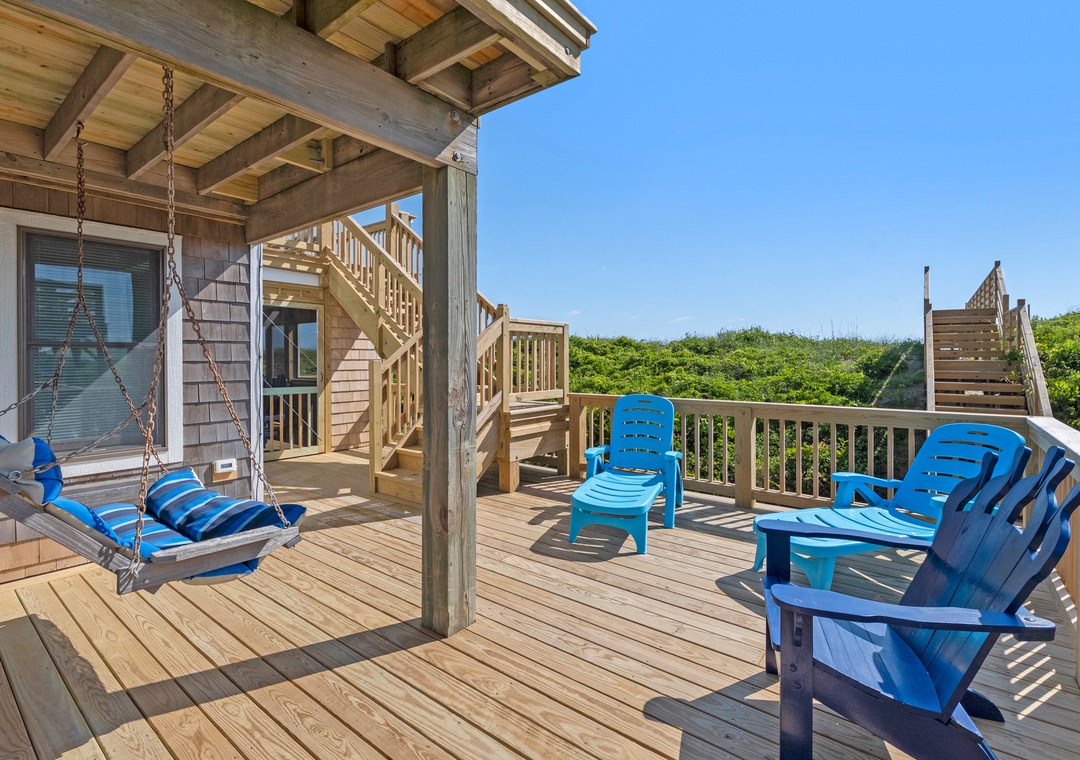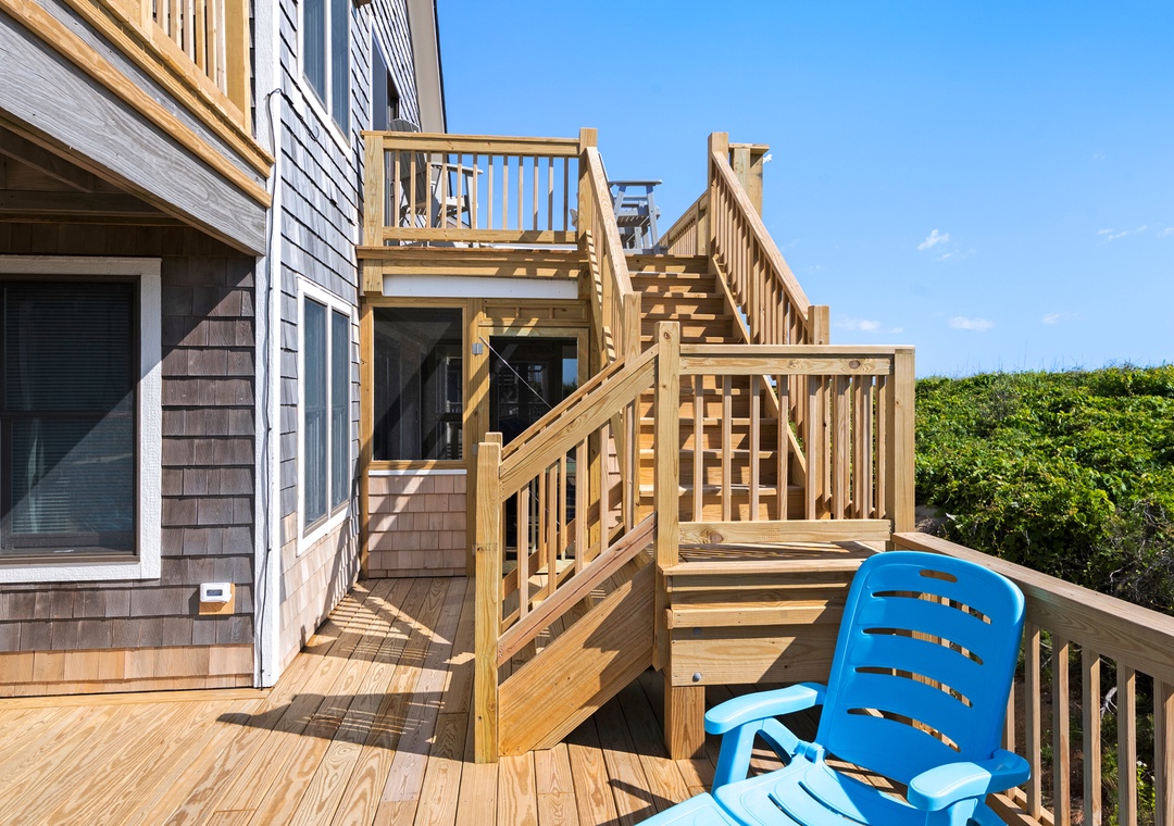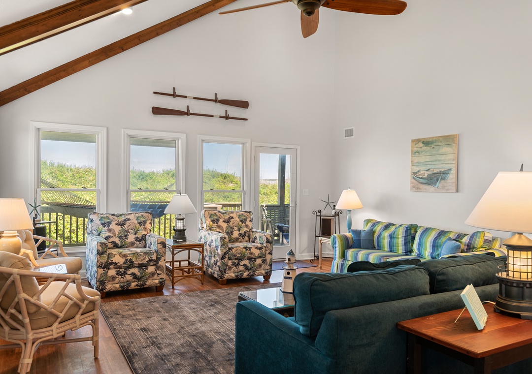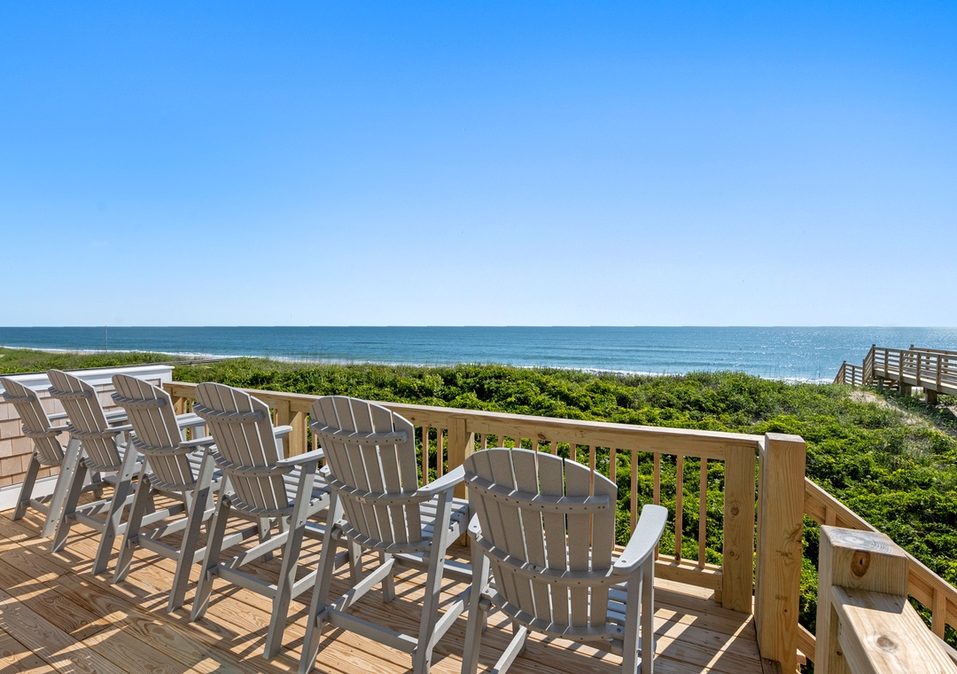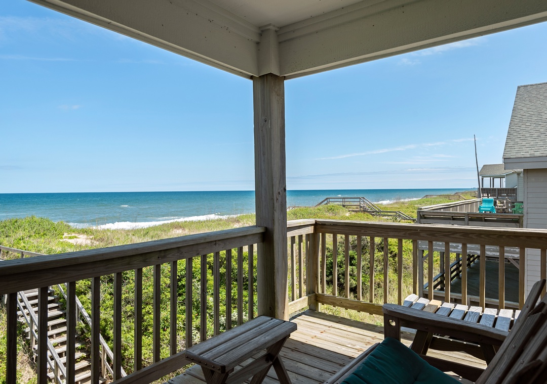 Serenity is the perfect place to be calm and peaceful. This oceanfront home lets you hear those relaxing ocean waves and watch amazing sunrises over the ocean. The quiet, tree-lined neighborhood offers a great place to walk, ride a bike or run. Grab your coffee and a good book and relax on the spacious decks. The beach is only a few feet away where you can catch some sun, gather some shells or maybe find some sea glass.