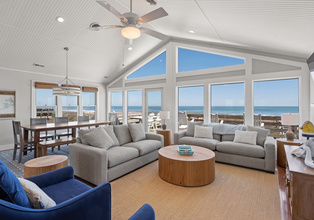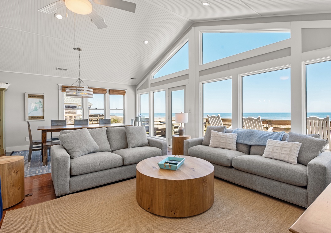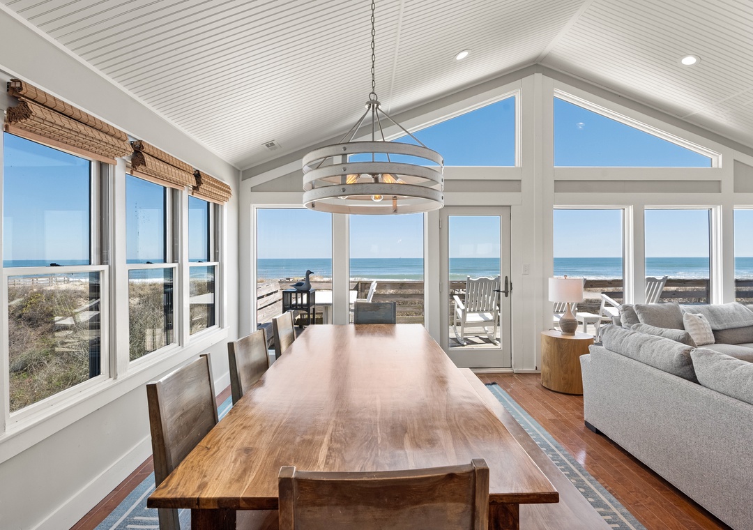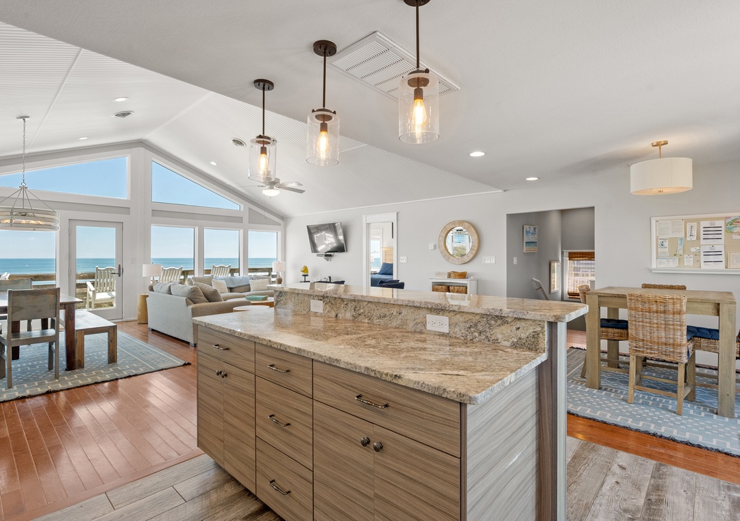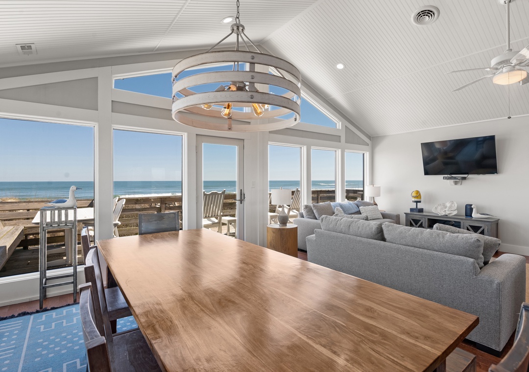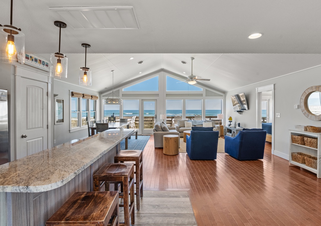 The top‑level great room is all about the water, with floor‑to‑ceiling windows and an open layout that keep the Atlantic in view from the sofa, dining table, and kitchen. Cook and connect in the well‑equipped kitchen featuring stainless‑steel appliances and an island with breakfast bar, then linger over meals while waves roll in just beyond the glass. Step out to the upper deck to sip morning coffee, feel the salt breeze, and watch dolphins cruise by just beyond the dunes.