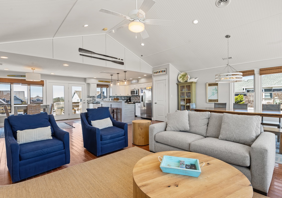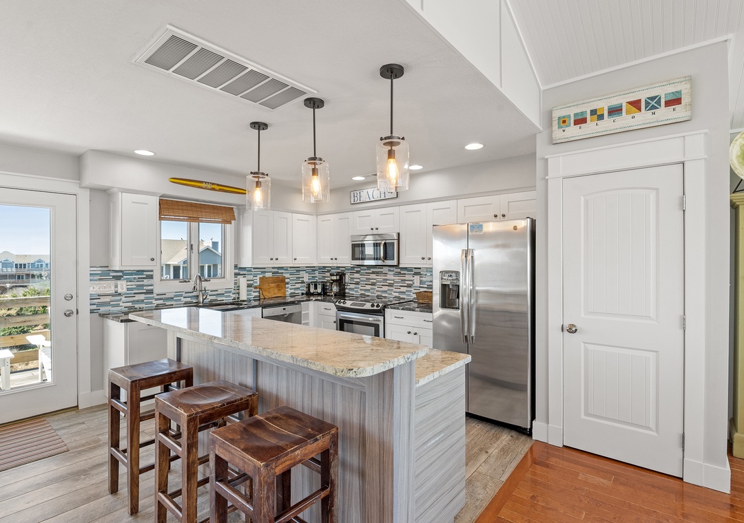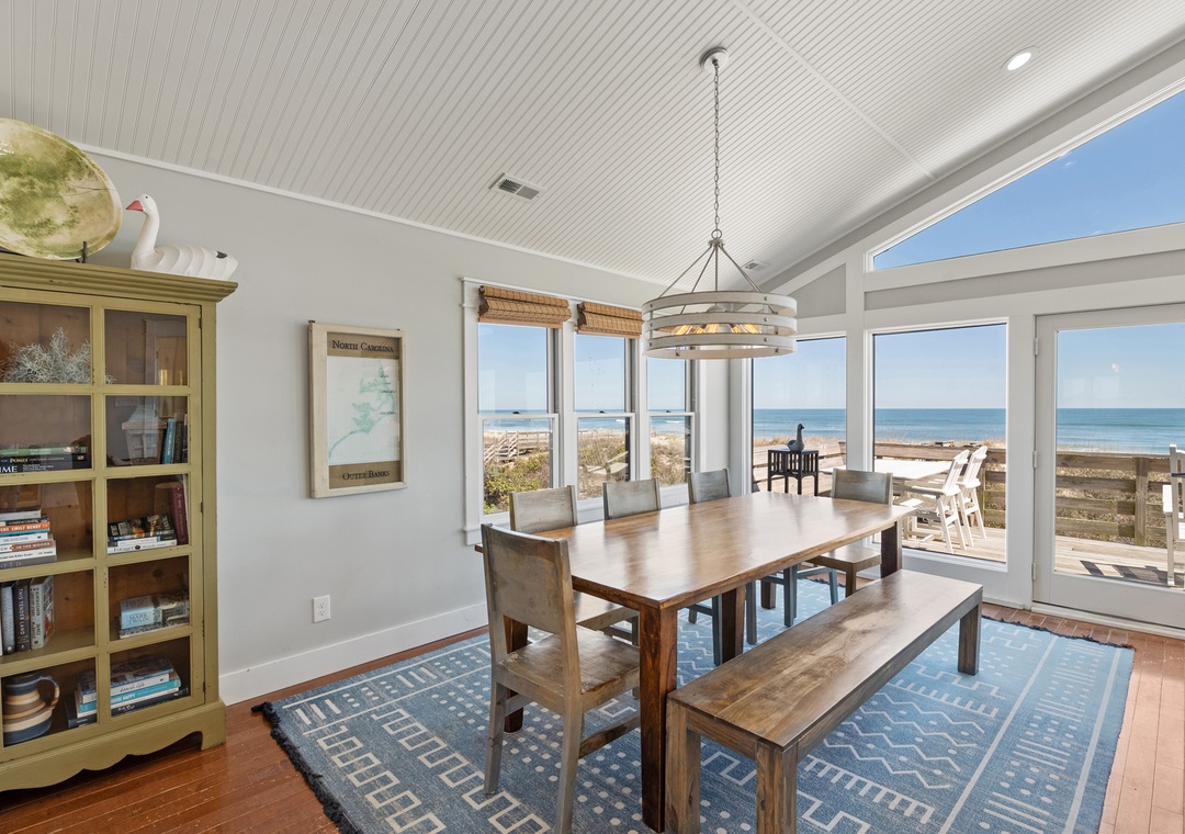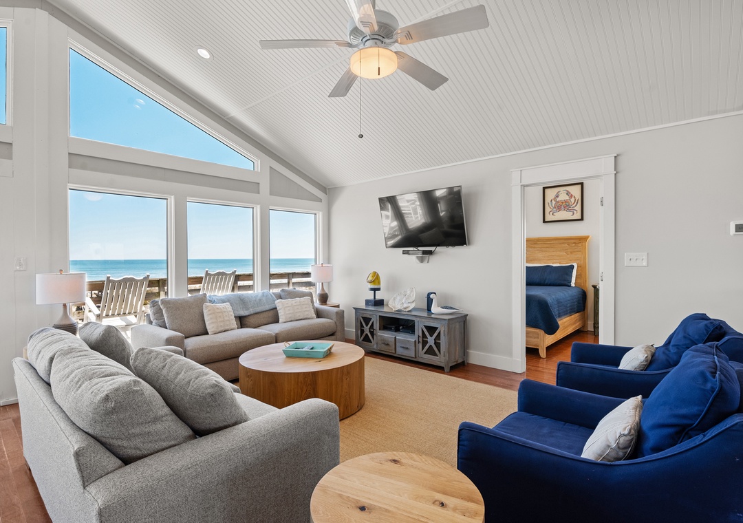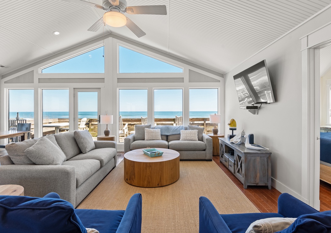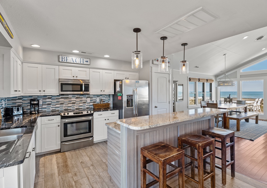 The top‑level great room is all about the water, with floor‑to‑ceiling windows and an open layout that keep the Atlantic in view from the sofa, dining table, and kitchen. Cook and connect in the well‑equipped kitchen featuring stainless‑steel appliances and an island with breakfast bar, then linger over meals while waves roll in just beyond the glass. Step out to the upper deck to sip morning coffee, feel the salt breeze, and watch dolphins cruise by just beyond the dunes.