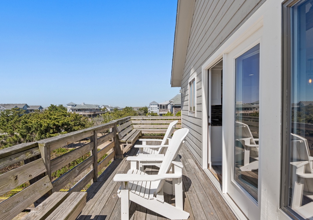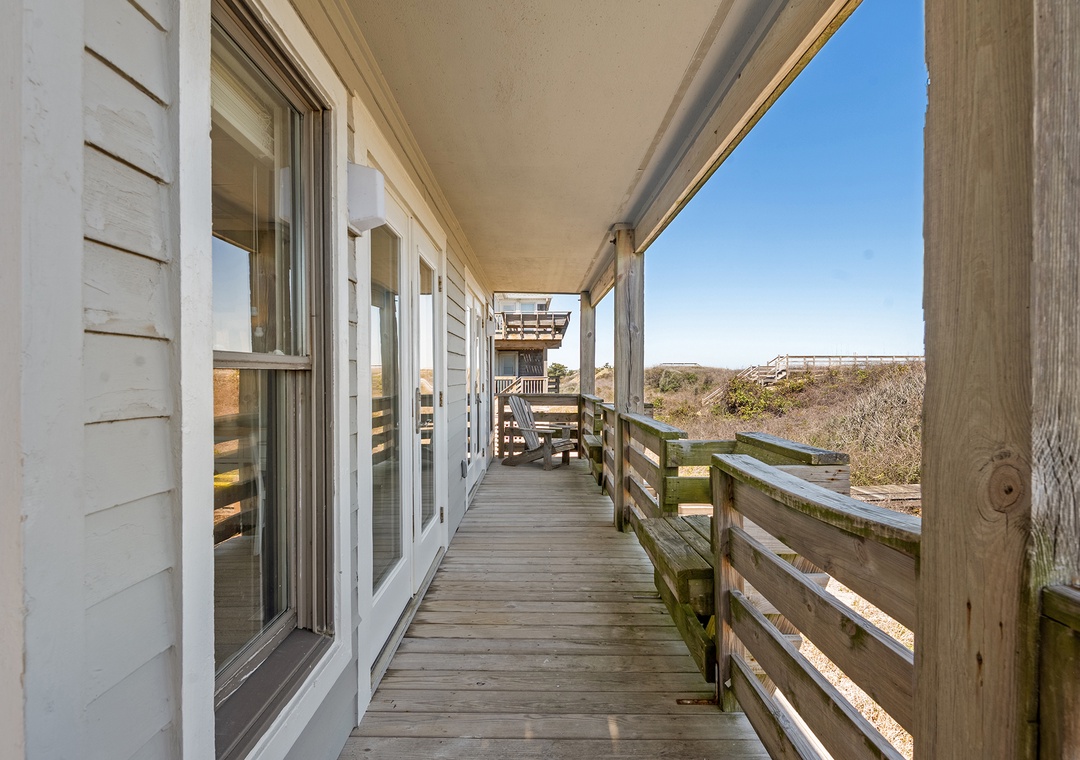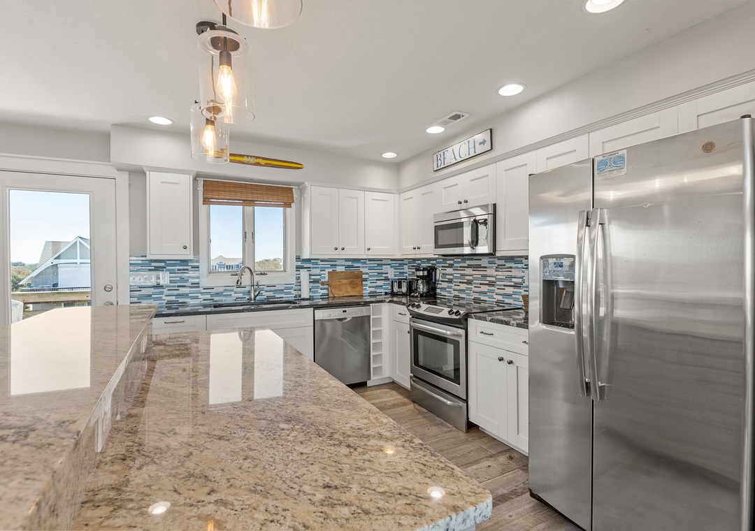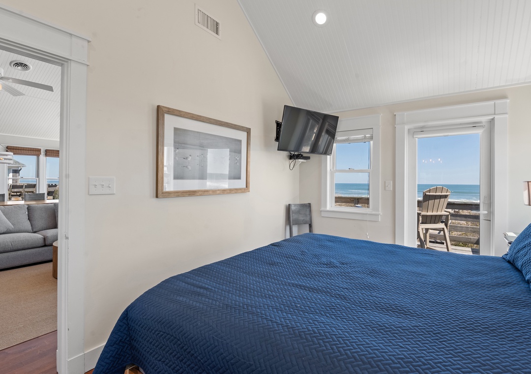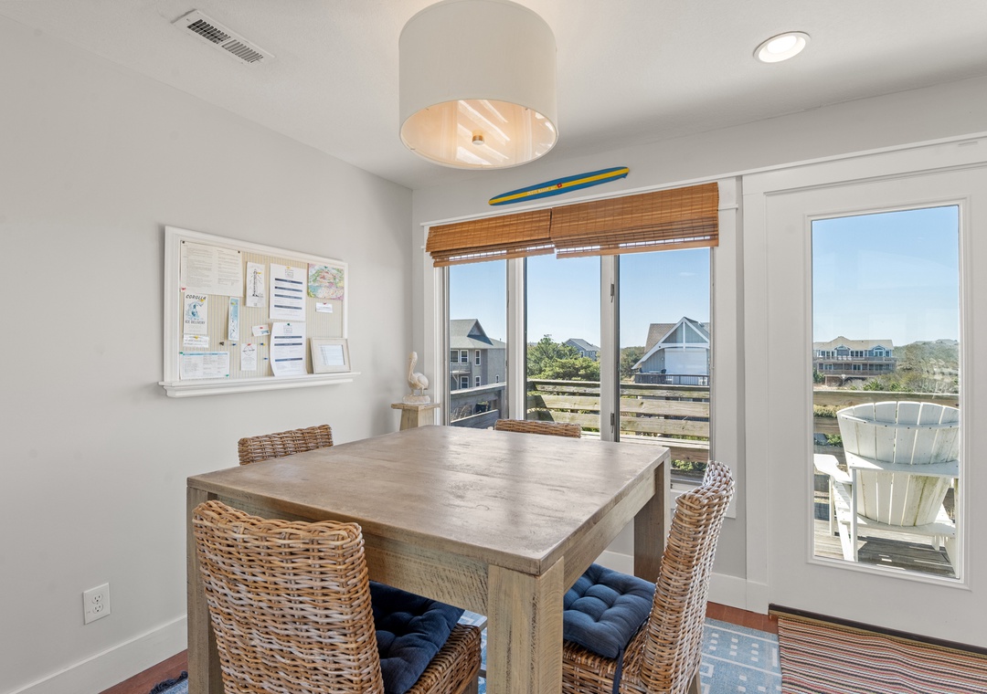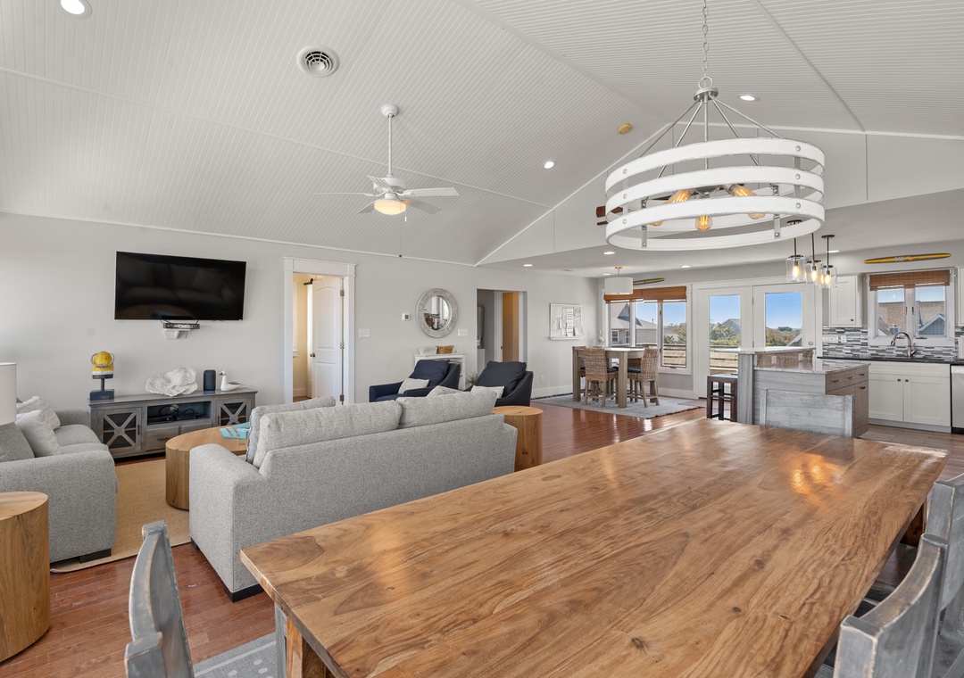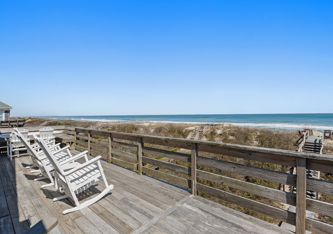 The top‑level great room is all about the water, with floor‑to‑ceiling windows and an open layout that keep the Atlantic in view from the sofa, dining table, and kitchen. Cook and connect in the well‑equipped kitchen featuring stainless‑steel appliances and an island with breakfast bar, then linger over meals while waves roll in just beyond the glass. Step out to the upper deck to sip morning coffee, feel the salt breeze, and watch dolphins cruise by just beyond the dunes.