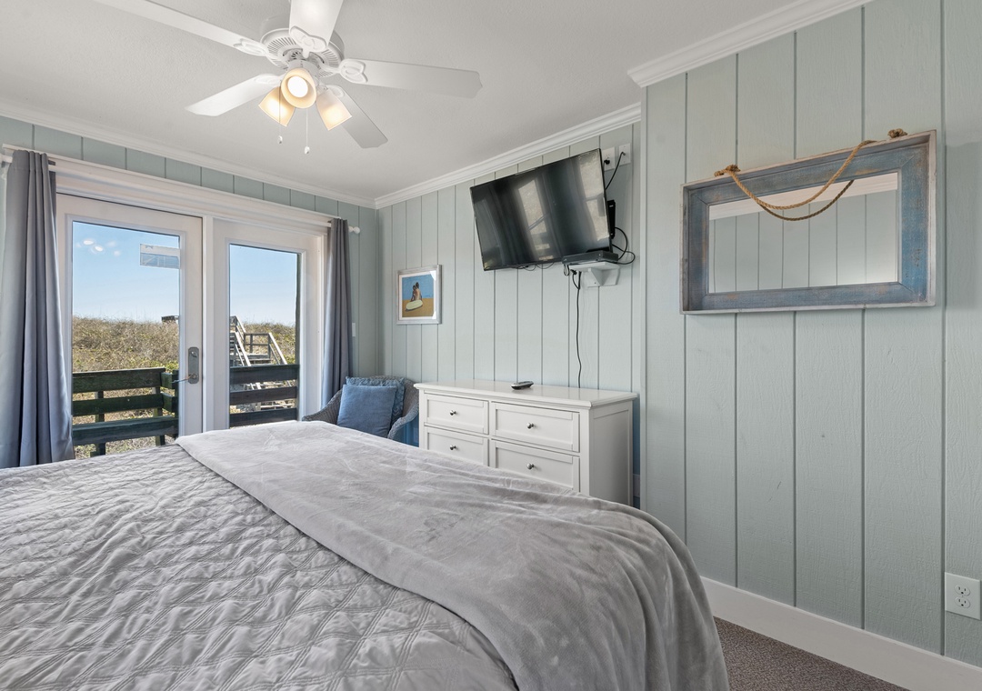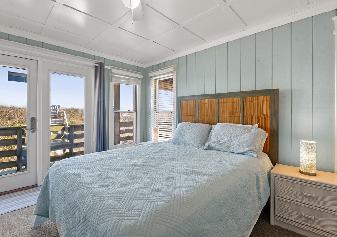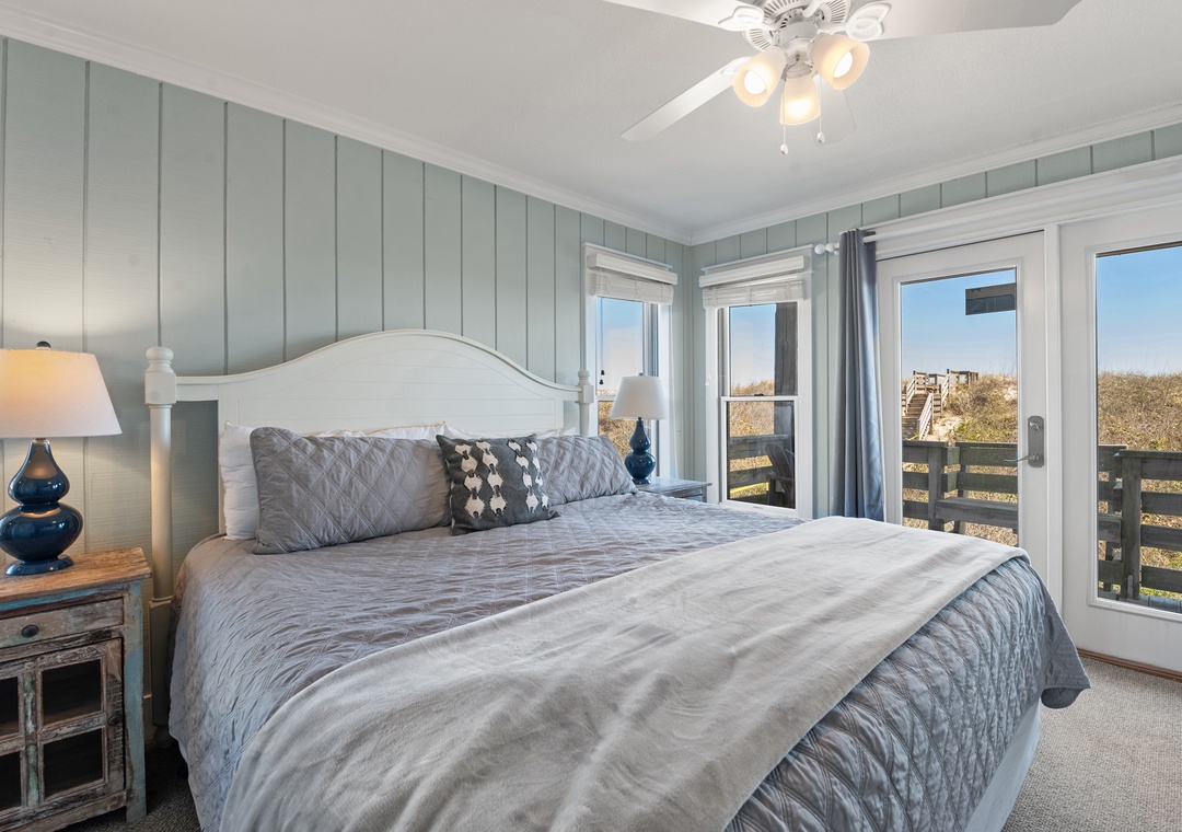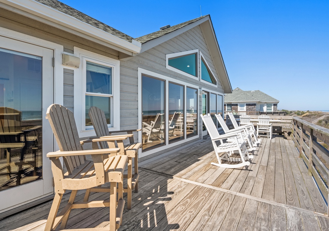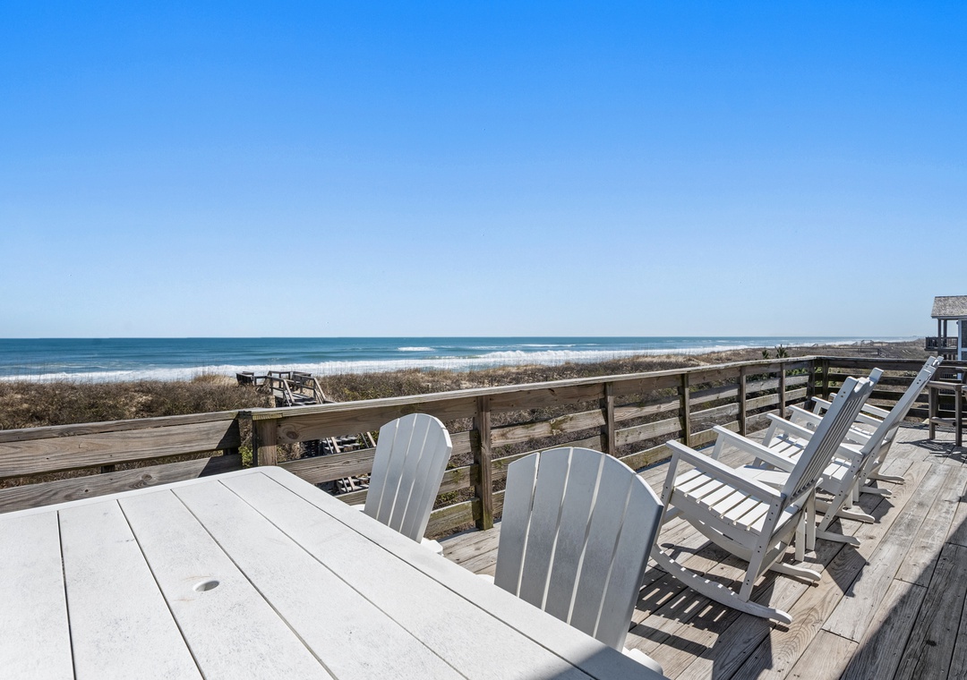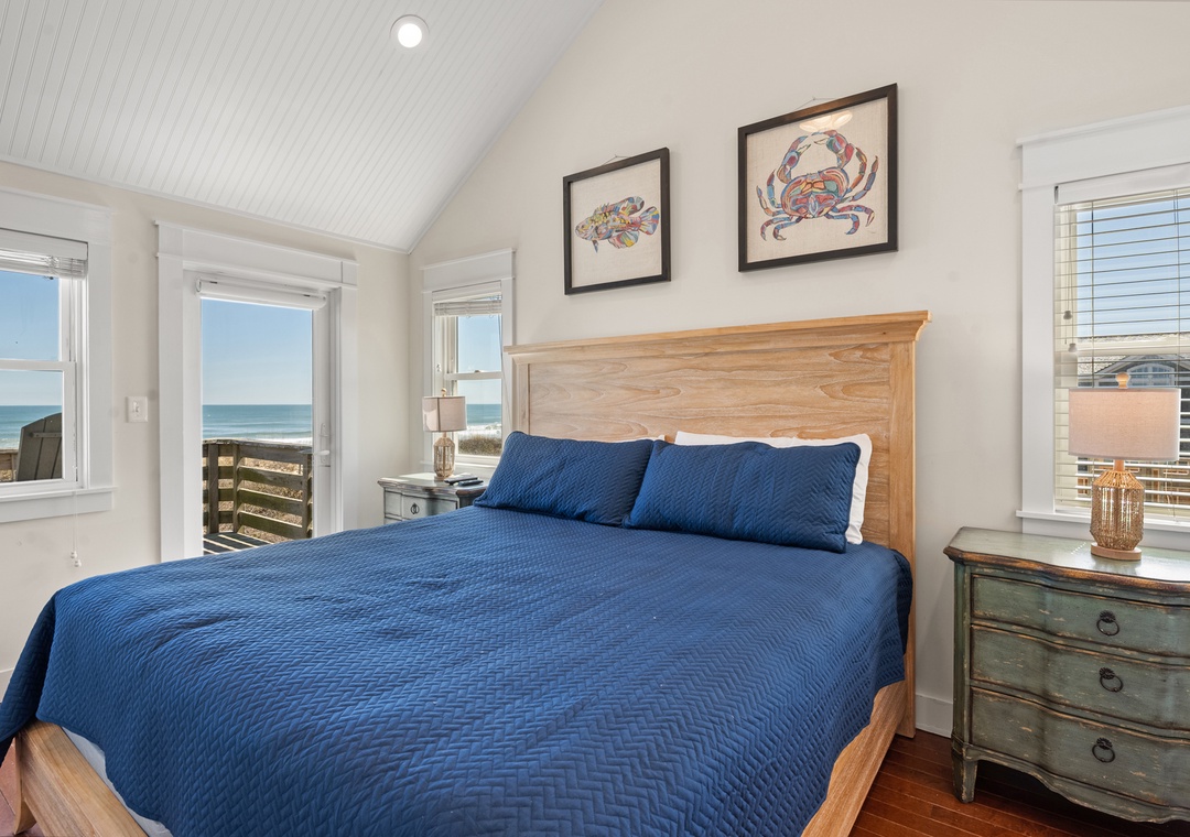 The top‑level great room is all about the water, with floor‑to‑ceiling windows and an open layout that keep the Atlantic in view from the sofa, dining table, and kitchen. Cook and connect in the well‑equipped kitchen featuring stainless‑steel appliances and an island with breakfast bar, then linger over meals while waves roll in just beyond the glass. Step out to the upper deck to sip morning coffee, feel the salt breeze, and watch dolphins cruise by just beyond the dunes.