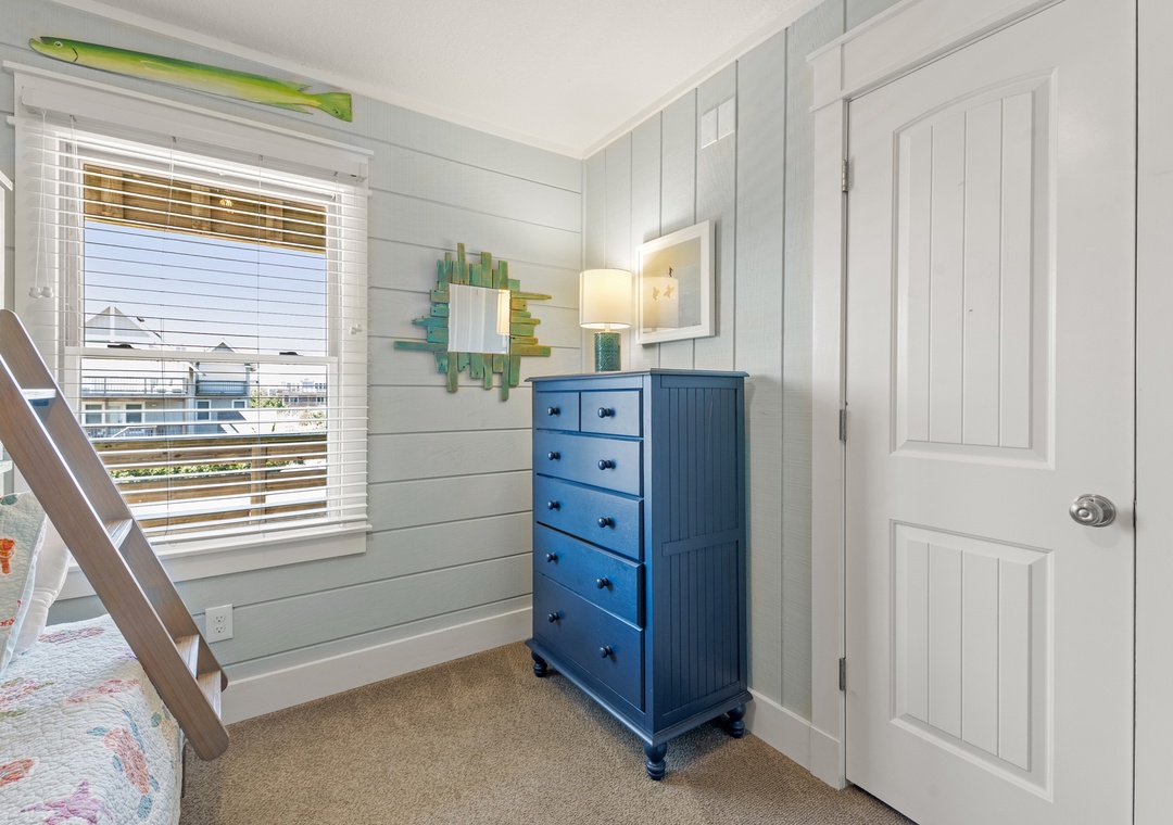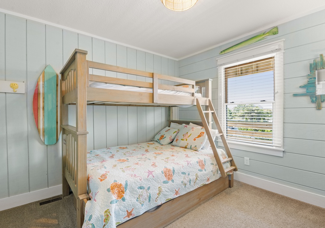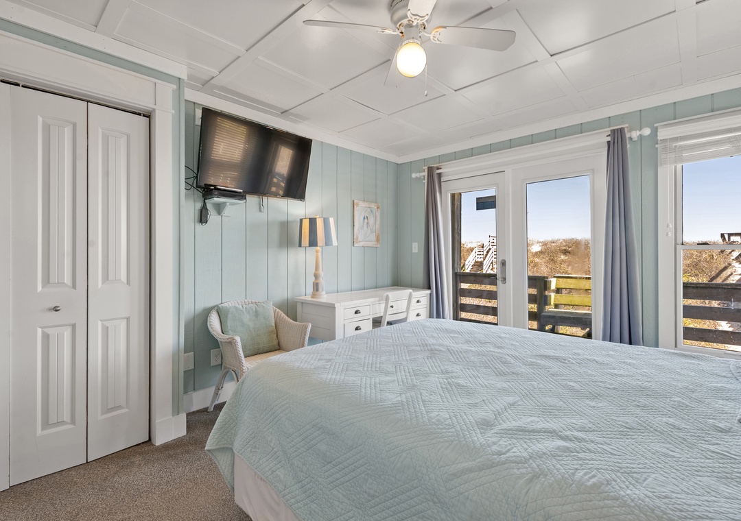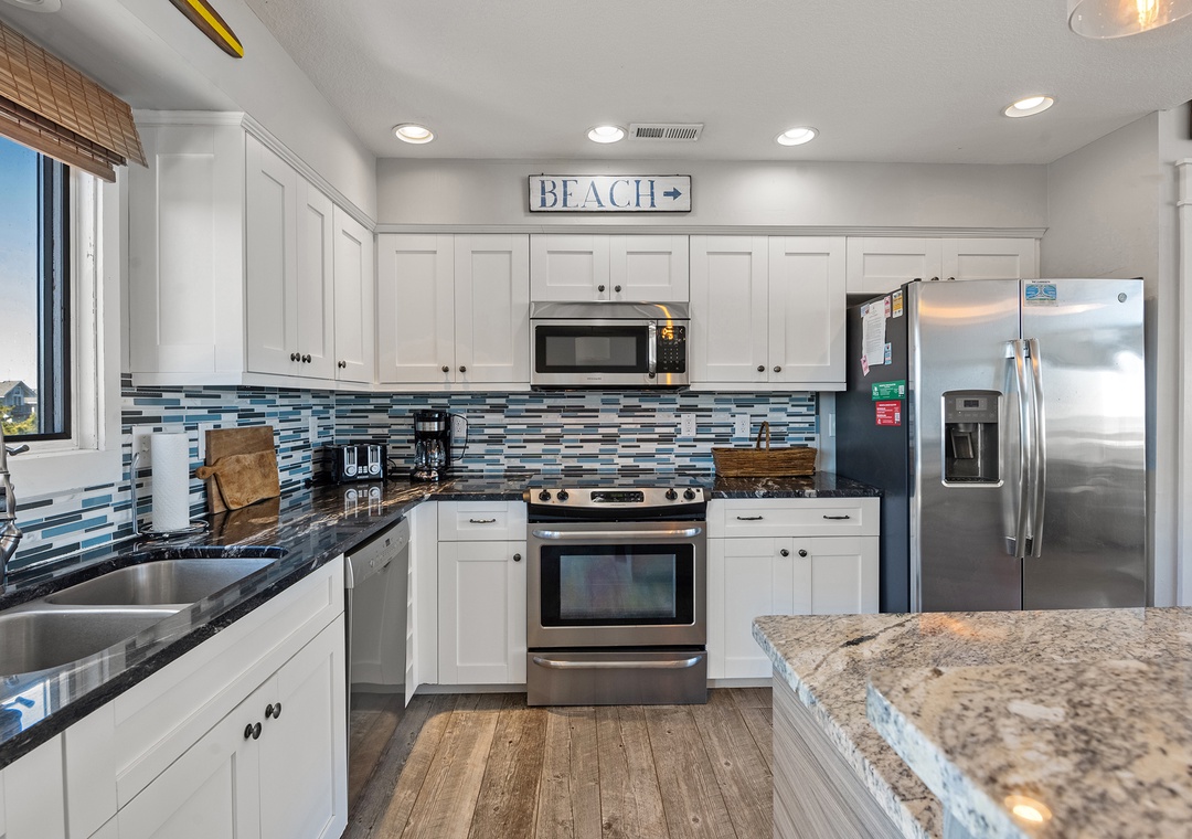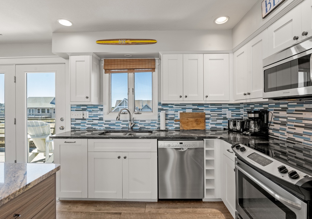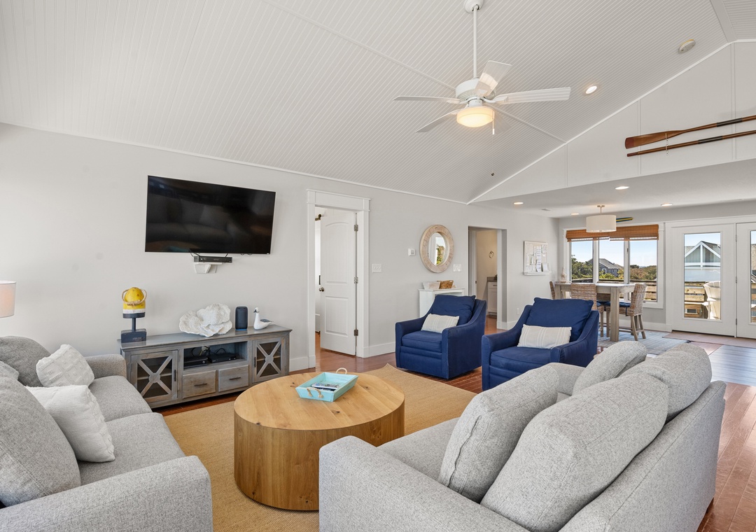 The top‑level great room is all about the water, with floor‑to‑ceiling windows and an open layout that keep the Atlantic in view from the sofa, dining table, and kitchen. Cook and connect in the well‑equipped kitchen featuring stainless‑steel appliances and an island with breakfast bar, then linger over meals while waves roll in just beyond the glass. Step out to the upper deck to sip morning coffee, feel the salt breeze, and watch dolphins cruise by just beyond the dunes.
