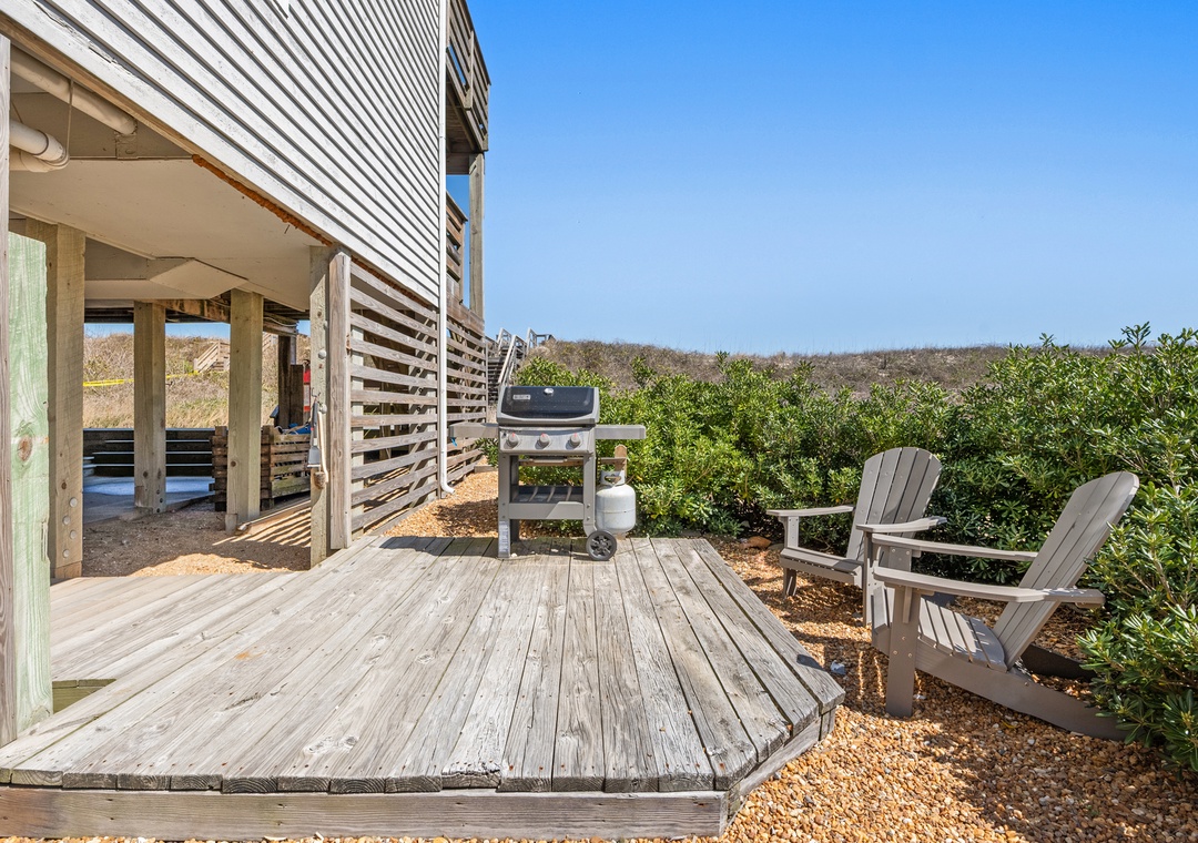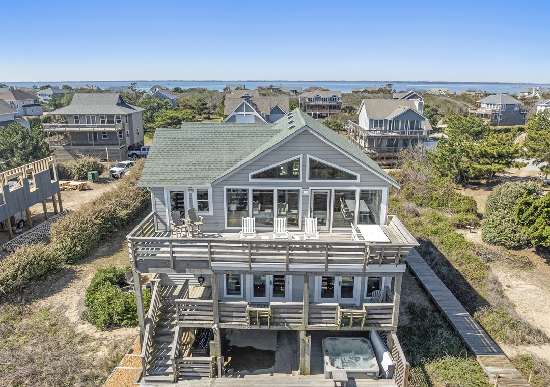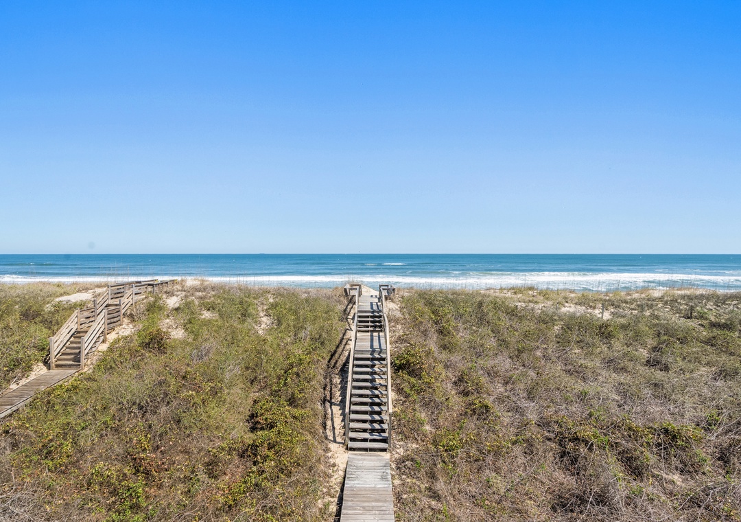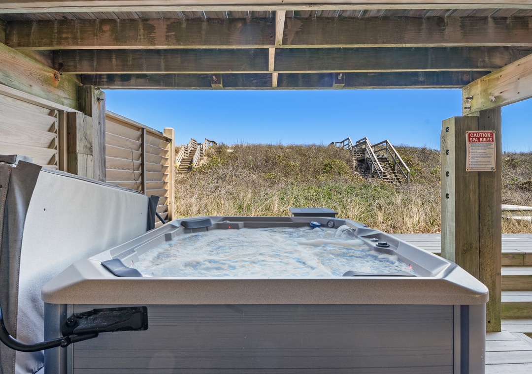 Three levels of east‑facing decks provide tons of outdoor living space, from shaded lounging spots to sunny perches perfect for reading, napping, or dolphin watching. Follow the private walkway over the dunes to the wide sandy beach, where you’ll find room to spread out, hunt for shells and sea glass, and enjoy long walks along the shoreline. After a day on the sand, head down to the ground‑level patio where a private hot tub sits tucked beneath the house, offering a sheltered spot to soak and unwind while still listening to the waves. An outdoor shower and ground‑level storage keep sand and gear organized when you come back in.