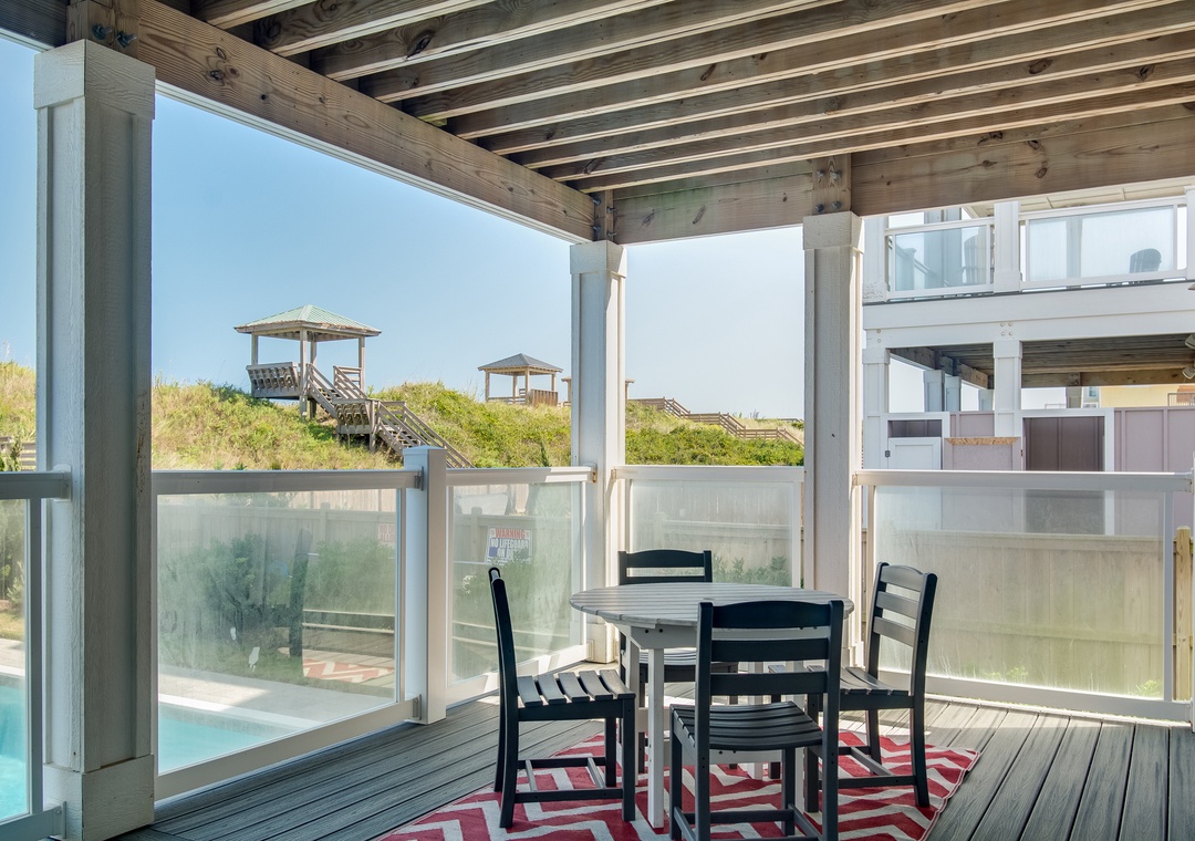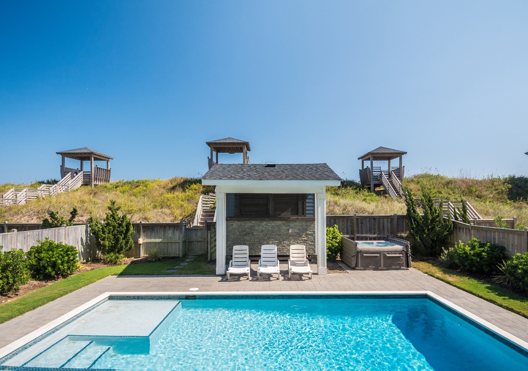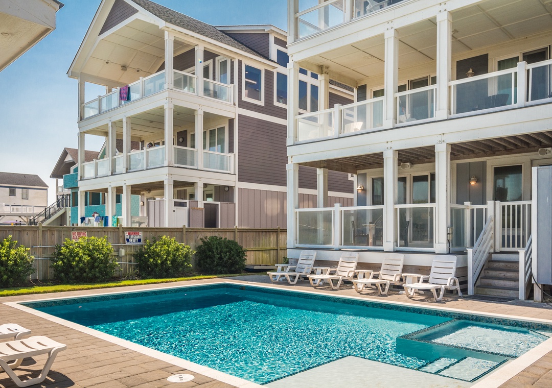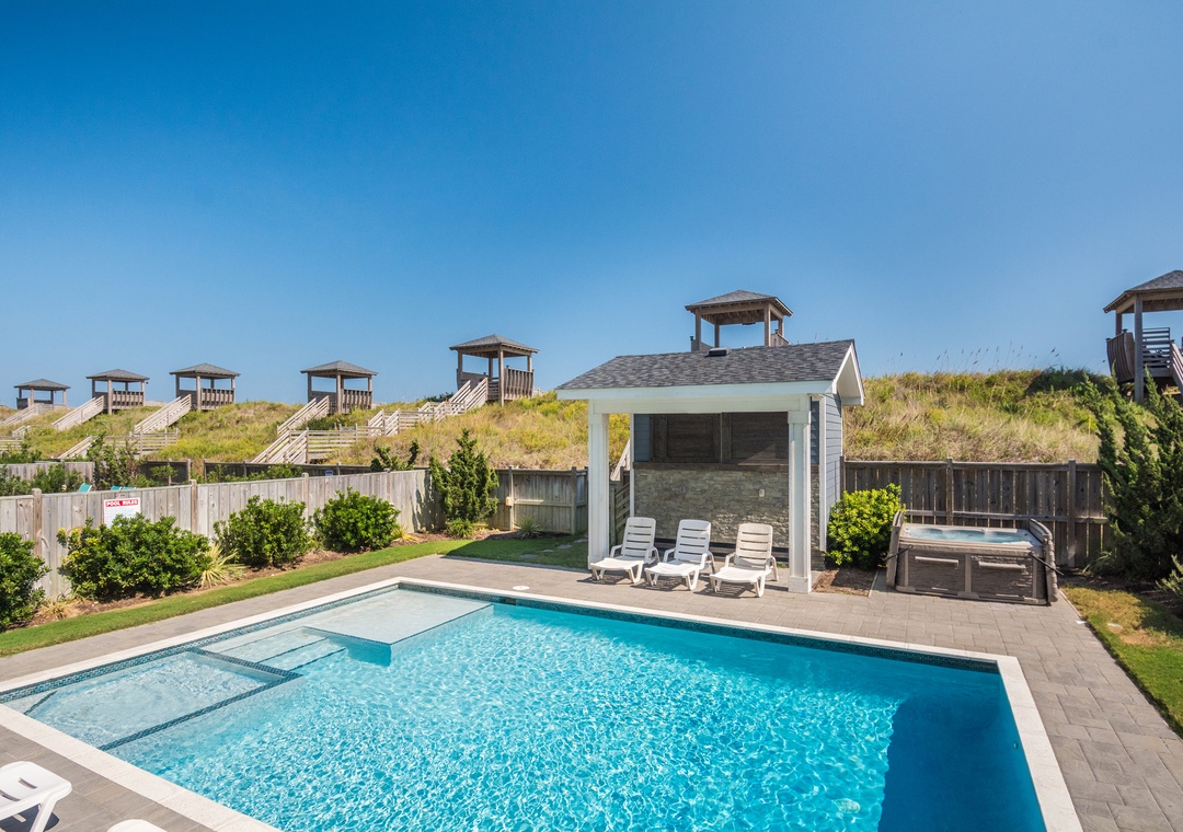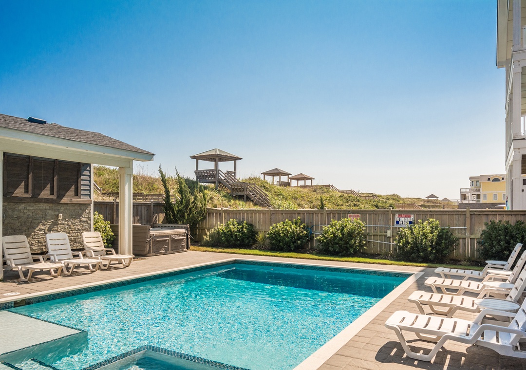 Head to the beautiful Nags Head beach on your private walkway with a covered dune top deck and after you have spent a fun day at the beach you can relax in your own private 28 x 18 pool or hot tub.