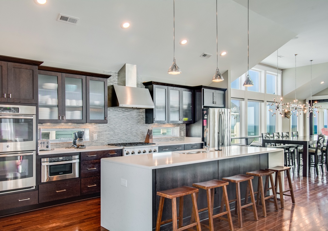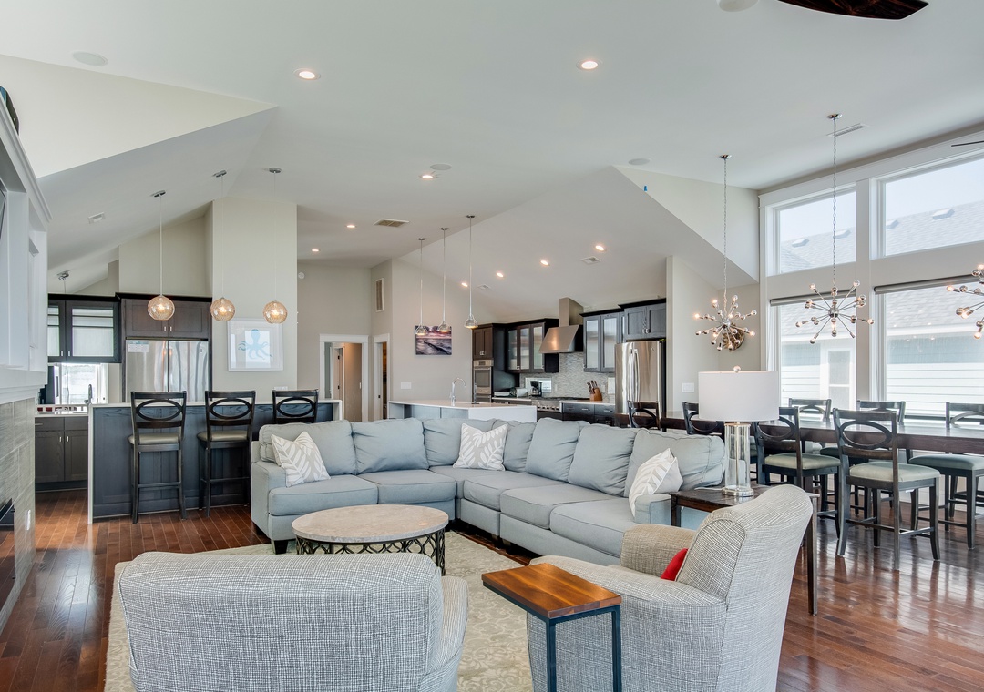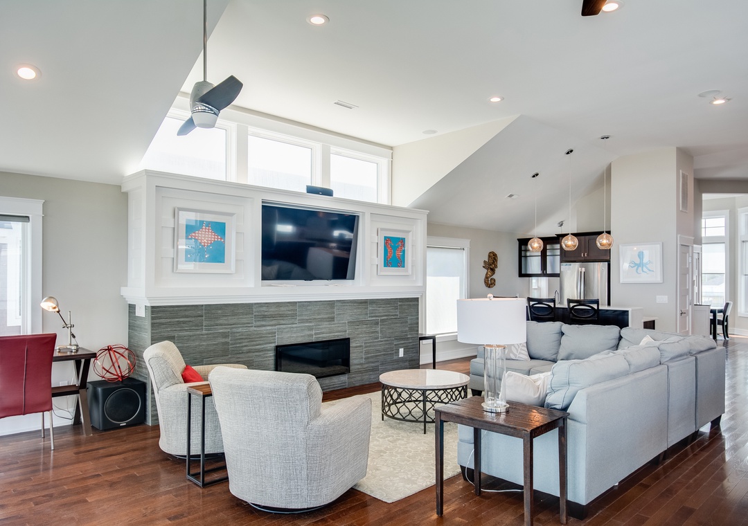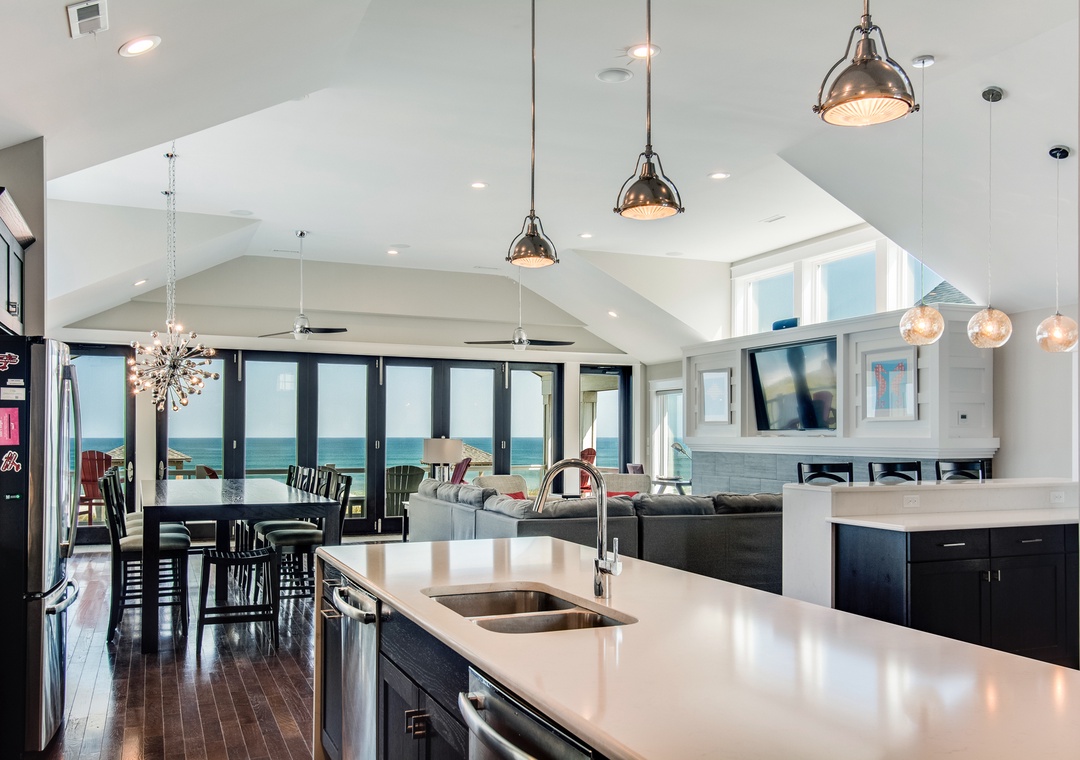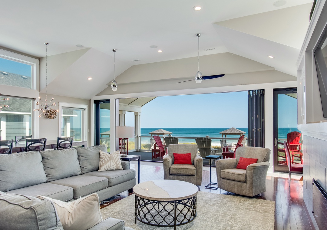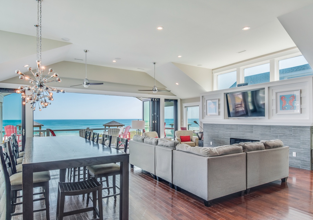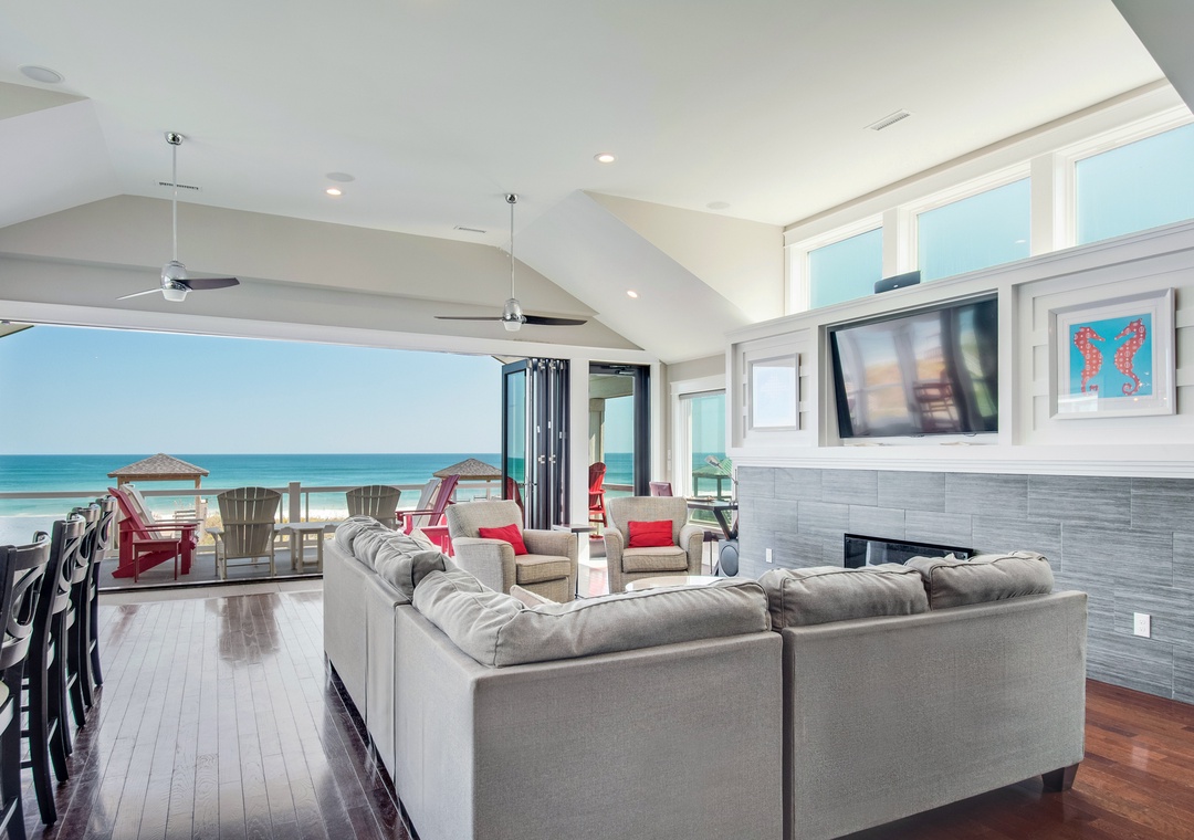 Go Your Own Wave is an elite oceanfront paradise, and perfect for family, friends and large groups. This home holds everything needed for an unforgettable OBX vacation. The great room is the heart of the home and is a great space to enjoy quality time with the whole crew. Fully retractable glass doors open the main living area to the top-level deck overlooking the pool and ocean for seamless indoor/outdoor living. Curl up on the couch in front of the fireplace, enjoy some tasty meals prepared in the well-appointed kitchen and there’s plenty of dining space with the main dining area and a breakfast nook with a fireplace.