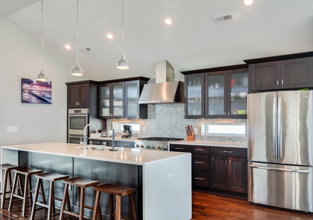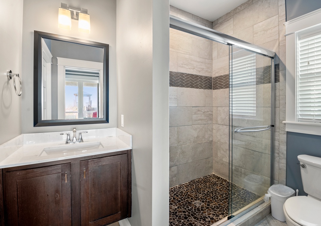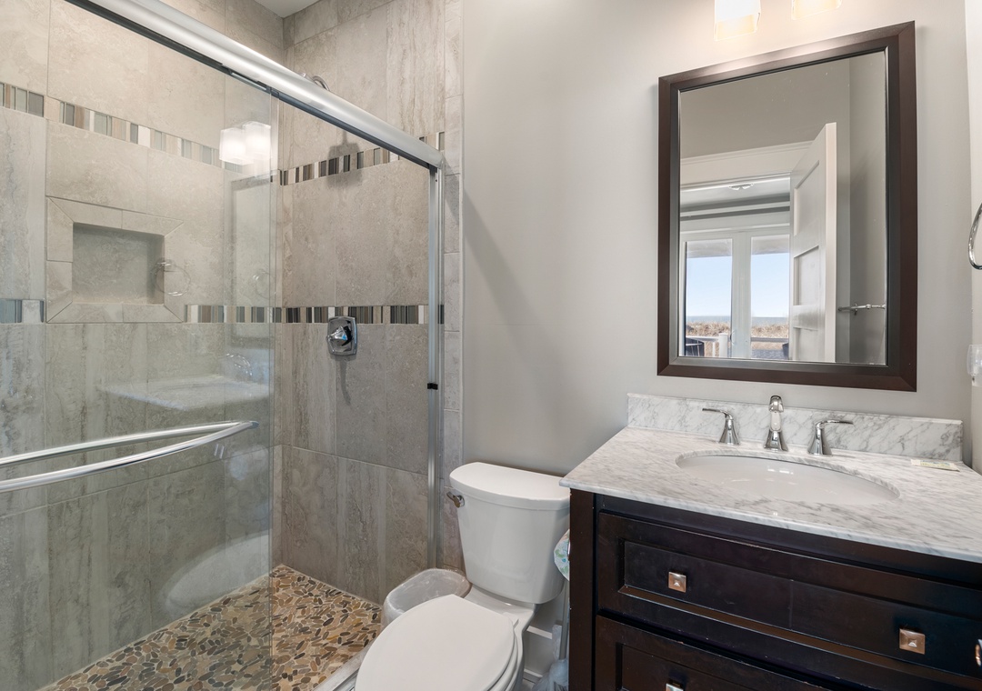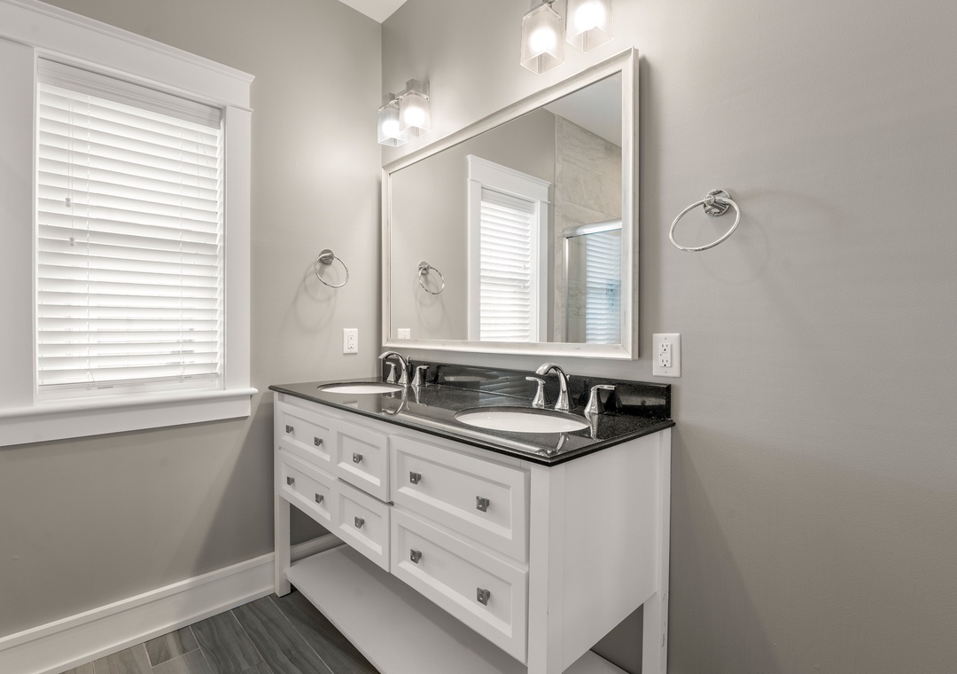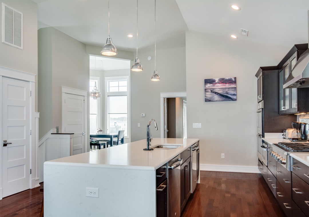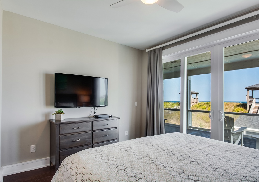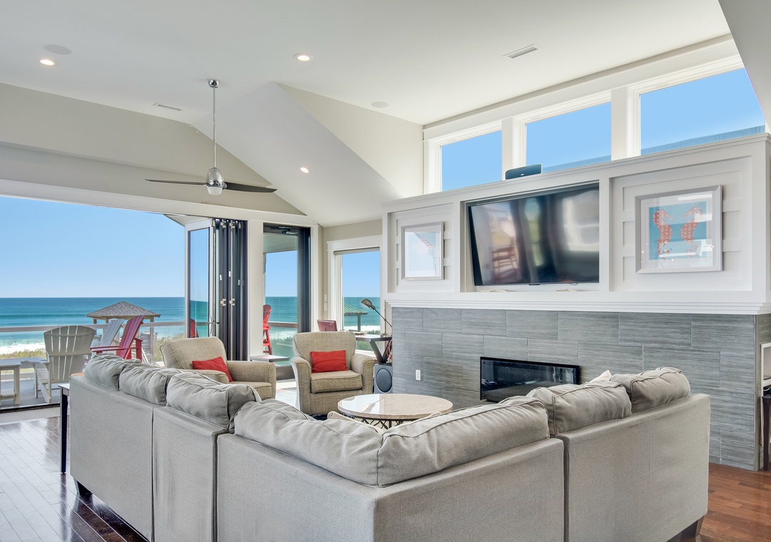 Go Your Own Wave is an elite oceanfront paradise, and perfect for family, friends and large groups. This home holds everything needed for an unforgettable OBX vacation. The great room is the heart of the home and is a great space to enjoy quality time with the whole crew. Fully retractable glass doors open the main living area to the top-level deck overlooking the pool and ocean for seamless indoor/outdoor living. Curl up on the couch in front of the fireplace, enjoy some tasty meals prepared in the well-appointed kitchen and there’s plenty of dining space with the main dining area and a breakfast nook with a fireplace.
