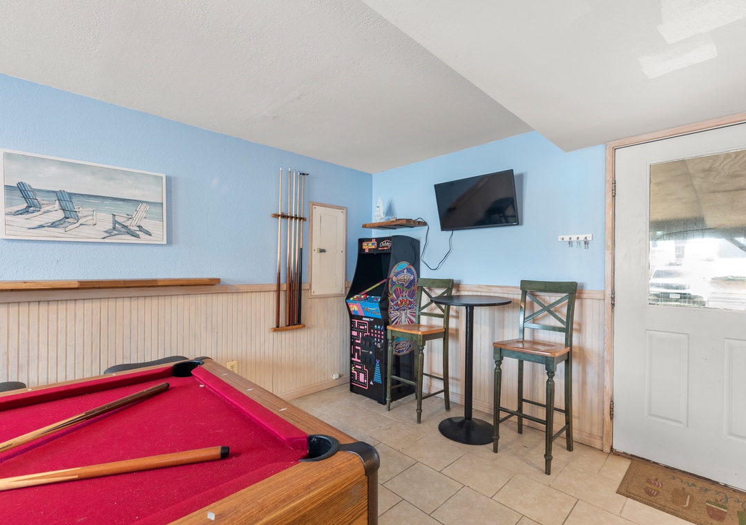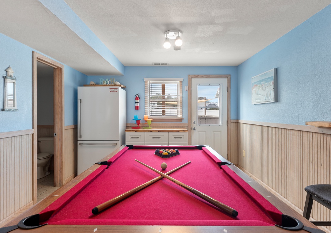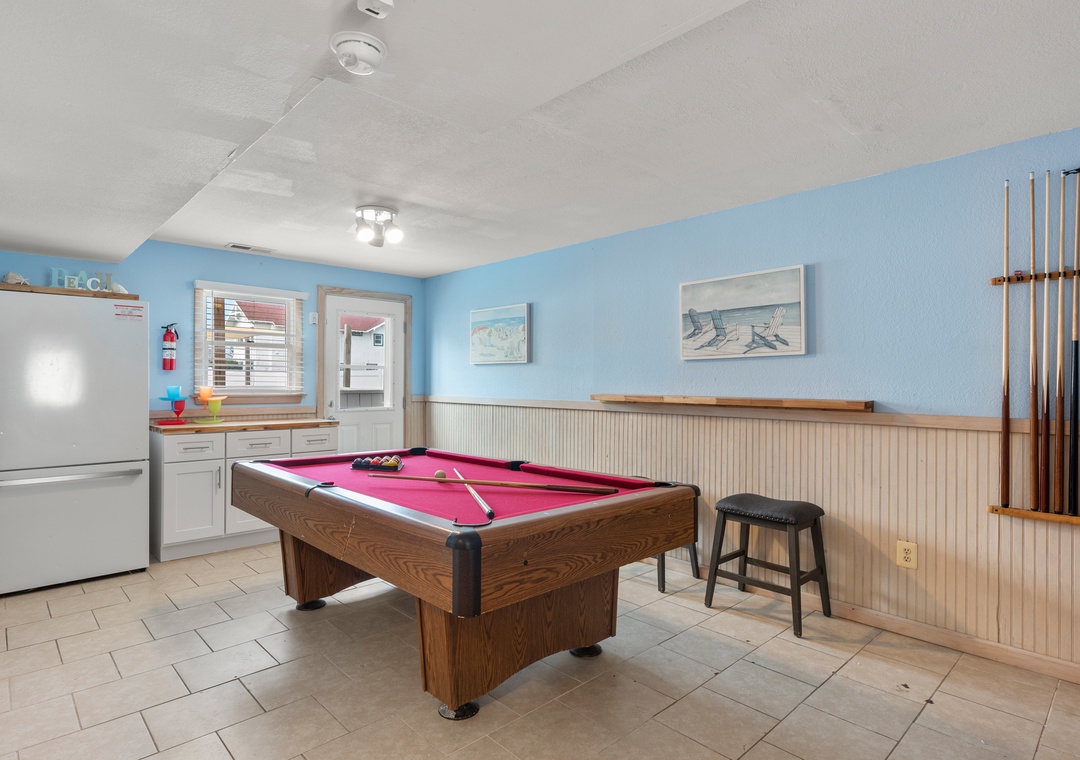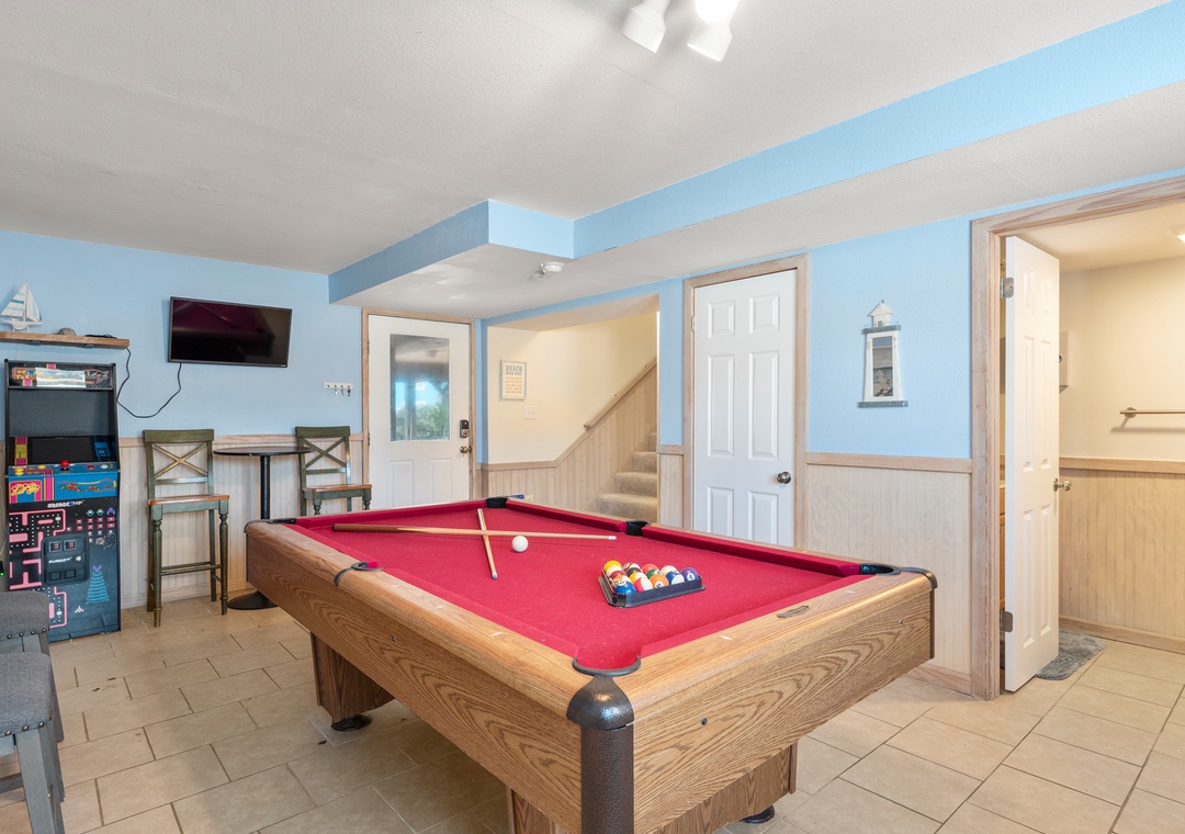 Just off the living area you'll find a queen bedroom with a fully remodeled semi-private bath. Three more bedrooms are located together on the mid-level, including the queen ensuite with deck access for waking up to a coastal breeze. The ground level is dedicated to indoor entertainment, featuring a rec room furnished with a pool table and arcade game. It includes a full-size fridge for convenient drinks and snacks and direct access to the pool area. A fully fenced-in backyard is perfect for kids and yard games.