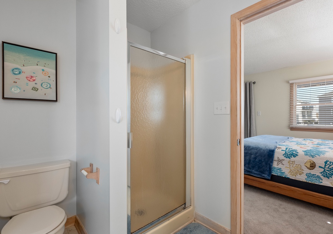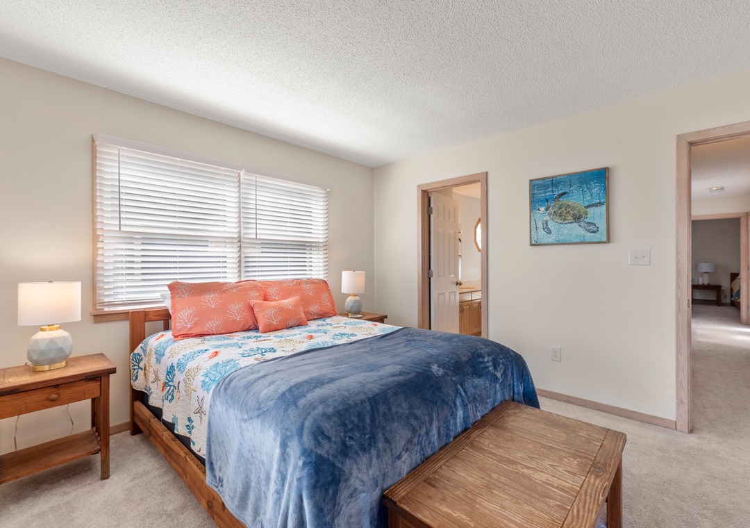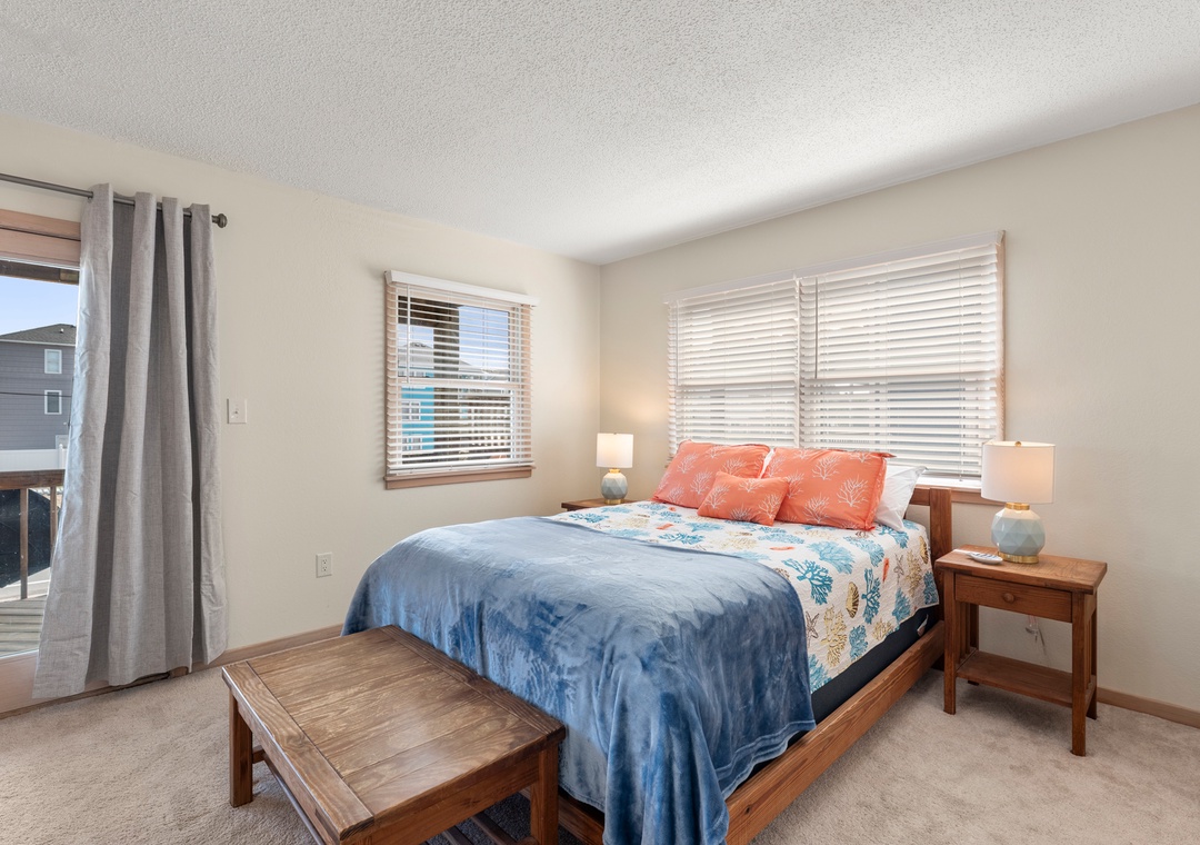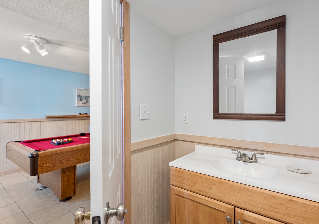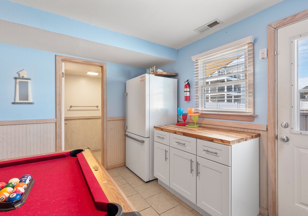Just off the living area you'll find a queen bedroom with a fully remodeled semi-private bath. Three more bedrooms are located together on the mid-level, including the queen ensuite with deck access for waking up to a coastal breeze. The ground level is dedicated to indoor entertainment, featuring a rec room furnished with a pool table and arcade game. It includes a full-size fridge for convenient drinks and snacks and direct access to the pool area. A fully fenced-in backyard is perfect for kids and yard games.