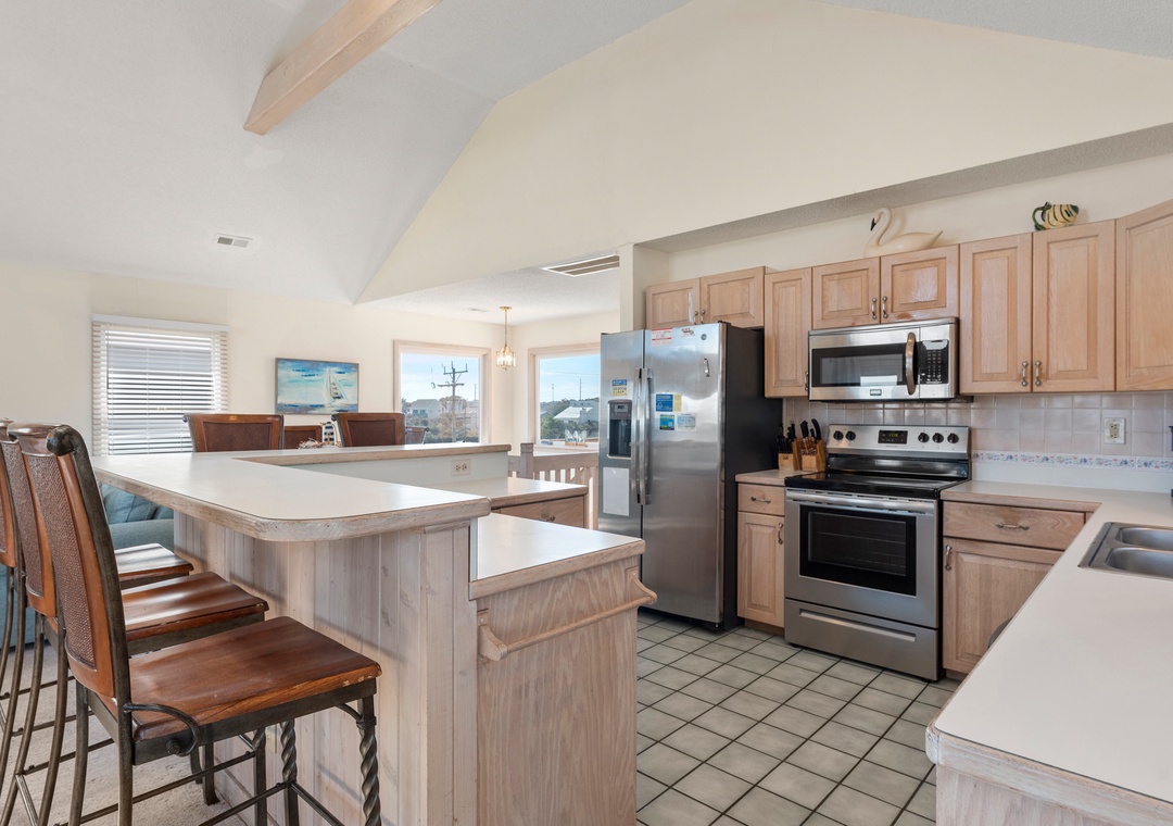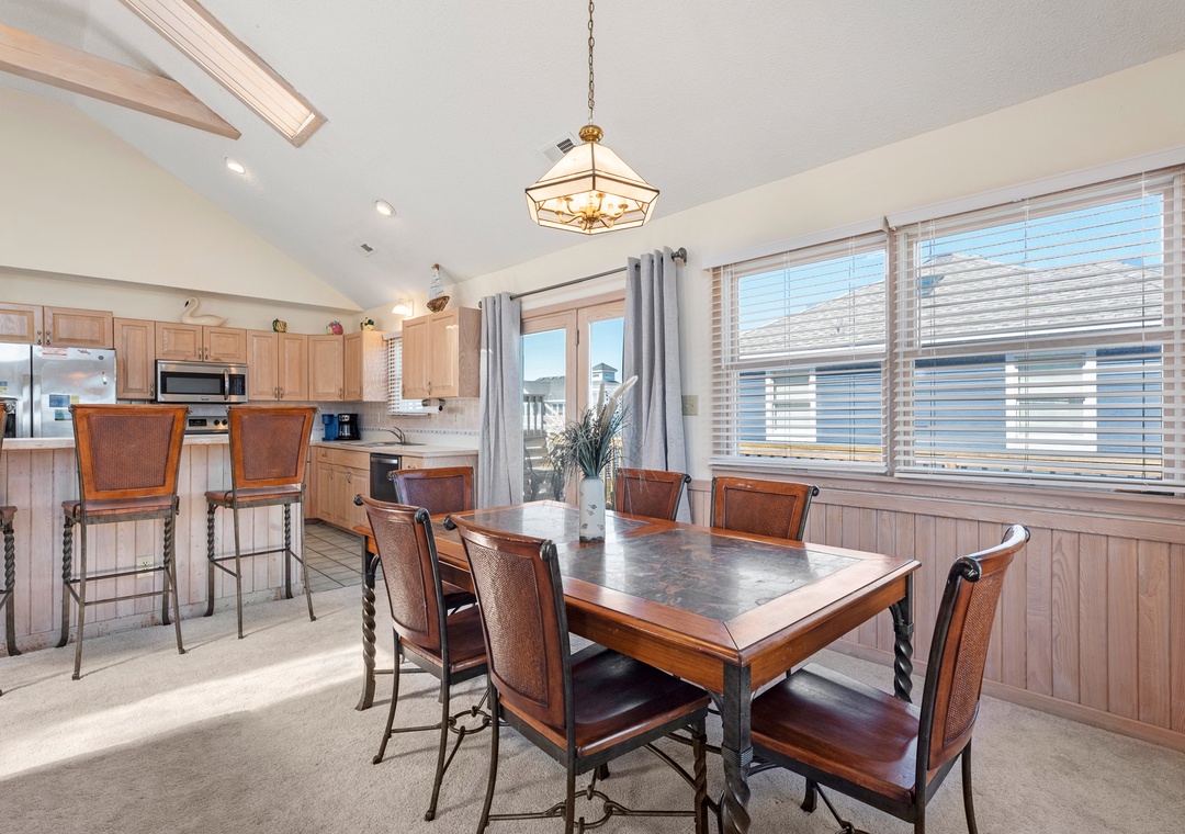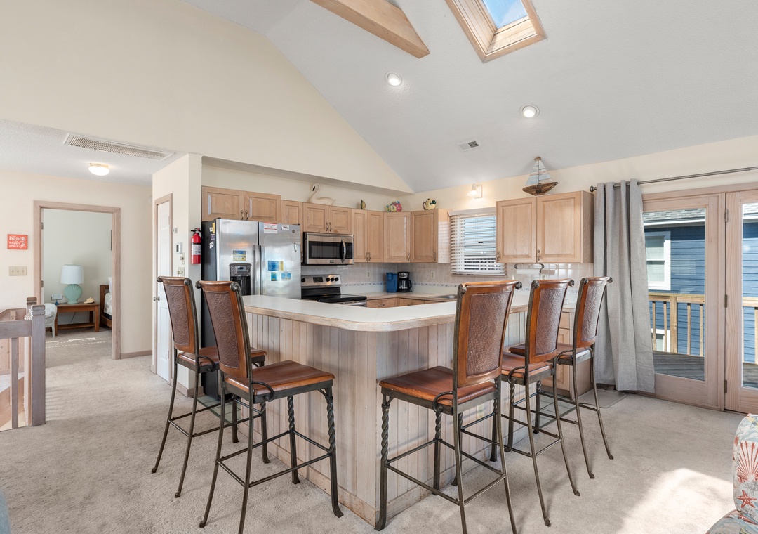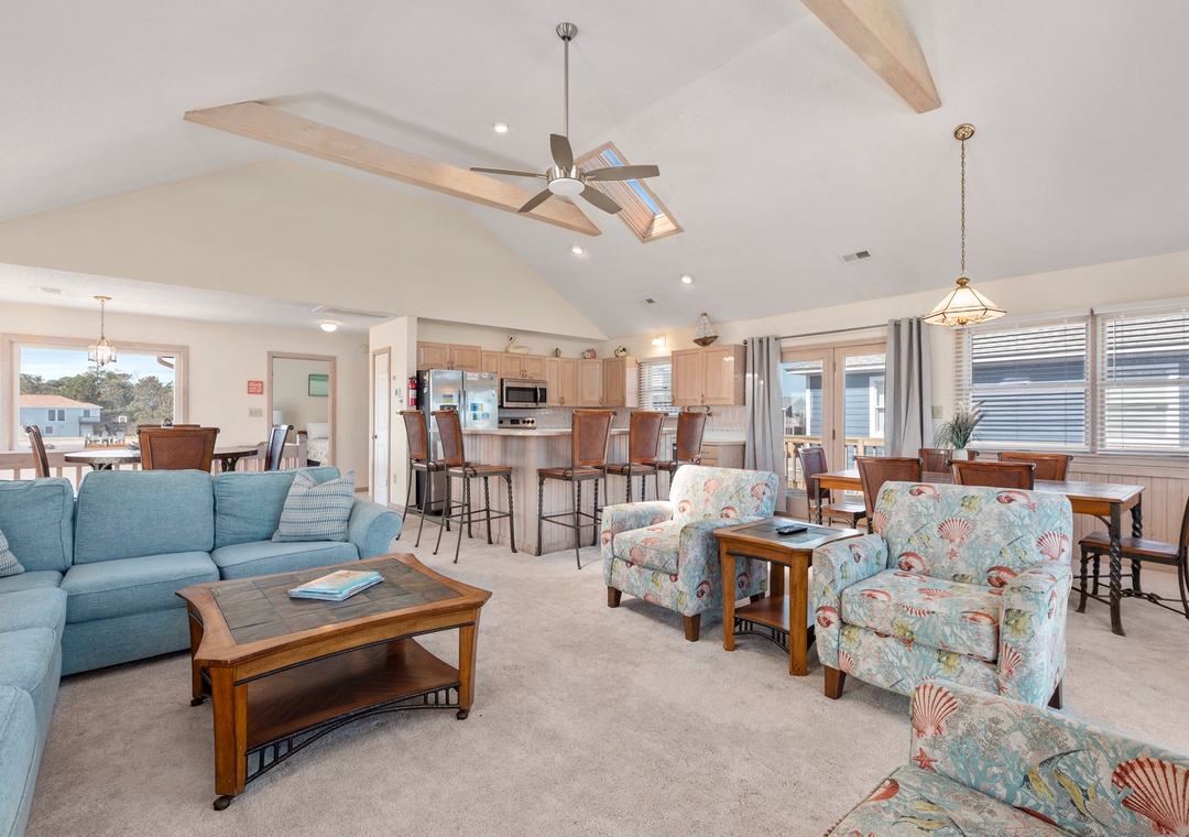 Island State of Mind is a charming semi-oceanfront home in Nags Head situated just 300ft from the Gallery Row public beach access. After a day of sun, sand and surf, the outdoor fun continues back at the house where you can splash in the private pool or take a relaxing soak in the bubbly hot tub. The great room offers plenty of comfortable seating plus an open-concept layout for quality time spent with loved ones. It leads out to an expansive sun deck for effortless indoor/outdoor living and your daily dose of Vitamin D. Back inside, vaulted ceilings and skylights create a bright and casual space with abundant natural light. The chef in the family will appreciate the well-equipped kitchen with stainless steel appliances and bar seating.