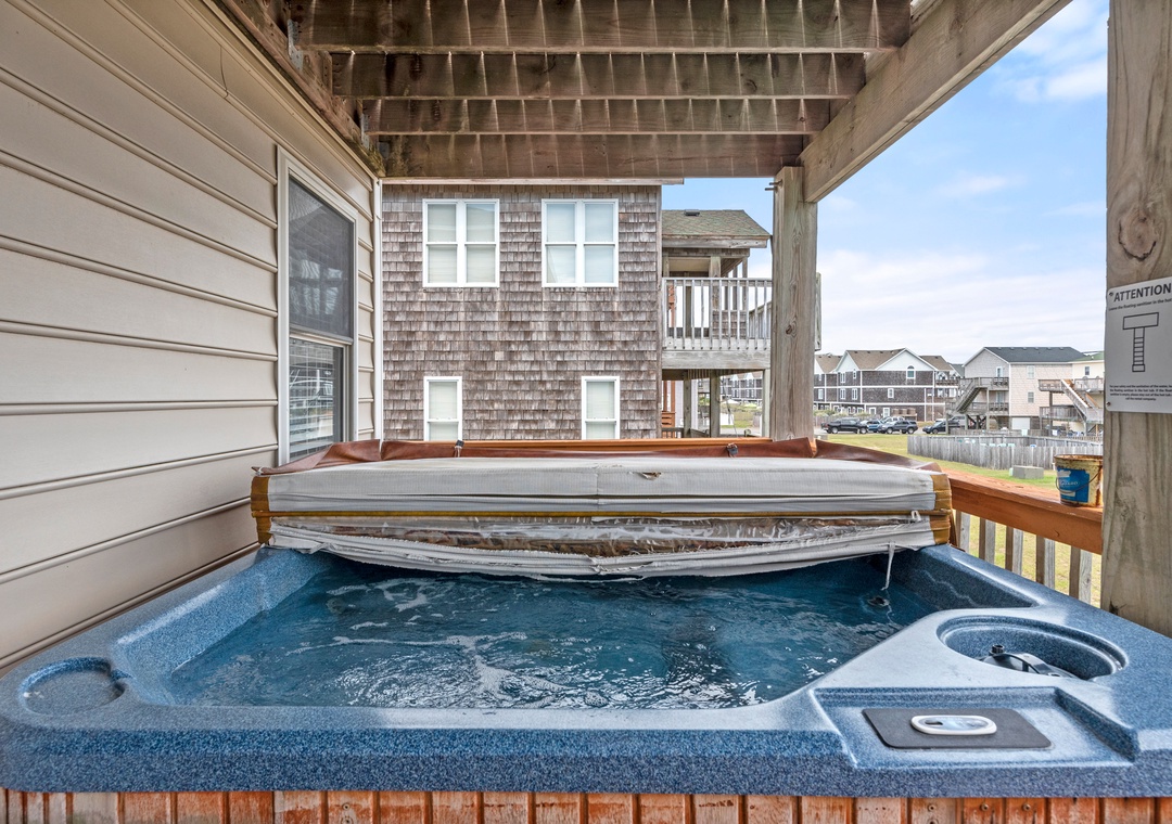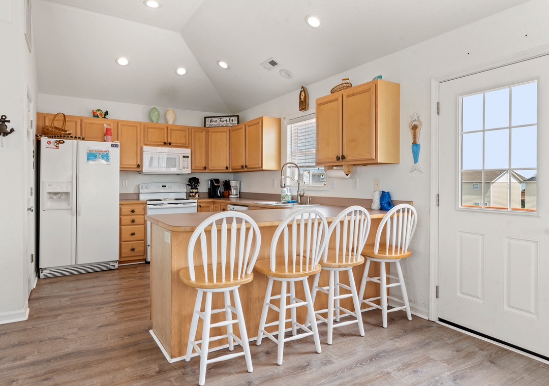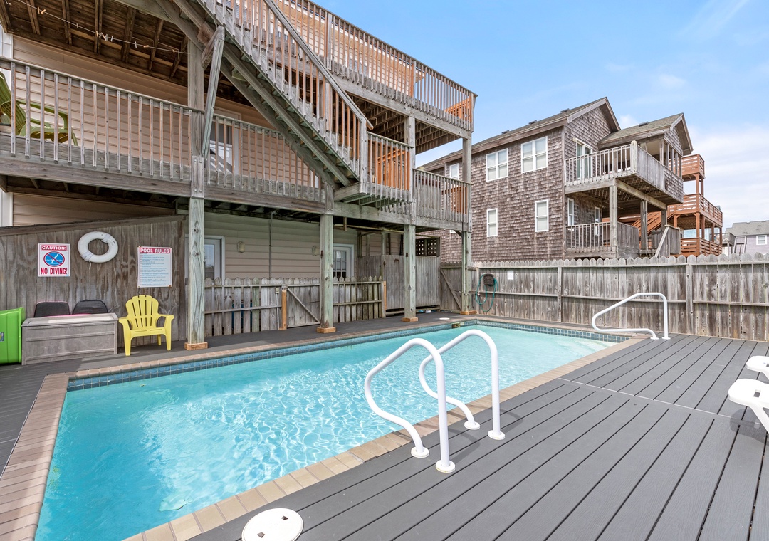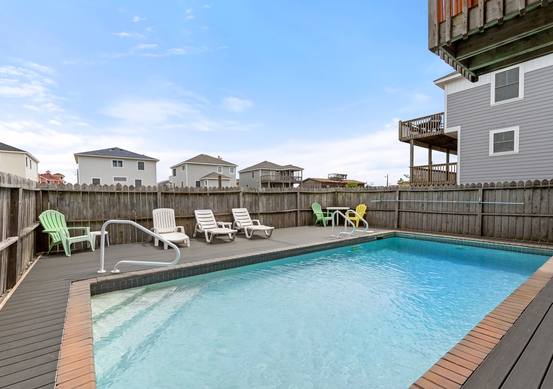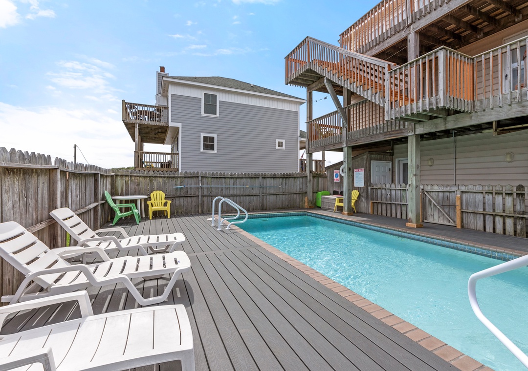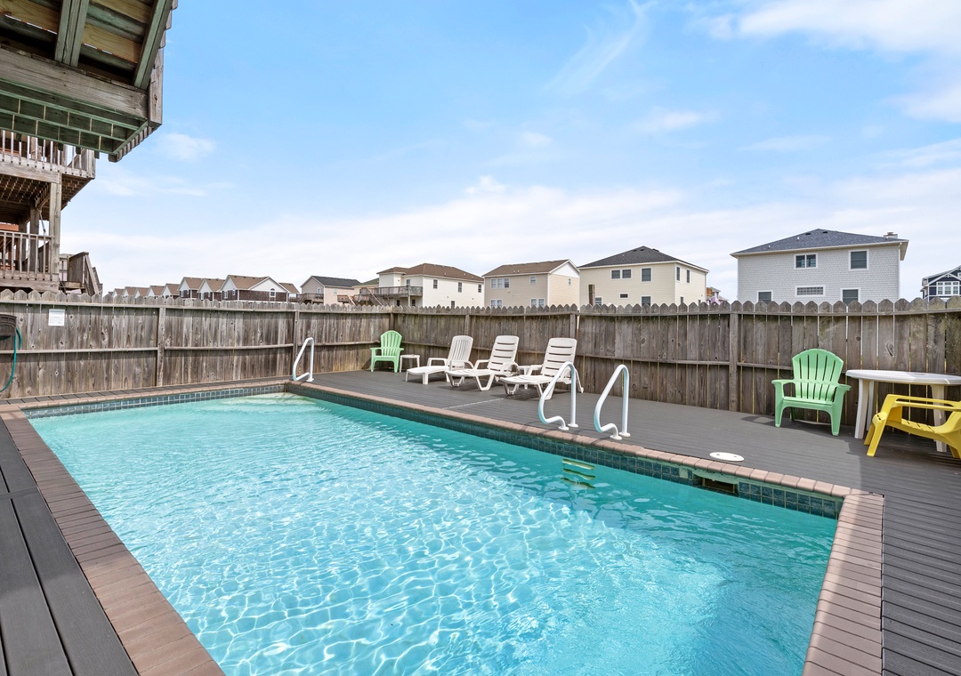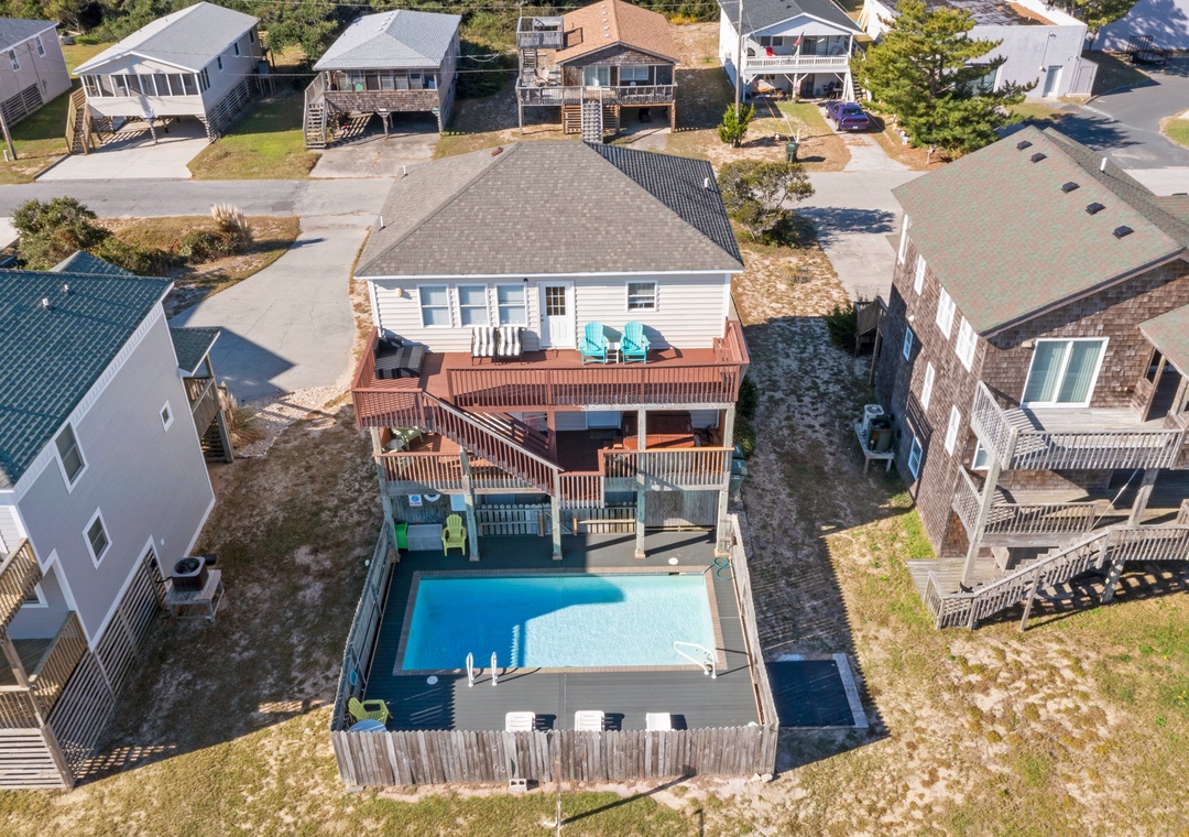 Centrally located at Milepost 11 in Nags Head, Beach Bum'n is just a short walk to the beach and within a mile radius of everything you'll need for laid back trip to the OBX. This thoughtfully furnished, abundantly stocked, and well-maintained oceanside home was designed with vacationers in mind. A bright and airy great room is located on the top level, featuring stylish and beach-friendly LVP flooring throughout. The open-concept layout is perfect for catching up with family and friends, even while preparing meals. All three bedrooms on the mid-level feature private baths, making Beach Bum'n ideal for larger groups or multiple families traveling together. Two of the bedrooms open up onto a covered deck with hot tub that overlooks the pool area below. Downstairs, there are two more bedrooms, one of which is a fourth ensuite. A game room, with pool table and vintage pinball machine, is the perfect hang-out space and offers direct access to the pool area for effortless indoor/outdoor living. Take advantage of the wet bar with full-size refrigerator for convenient drinks and snacks without having to go upstairs. When you're not at the beach, your family will love having their own private pool right in the backyard.