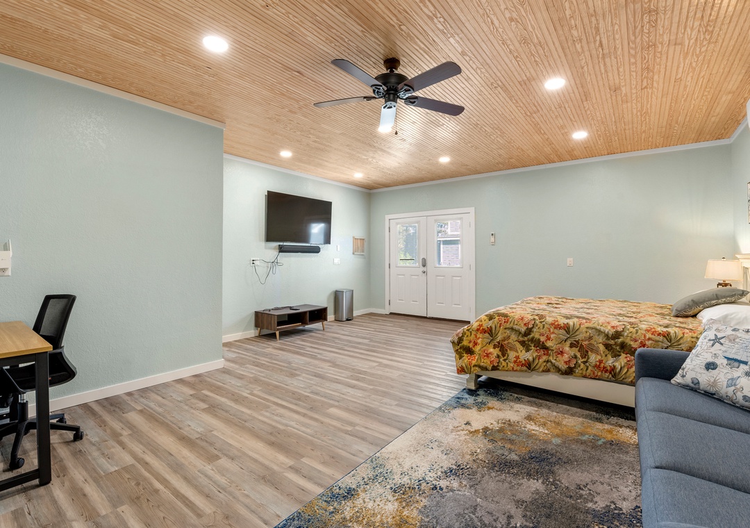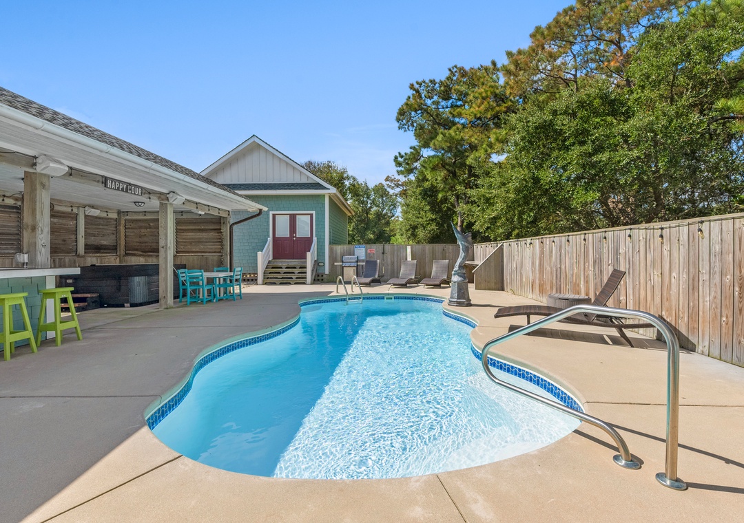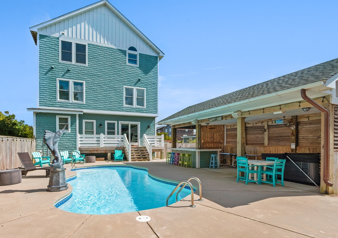The media room is spacious enough to be used as a second living area. Curl up on the large sectional in front of the 82-inch TV with Surround Sound and watch a movie or the big game. The ground level wet bar with full-size fridge along with direct access to the pool area is perfect for cookouts and keeping the poolside tiki bar well-stocked. Just outside, the backyard oasis is where the good times will continue after a day at the beach. Put your Beach House Vibes playlist on repeat using the outdoor speakers. The kids can splash in the pool or play ping pong while you sip on a refreshing margarita at the tiki bar - it is Happy Hour after all! Lounge in the sun or take a soak in the hot tub under the shaded cabana - there are endless ways to treat yourself.