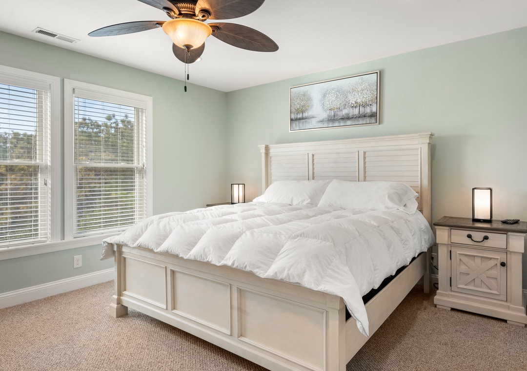 Happy Hour provides families with almost 3,800 square feet of indoor living space, and three of the five bedrooms are king ensuites. The first primary is located on the top level off the main living area and two more are on the mid-level, one of which spans the entire width of the house. This spacious retreat boasts hardwood floors and a private bath with custom tiled walk-in shower. Downstairs, the lower level consists of two more bedrooms that share a full bath. The casita-style pool house with king bed can serve as alternative sleeping arrangements for guests who prefer additional separation and privacy.