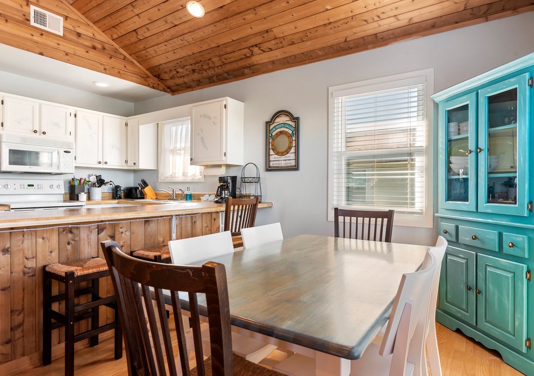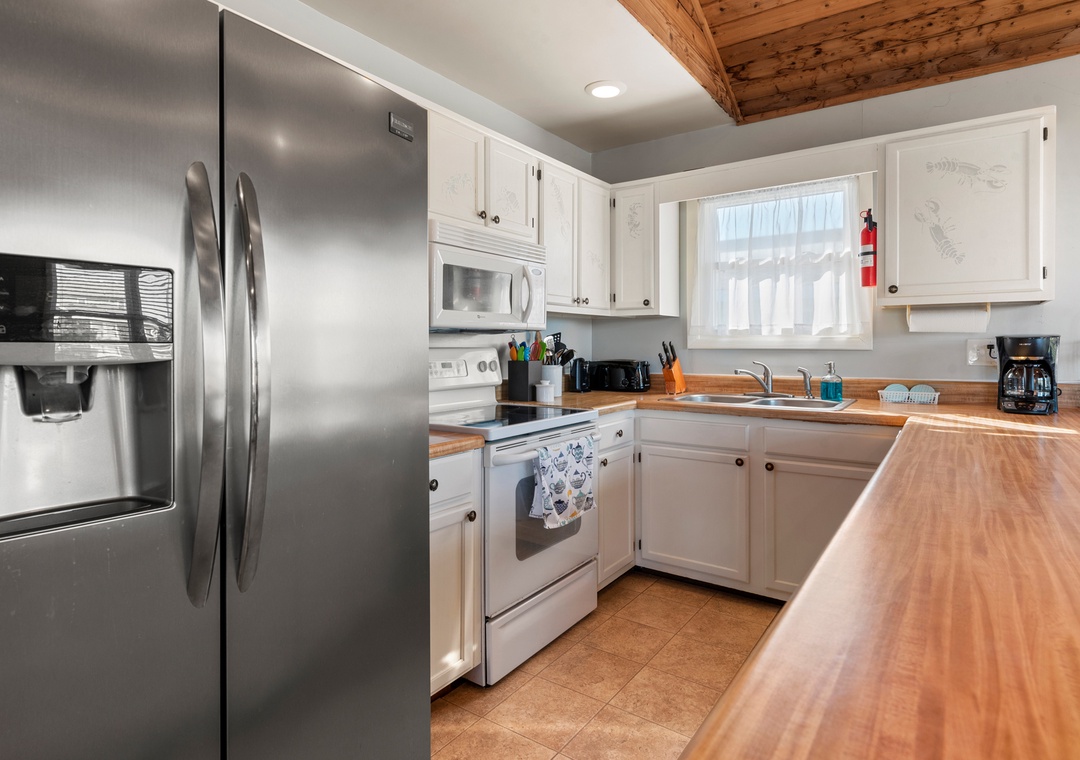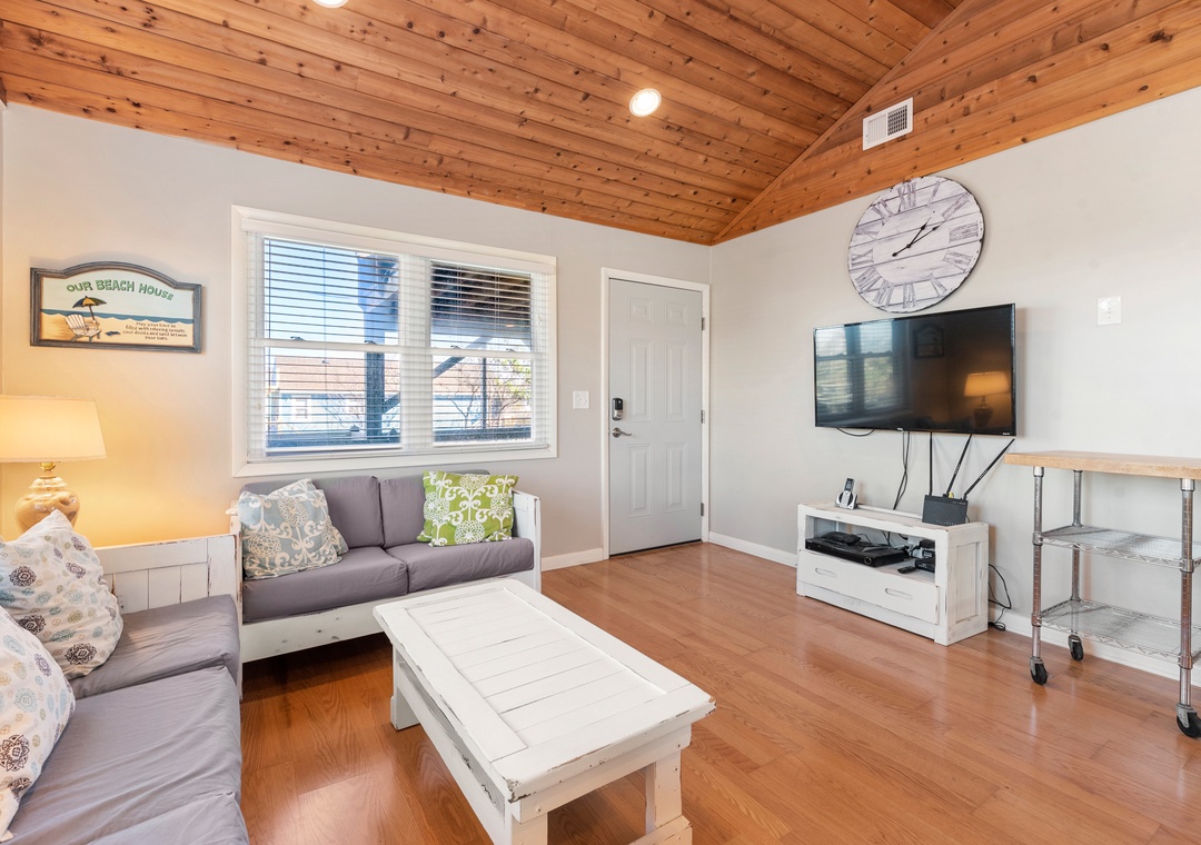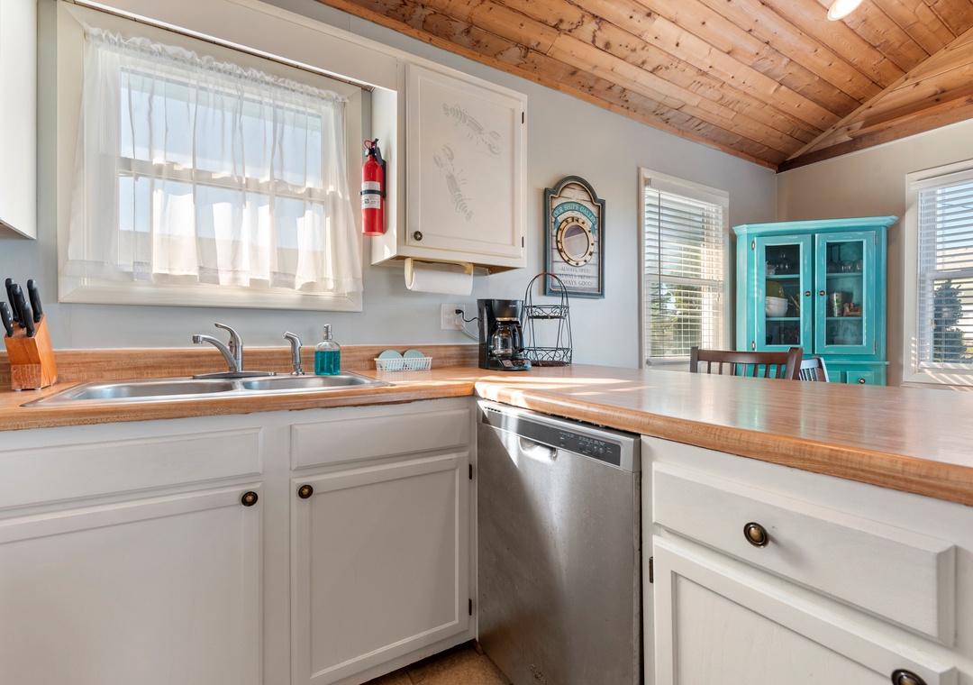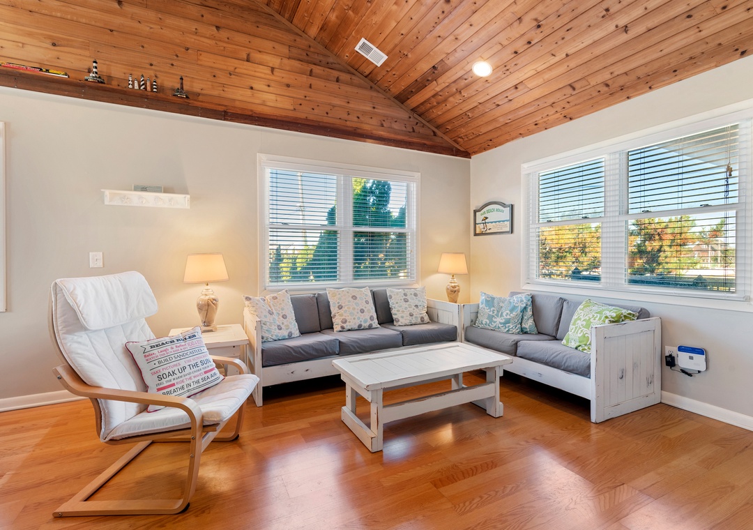After a day at the beach or exploring town, come home and gather in the open-concept living area. This charming and comfortably furnished space boasts a vaulted, wood-paneled ceiling for classic coastal character. When you're not dining out, prepare meals in the well-equipped kitchen with breakfast bar seating. The primary bedroom features a queen bed, ensuite bath and deck access. Two additional bedrooms are perfect for family and friends and share a full hall bath. All the common areas and bedrooms are located together on the main floor for convenient, one-level living.