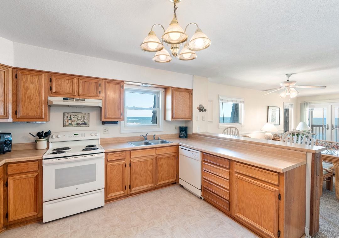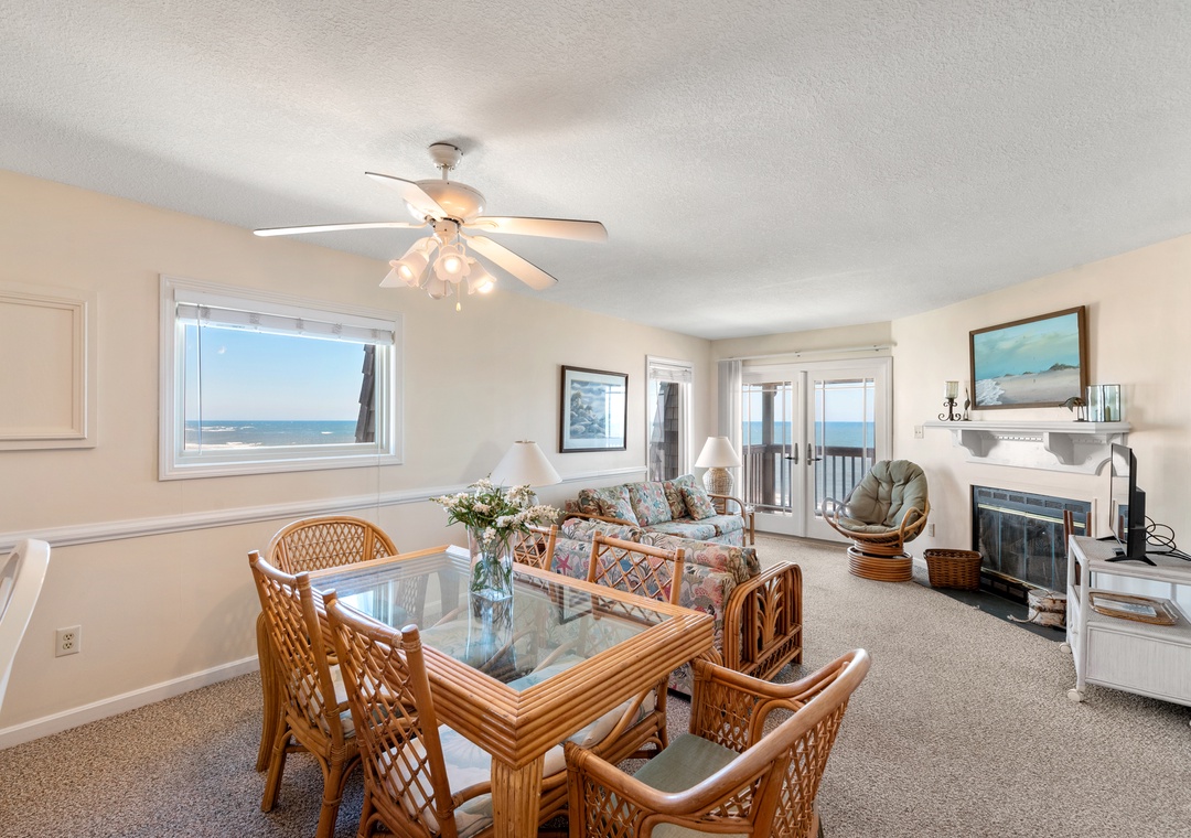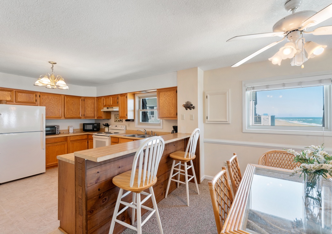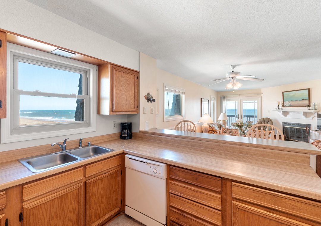 Golden Strand Unit C3 is a well-maintained oceanfront condo located at milepost 7.5 in Kill Devil Hills. The Golden Strand Condominium complex has long been a popular choice for vacationers, attracting repeat renters year after year. Golden Strand C3 is a top-level end-unit, providing guests with more privacy and maximum ocean views. A large outdoor pool and direct access to the beach means everything you need for a relaxing vacation will be just steps away. Equipped with a living/dining area, full kitchen, two bedrooms and two baths, this condo combines single-family privacy with resort-style amenities. A private oceanfront deck is located just off the great room, where you can watch the sunrise or listen to the waves. A life-guarded beach, kiddie pool, and a playground make Golden Strand ideal for families with children. Additional community features include a BBQ area with park grills and picnic table, two laundry facilities, outdoor showers, and an elevator for easy access to all levels.