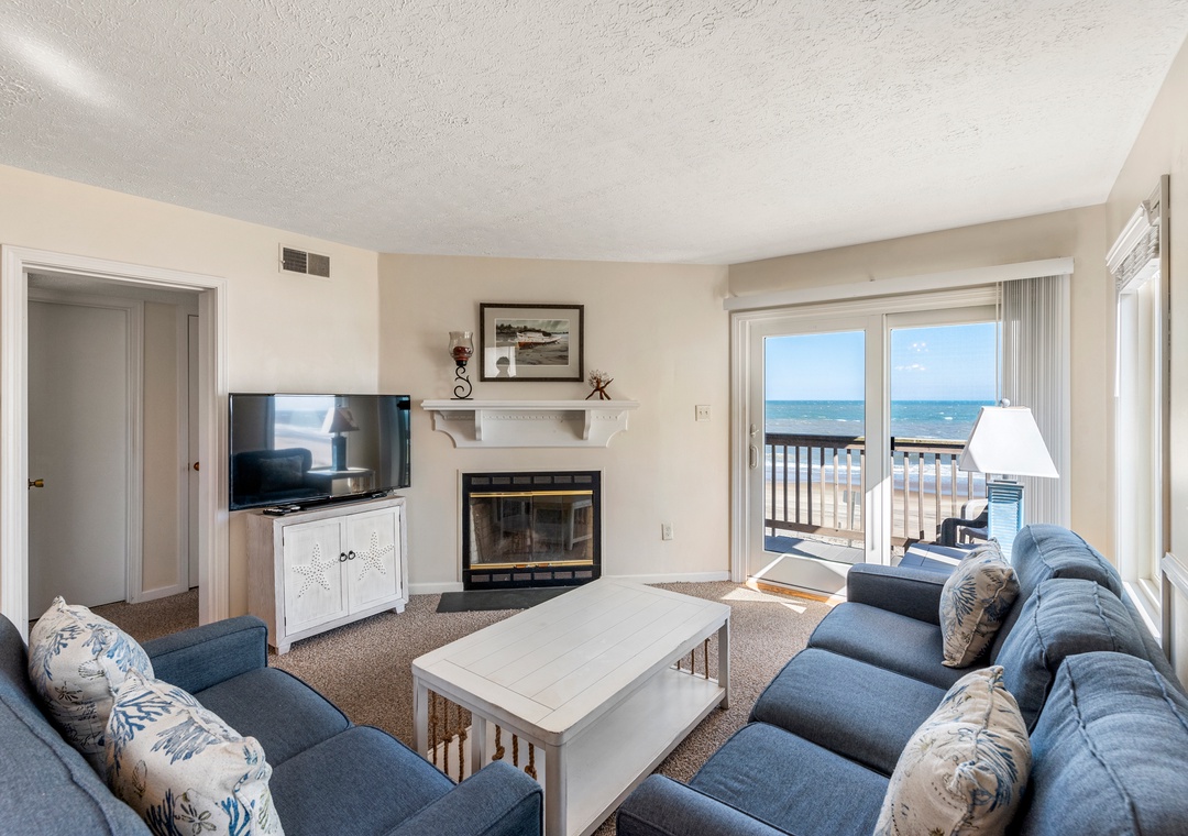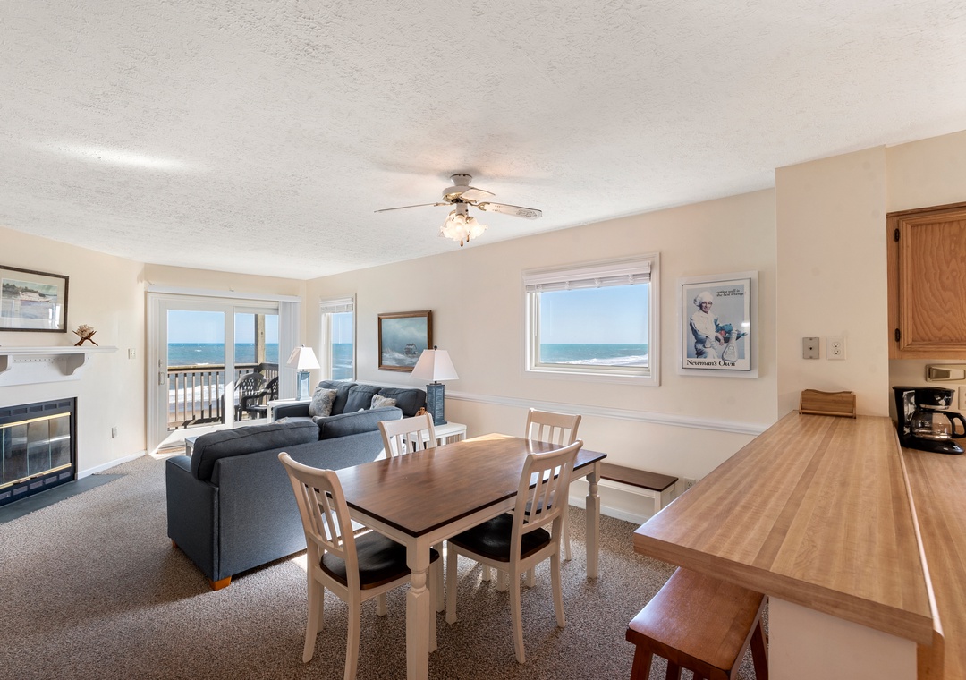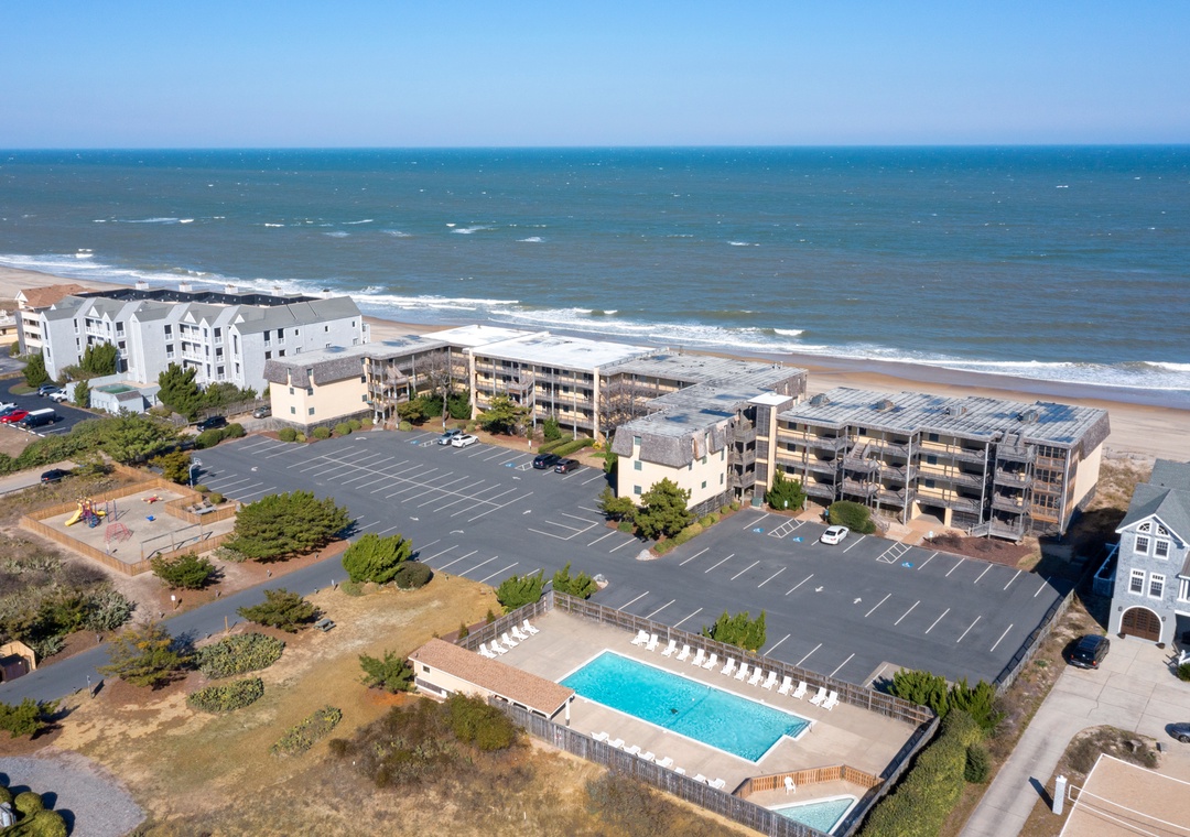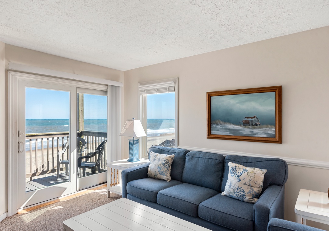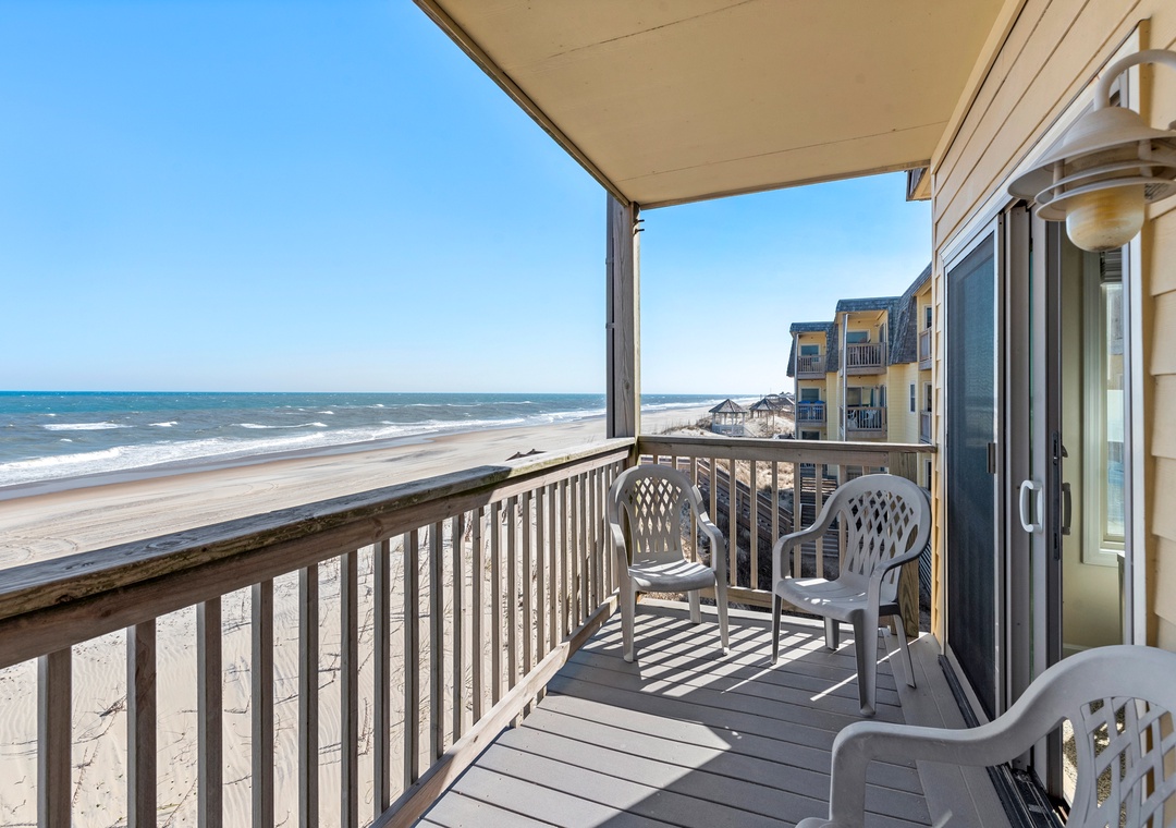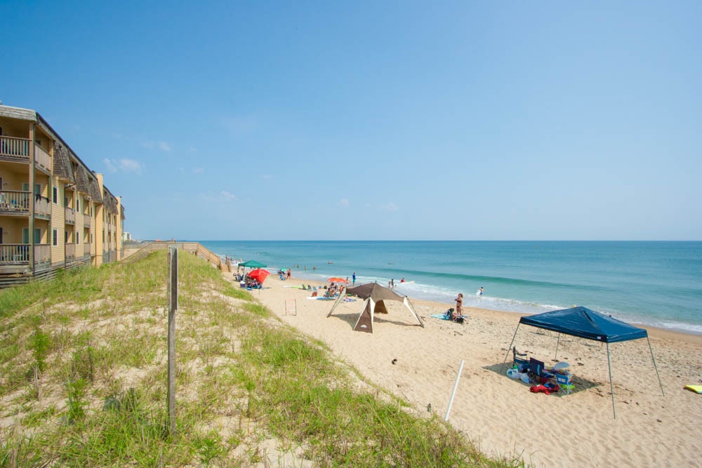 Golden Strand Unit J2 is a well-maintained oceanfront condo located at milepost 7.5 in Kill Devil Hills. The Golden Strand Condominium complex has long been a popular choice for vacationers, attracting repeat renters year after year. Golden Strand J2 is a second-floor unit, providing guests with more privacy and fabulous ocean views. A large outdoor pool and direct access to the beach means everything you need for a relaxing vacation will be just steps away. Equipped with a living/dining area, full kitchen, two bedrooms and two baths, this condo combines single-family privacy with resort-style amenities. A private oceanfront deck is located just off the great room, where you can watch the sunrise or listen to the waves. A life-guarded beach, kiddie pool, and a playground make Golden Strand ideal for families with children. Additional community features include a BBQ area with park grills and picnic table, two laundry facilities, outdoor showers, and an elevator for easy access to all levels.