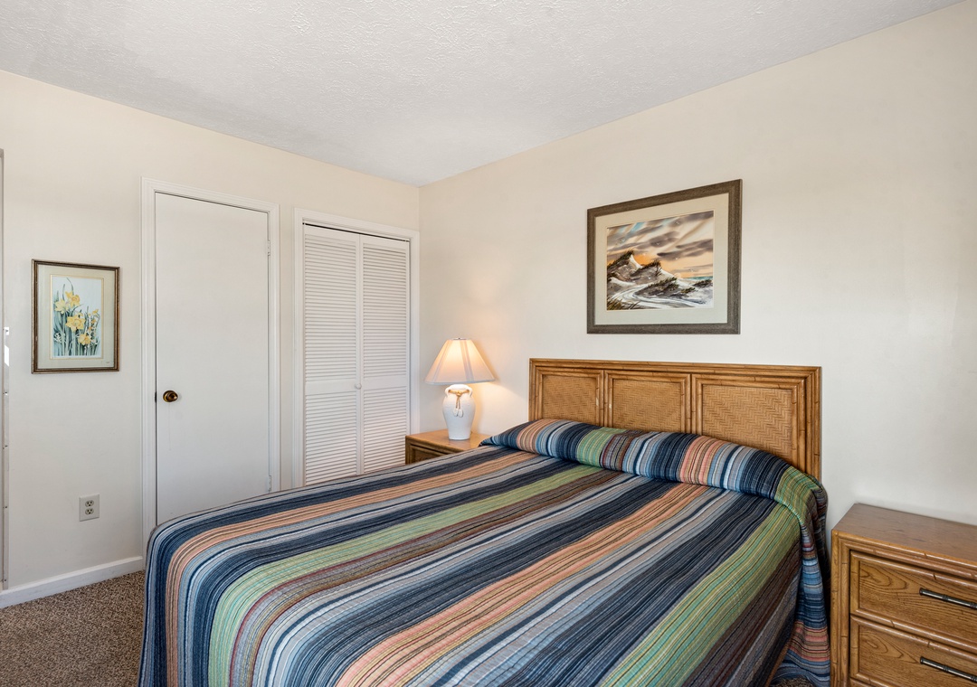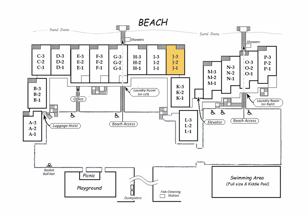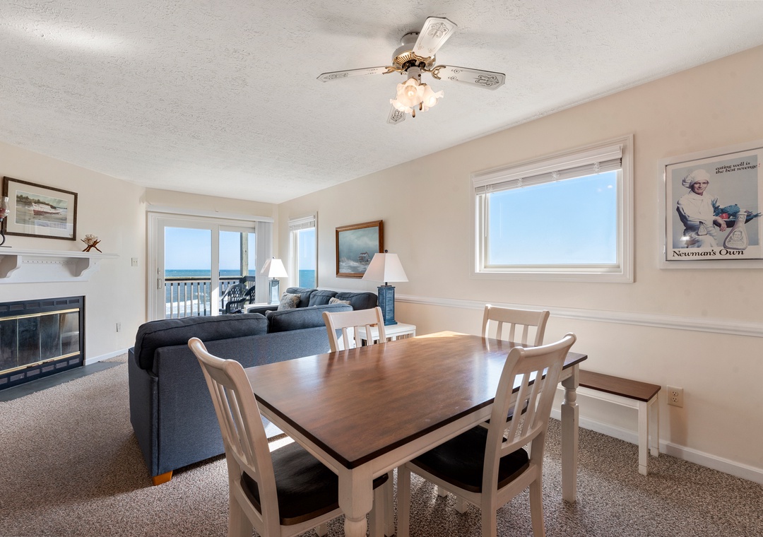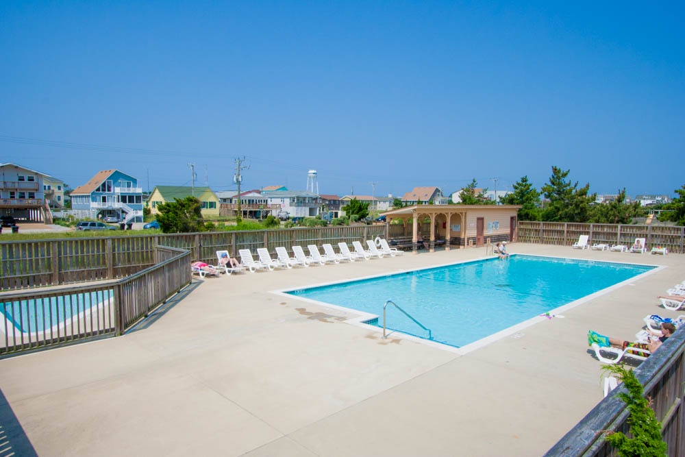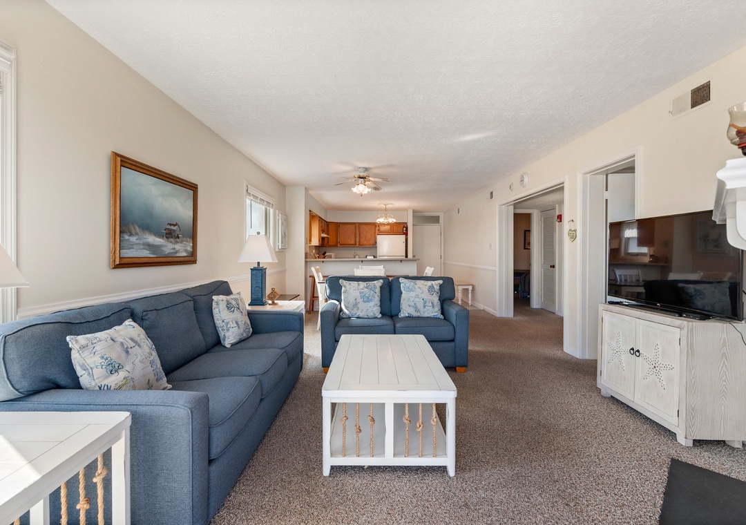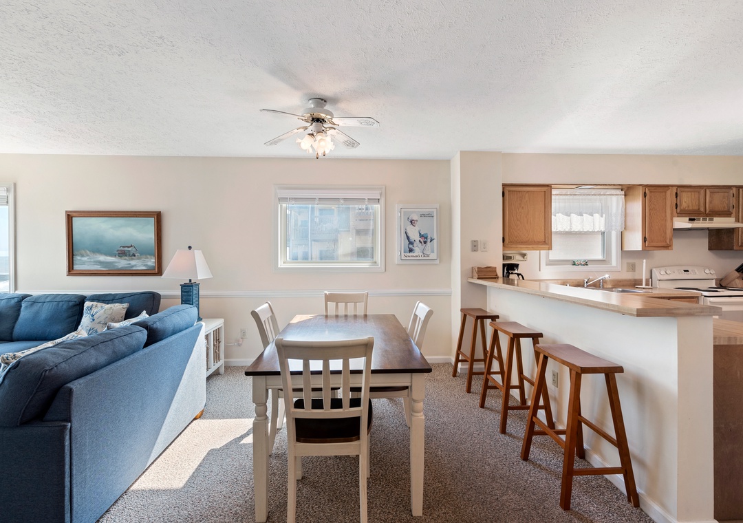 Golden Strand Unit J2 is a well-maintained oceanfront condo located at milepost 7.5 in Kill Devil Hills. The Golden Strand Condominium complex has long been a popular choice for vacationers, attracting repeat renters year after year. Golden Strand J2 is a second-floor unit, providing guests with more privacy and fabulous ocean views. A large outdoor pool and direct access to the beach means everything you need for a relaxing vacation will be just steps away. Equipped with a living/dining area, full kitchen, two bedrooms and two baths, this condo combines single-family privacy with resort-style amenities. A private oceanfront deck is located just off the great room, where you can watch the sunrise or listen to the waves. A life-guarded beach, kiddie pool, and a playground make Golden Strand ideal for families with children. Additional community features include a BBQ area with park grills and picnic table, two laundry facilities, outdoor showers, and an elevator for easy access to all levels.