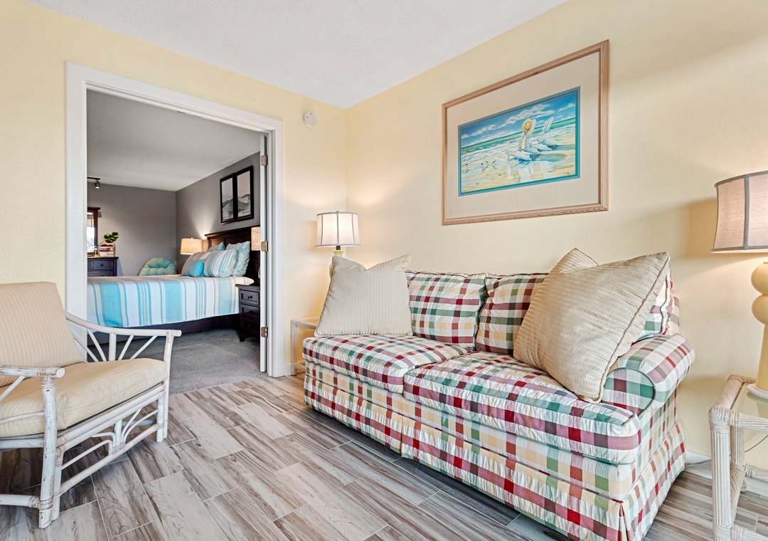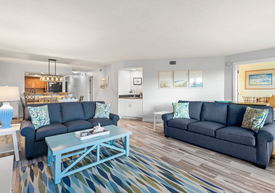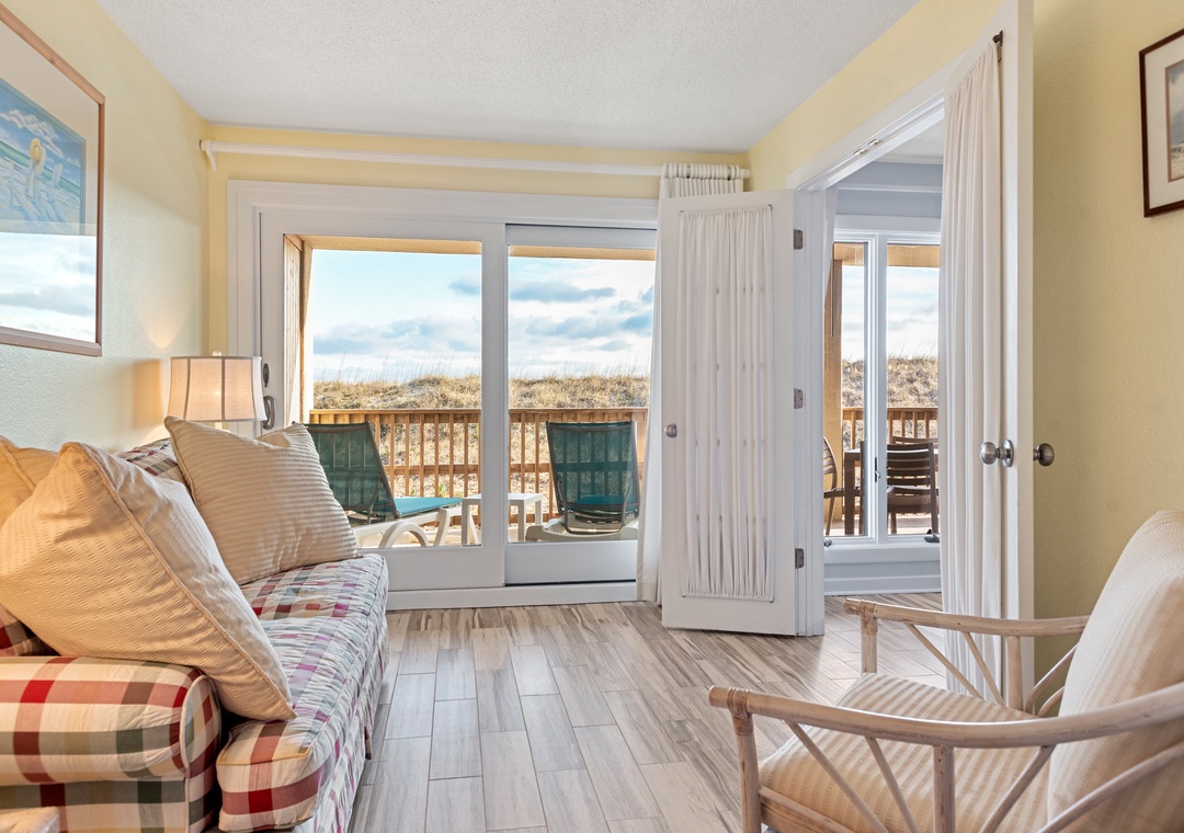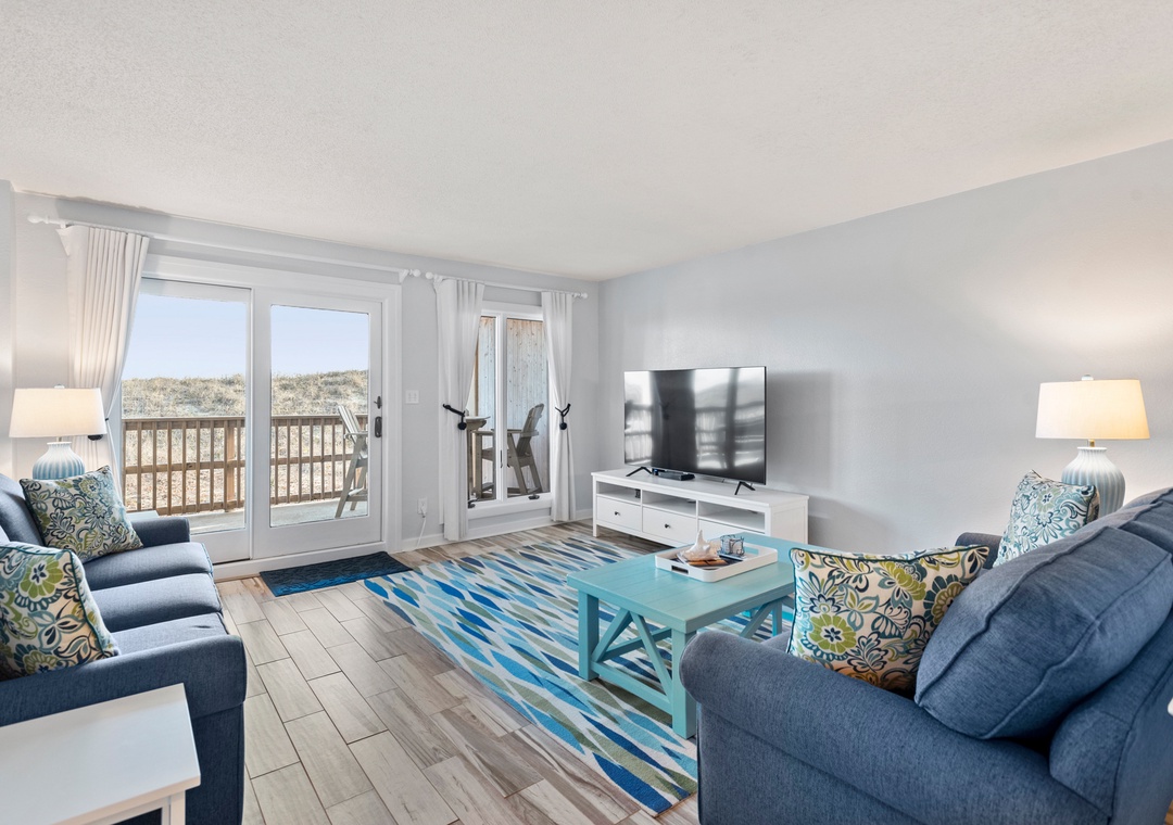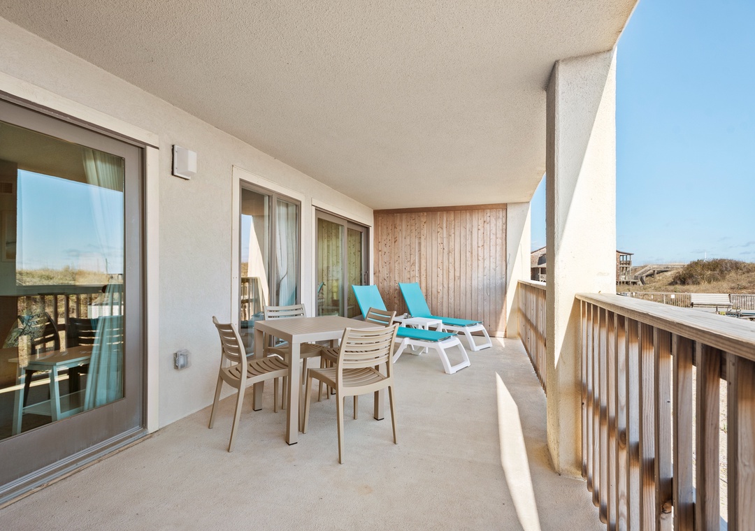 Cast~A~Waves (Heron Cove 102S) is an Oceanfront Condo in Nags Head. This lovely Outer Banks vacation rental has a spacious living, dining area, and sunroom all of which have access to the covered, oceanfront deck. It also features a Master Bedroom and Master Bath with jetted tub. There are two additional bedrooms, a full bath with tub/shower and separate ½ bath providing private family space. The sunroom can be closed off to serve as an additional sleeping room with its own pull-out sofa.