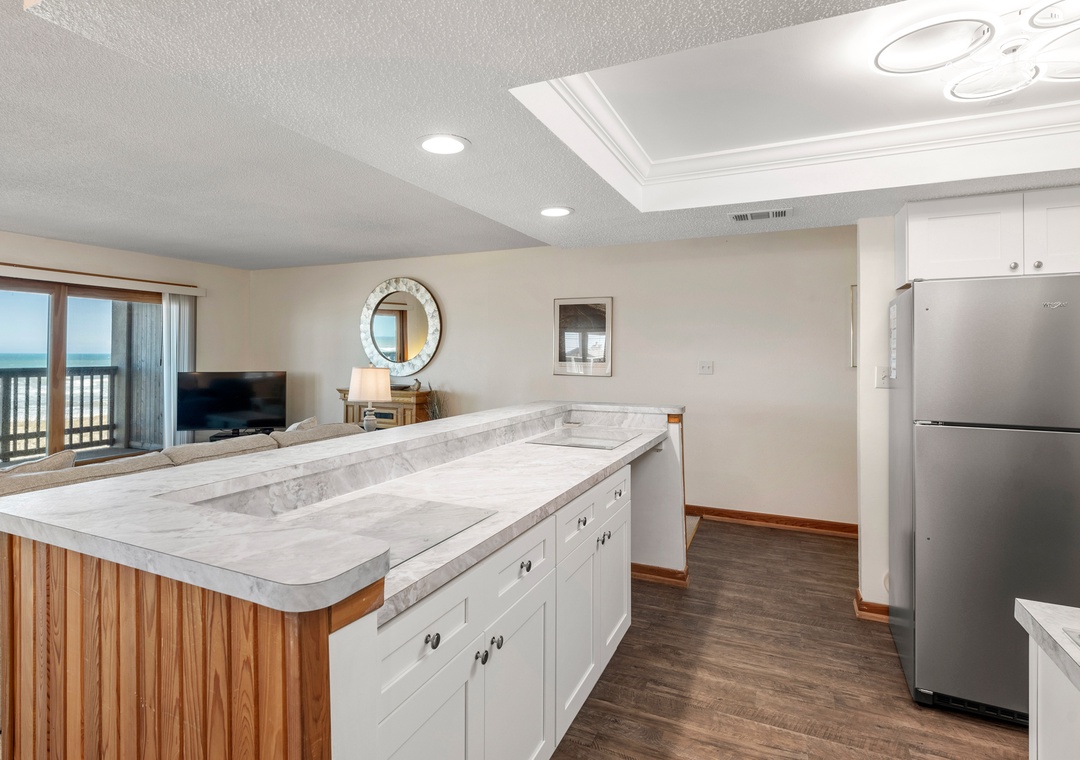 Thank you, Linda. We're glad you enjoyed the updated condo — comfortable sofas and beds, a well‑equipped kitchen, and that fantastic ocean view. We're also happy the elevator made transporting luggage and groceries easier. We appreciate you choosing Village Realty and look forward to welcoming you back.Village Realty staff