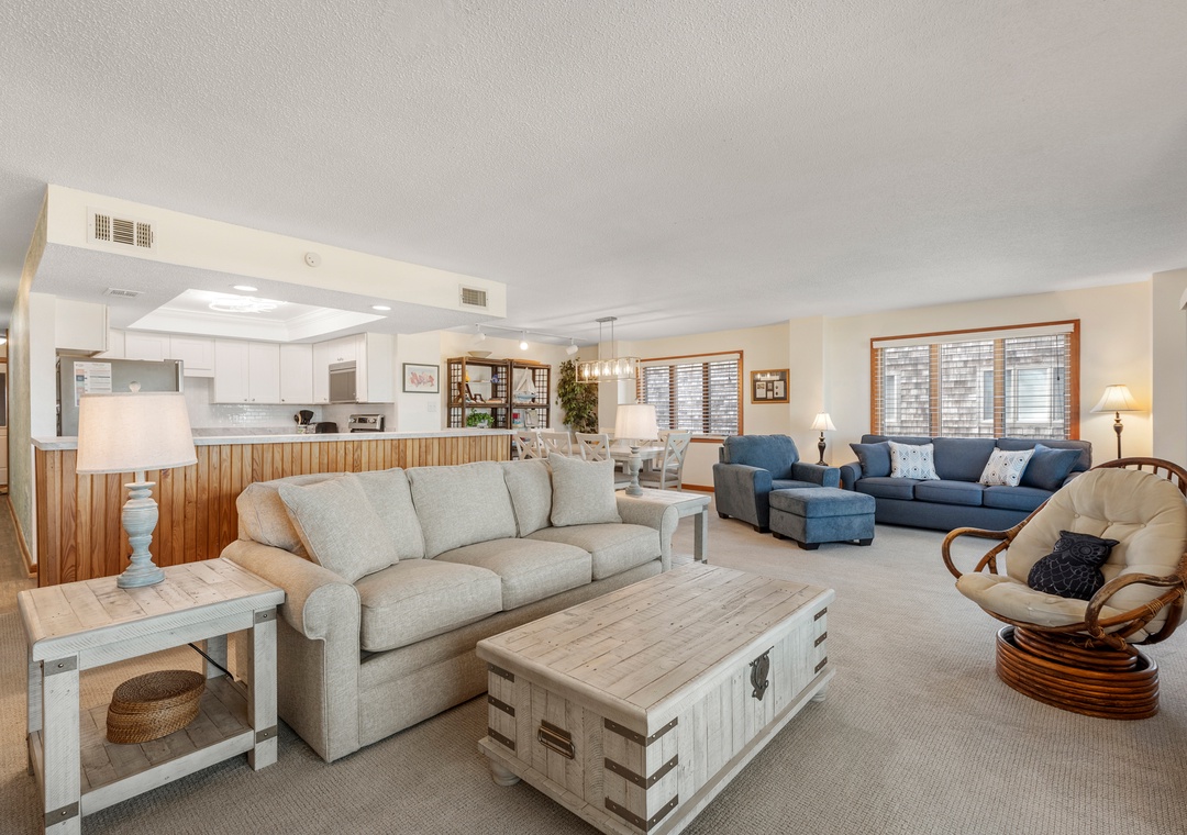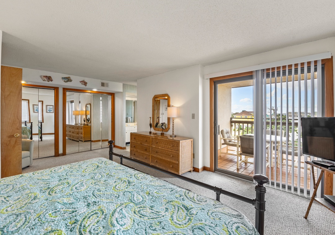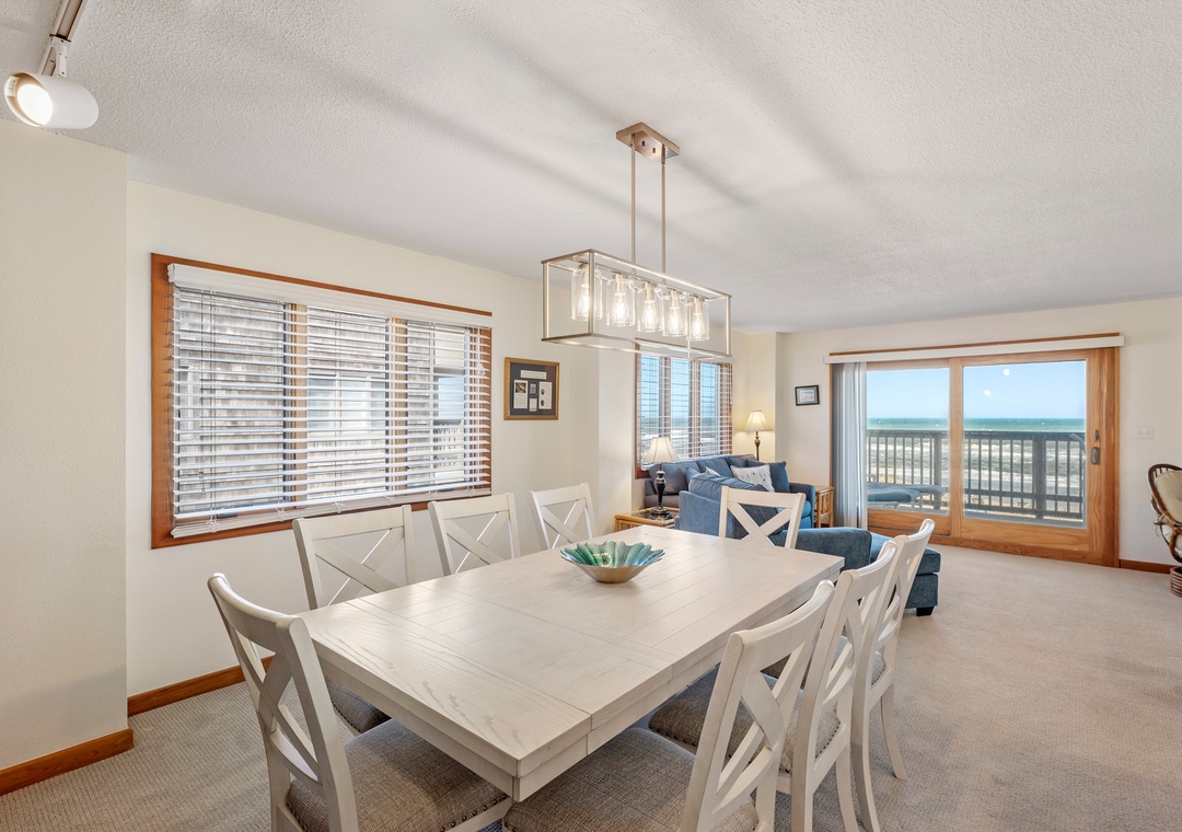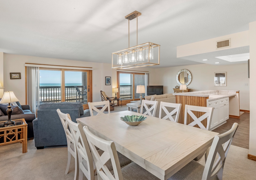 This spacious and comfortably furnished 3rd-floor end unit offers outstanding ocean views and breezes from each room. The master suite boasts a deck with a spectacular view of sunsets over Roanoke Sound, a whirlpool-shower and a TV for ultimate privacy!
