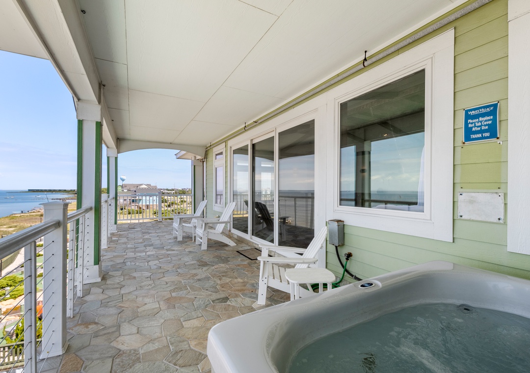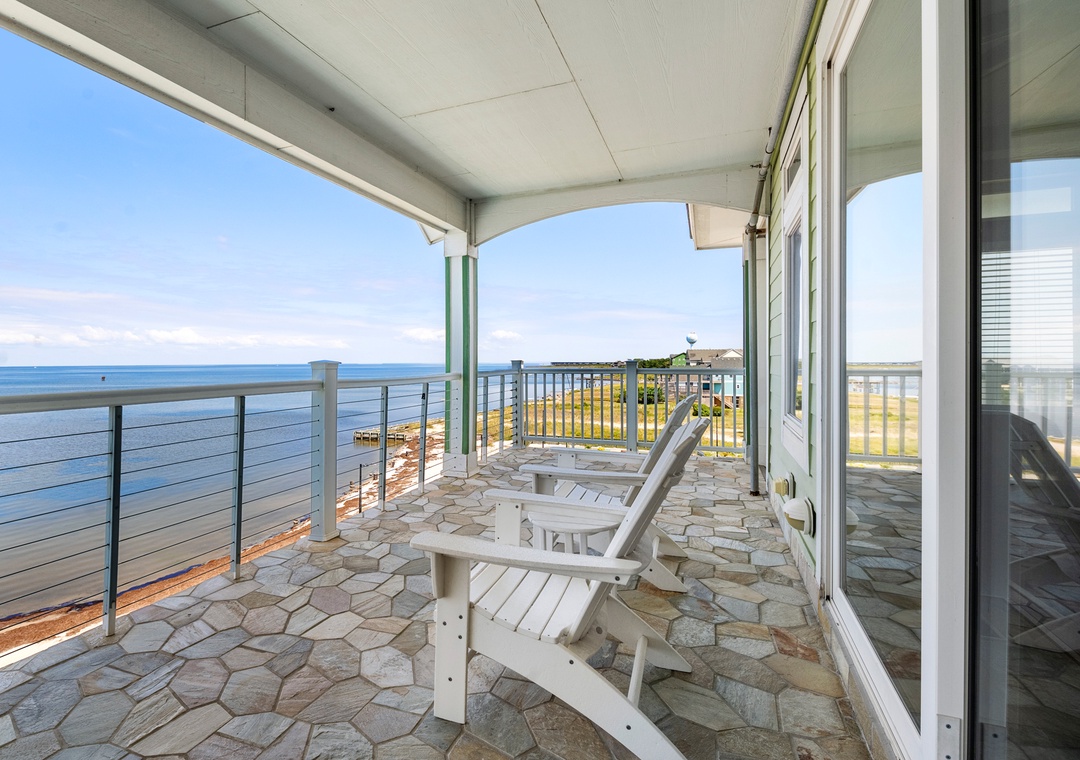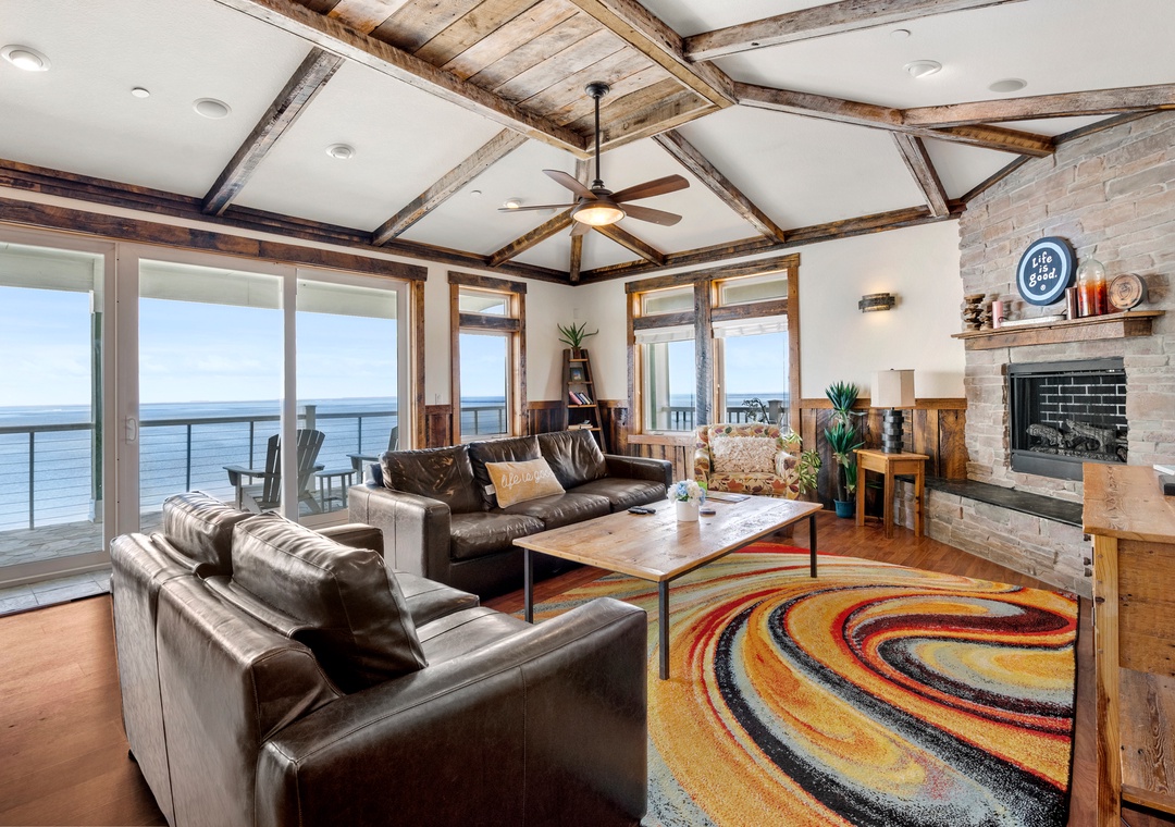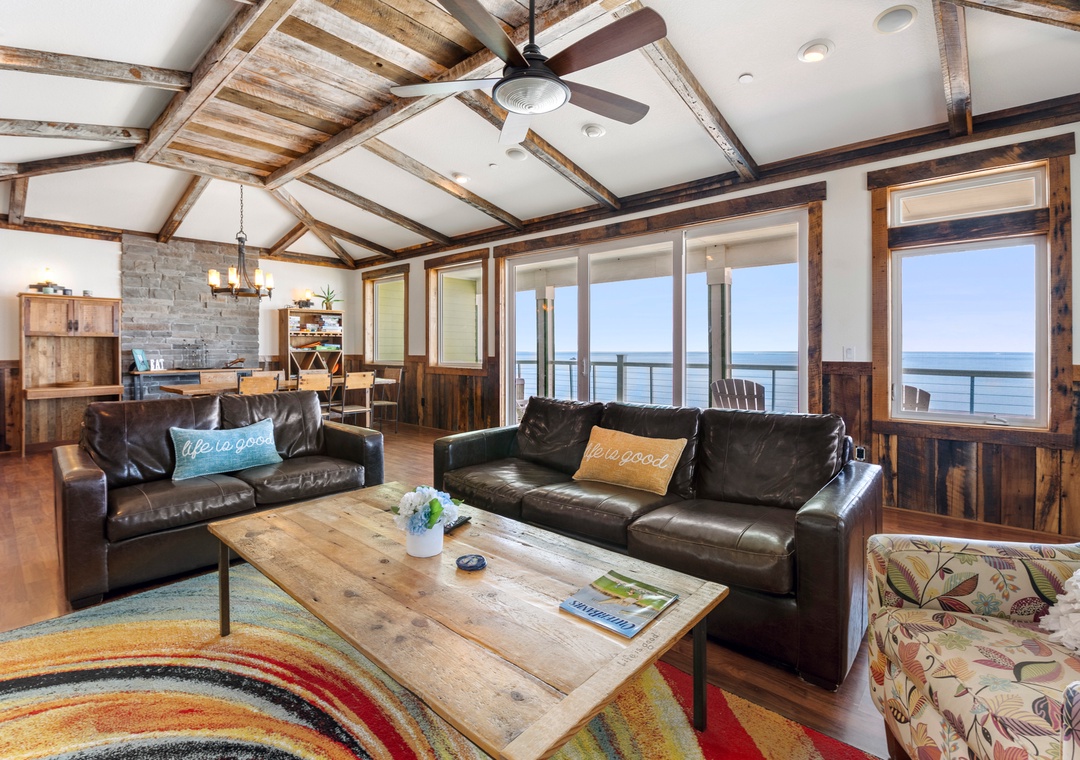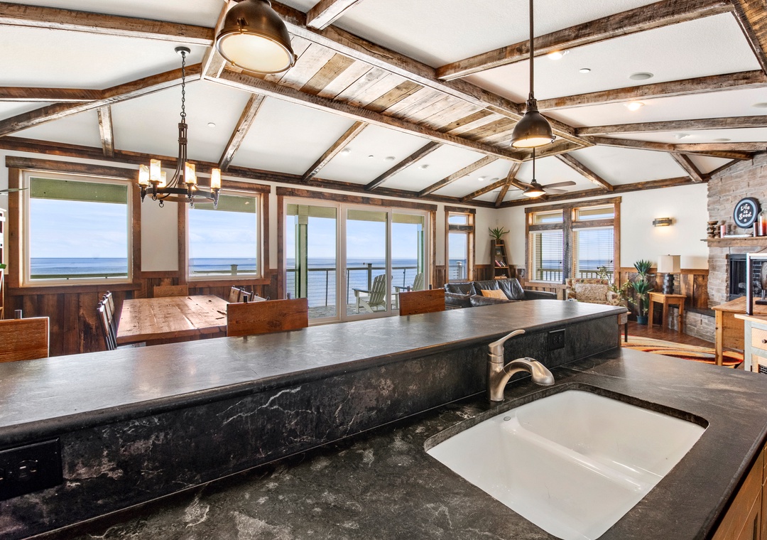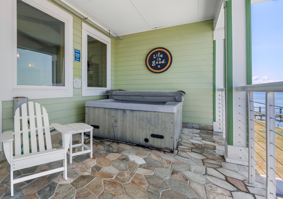 For your next Outer Banks vacation, embrace the "Life is Good" mentality and find out why water enthusiasts from all over the world escape to Rodanthe. This penthouse condo is a corner unit, offering more privacy and panoramic sound views. Life Is Good was thoughtfully furnished by Bert and John Jacobs, founders of the popular lifestyle brand Life Is Good. Exquisite finishes and high-end details create an atmosphere of coastal luxury. Wood laminate flooring flows throughout the entire condo, and the soaring vaulted ceilings boast exposed beams that were milled from a 200-year-old barn in Asheville, North Carolina. An open-concept layout in the great room makes the most of the fabulous views and opens up onto a private waterfront terrace with hot tub. It's the perfect place to end the day with a drink in hand while watching the sunset. Back inside, get dinner started in the gourmet kitchen with stainless steel appliance and gorgeous soapstone countertops.