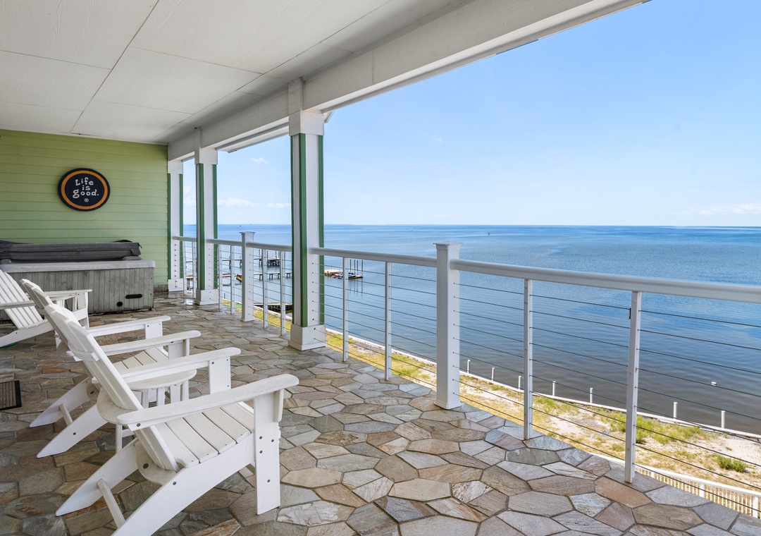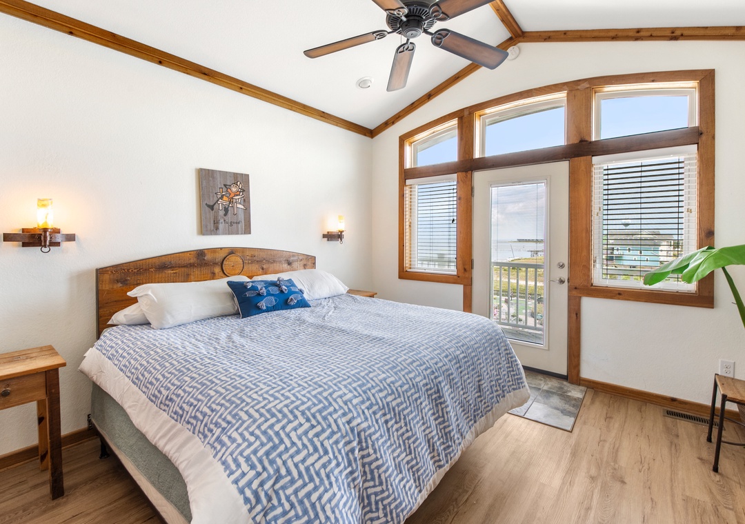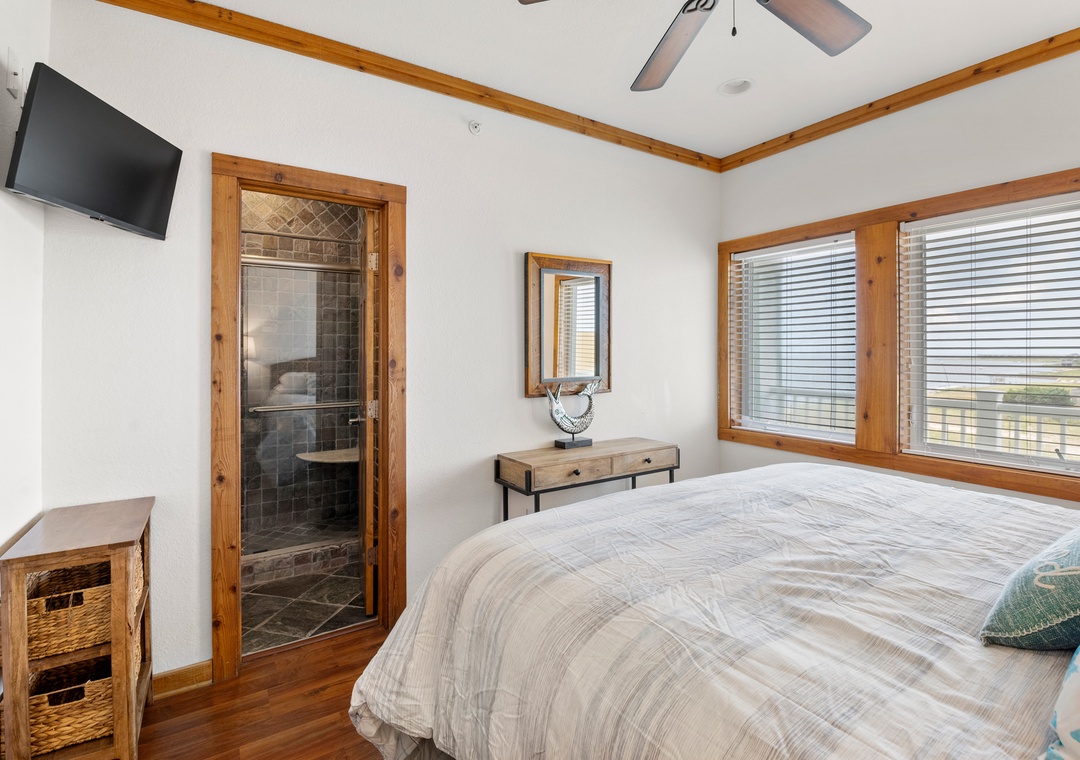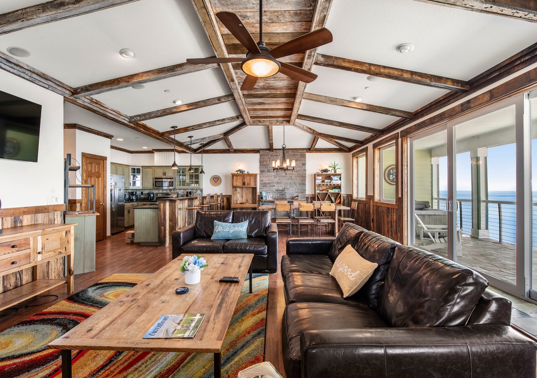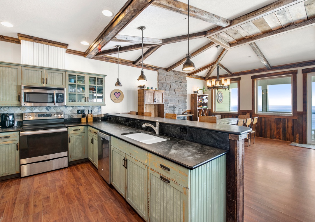 For your next Outer Banks vacation, embrace the "Life is Good" mentality and find out why water enthusiasts from all over the world escape to Rodanthe. This penthouse condo is a corner unit, offering more privacy and panoramic sound views. Life Is Good was thoughtfully furnished by Bert and John Jacobs, founders of the popular lifestyle brand Life Is Good. Exquisite finishes and high-end details create an atmosphere of coastal luxury. Wood laminate flooring flows throughout the entire condo, and the soaring vaulted ceilings boast exposed beams that were milled from a 200-year-old barn in Asheville, North Carolina. An open-concept layout in the great room makes the most of the fabulous views and opens up onto a private waterfront terrace with hot tub. It's the perfect place to end the day with a drink in hand while watching the sunset. Back inside, get dinner started in the gourmet kitchen with stainless steel appliance and gorgeous soapstone countertops.