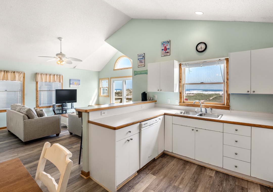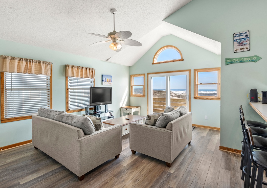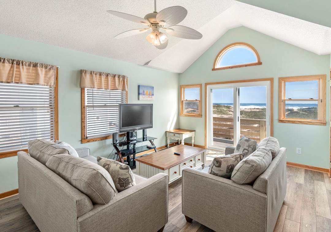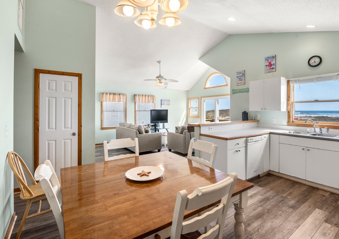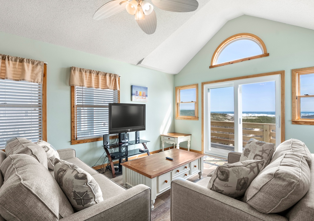 Experience what it's like to live like an Islander at this charming oceanfront cottage in peaceful Rodanthe. Islander is situated on a huge lot surrounded by natural vegetation for plenty of privacy from the neighboring homes. Dogs are welcome, so even your canine companion can join you on Hatteras Island's pet-friendly beaches during your stay. An expansive east-facing deck with hot tub is where you can soak up the sun by day and lounge under the stars at night. Fire up the grill downstairs and serve your fresh catch at the picnic table while enjoying the refreshing coastal breezes. Inside, you can still admire the ocean view from the comfortably furnished great room with vaulted ceilings and plenty of natural light. Whether you're watching a movie or preparing a meal in the kitchen, the open-concept layout means everyone can still socialize. Three of the four bedrooms are located on the top level with the living area, including a spacious king suite with private bath. The fourth bedroom is located by itself on the lower level - the perfect option for giving kids a space of their own. Bed and bath linens are always included at no extra charge, and the beds will be made with fresh sheets and pillowcases prior to your arrival.