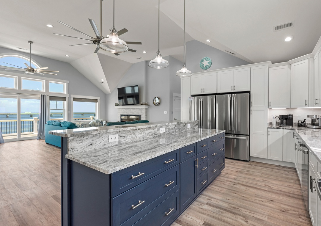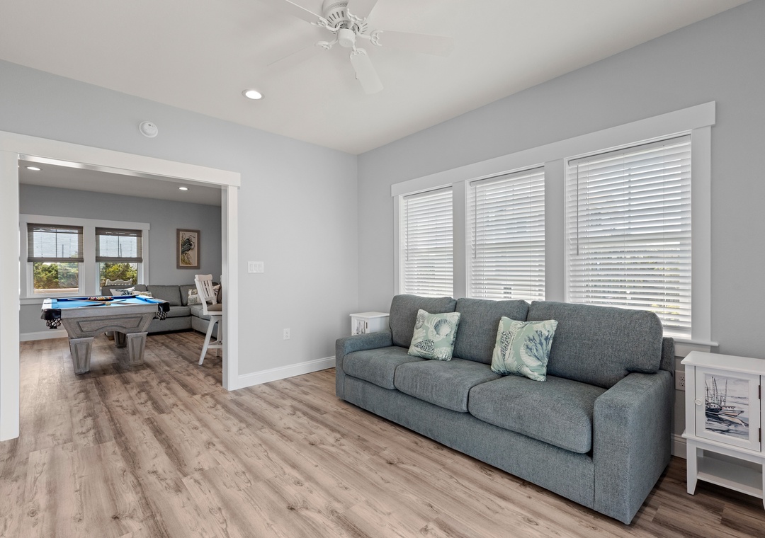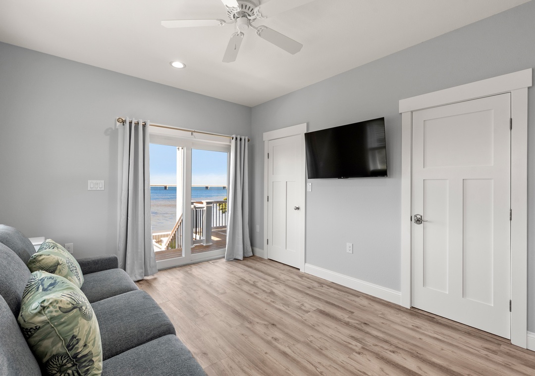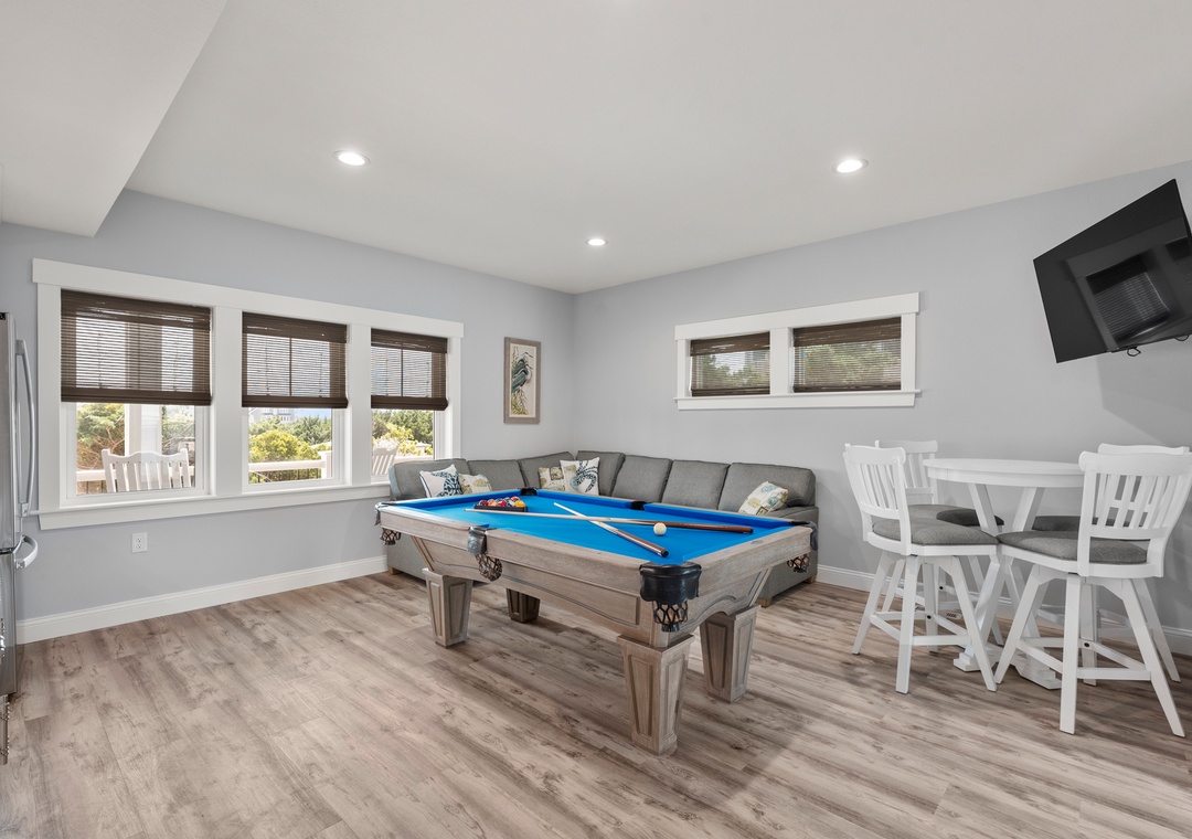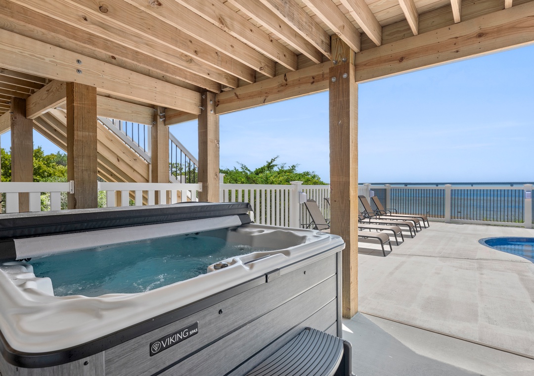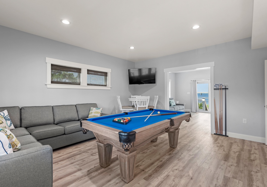The good times continue downstairs in the rec space where you can show off your skills on the billiard table. For more laid-back entertainment, watch a movie or the big game in the theater room with recliner seating. A wet bar and full-size fridge in the rec room is perfect for grabbing a beverage while shooting pool or refilling your concessions during movie night. Livin' the Dream is equipped with an elevator, ideal for guests with mobility needs. Skip the stairs and use it to send luggage and groceries to the upper levels. Guests who need to stay caught up with work or school remotely can use the designated office on the third level. Outside, the fabulous soundfront backyard features a refreshing private pool, bubbly hot tub and plenty of space for lounging in the sun. The pool can be heated certain times of the year, perfect for Spring and Fall getaways. Parking won't be an issue, with three carports that provide covered parking for six vehicles, along with four additional parking spaces in the driveway.