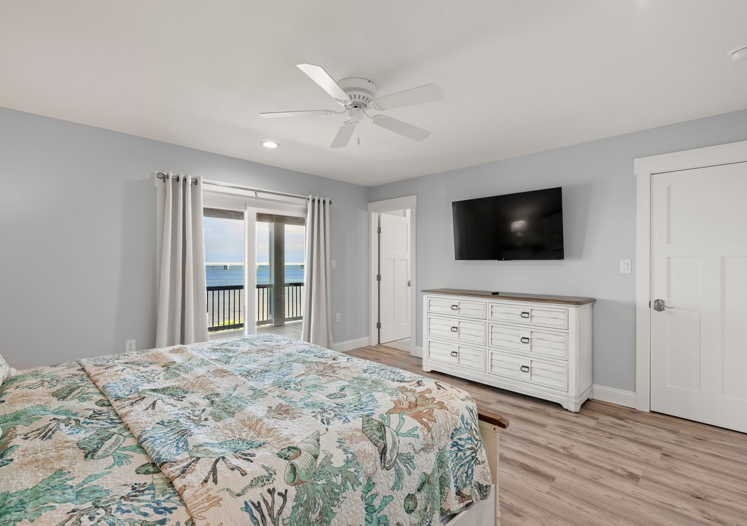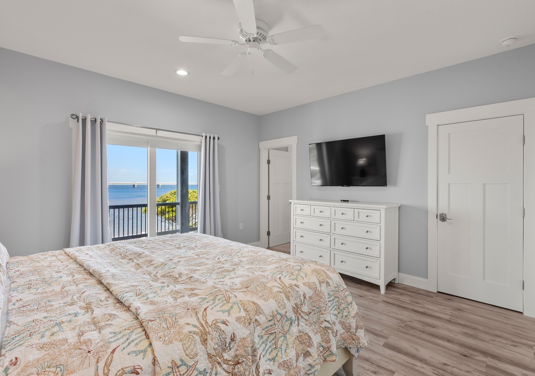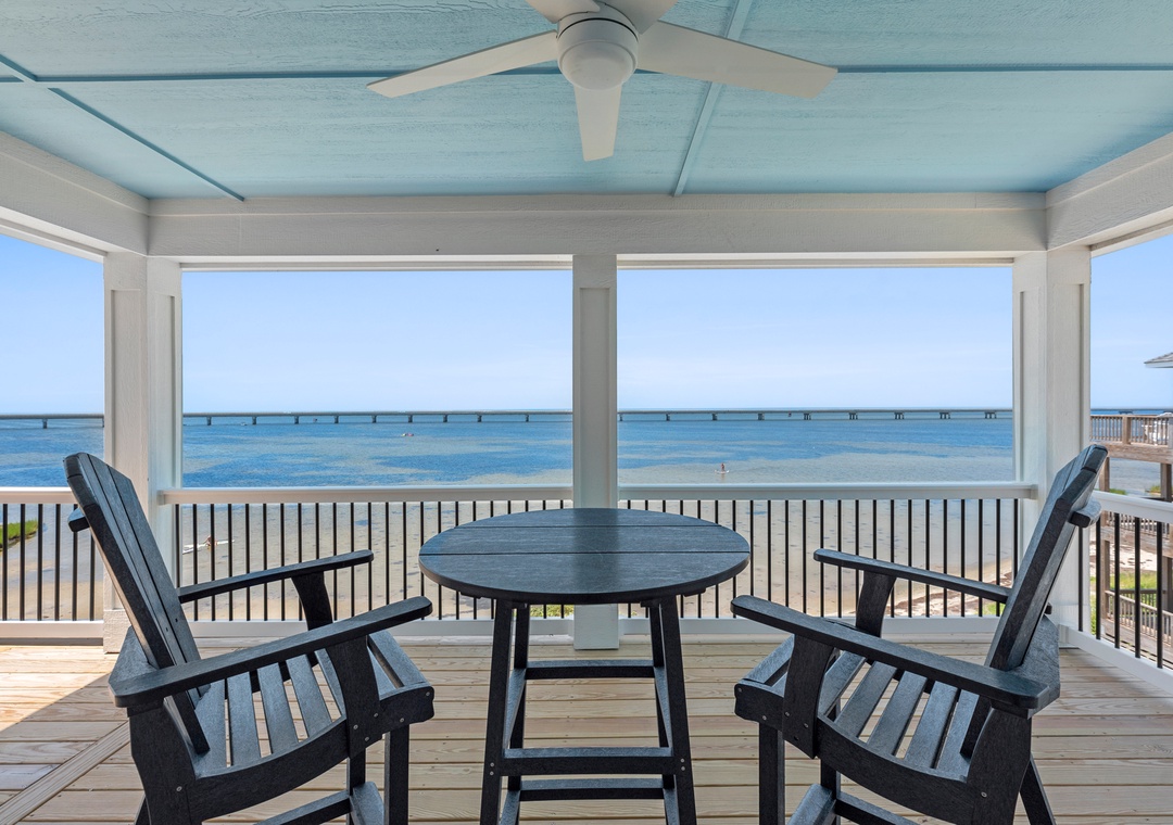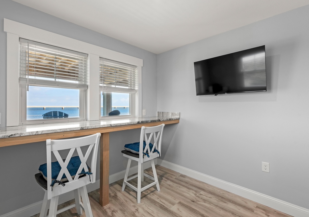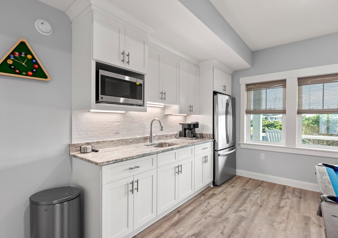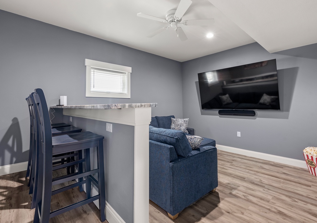 The good times continue downstairs in the rec space where you can show off your skills on the billiard table. For more laid-back entertainment, watch a movie or the big game in the theater room with recliner seating. A wet bar and full-size fridge in the rec room is perfect for grabbing a beverage while shooting pool or refilling your concessions during movie night. Livin' the Dream is equipped with an elevator, ideal for guests with mobility needs. Skip the stairs and use it to send luggage and groceries to the upper levels. Guests who need to stay caught up with work or school remotely can use the designated office on the third level. Outside, the fabulous soundfront backyard features a refreshing private pool, bubbly hot tub and plenty of space for lounging in the sun. The pool can be heated certain times of the year, perfect for Spring and Fall getaways. Parking won't be an issue, with three carports that provide covered parking for six vehicles, along with four additional parking spaces in the driveway.