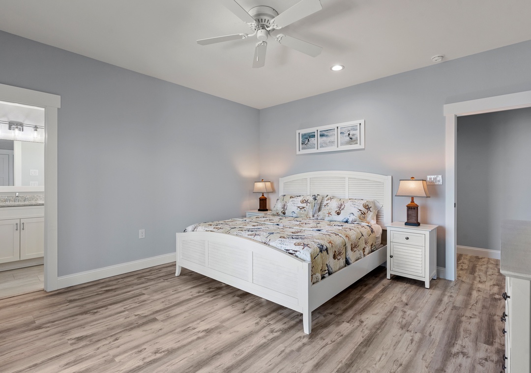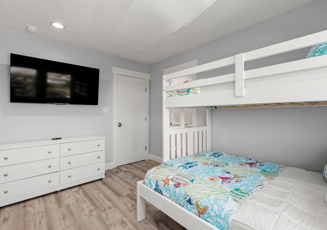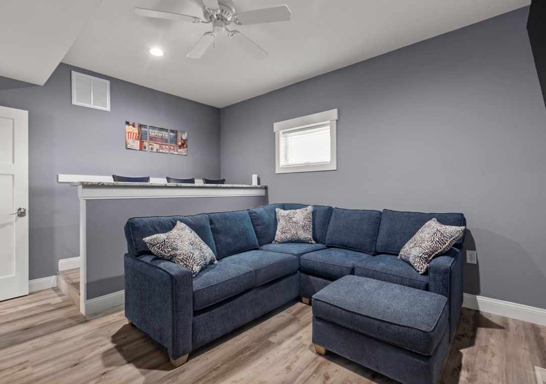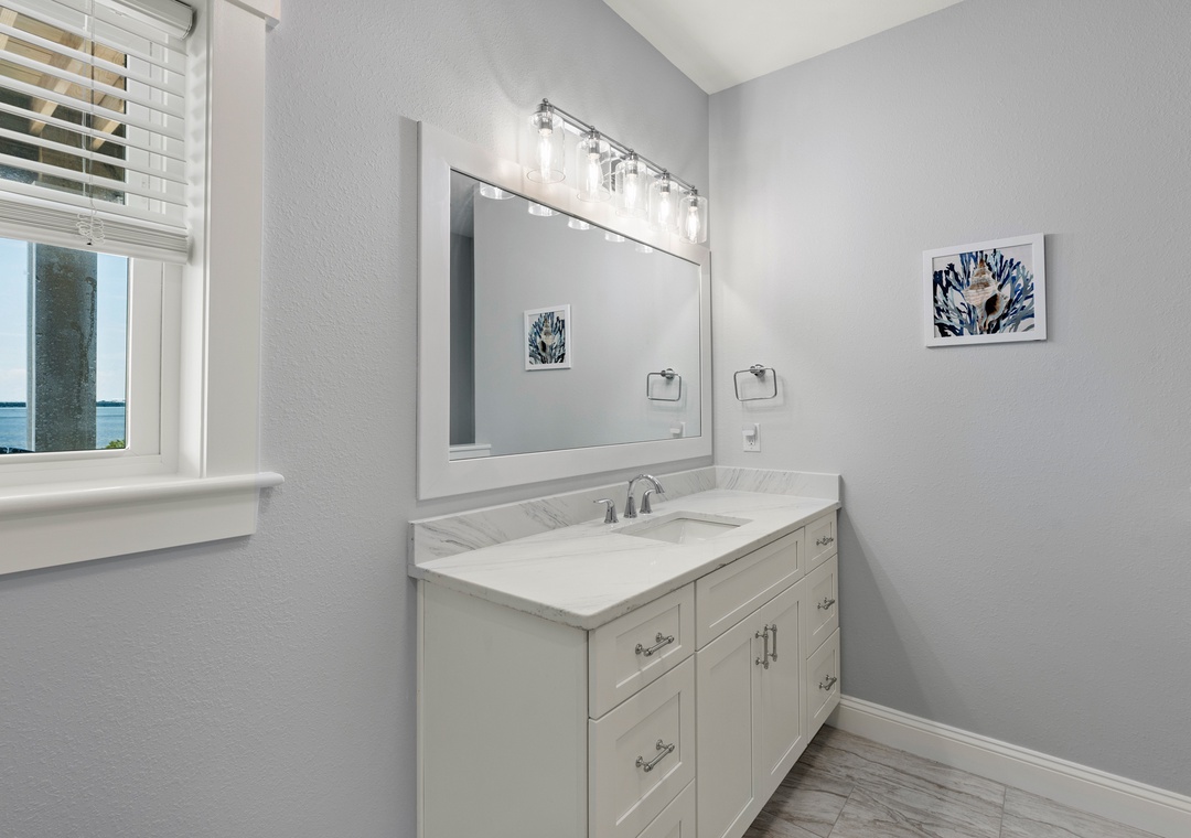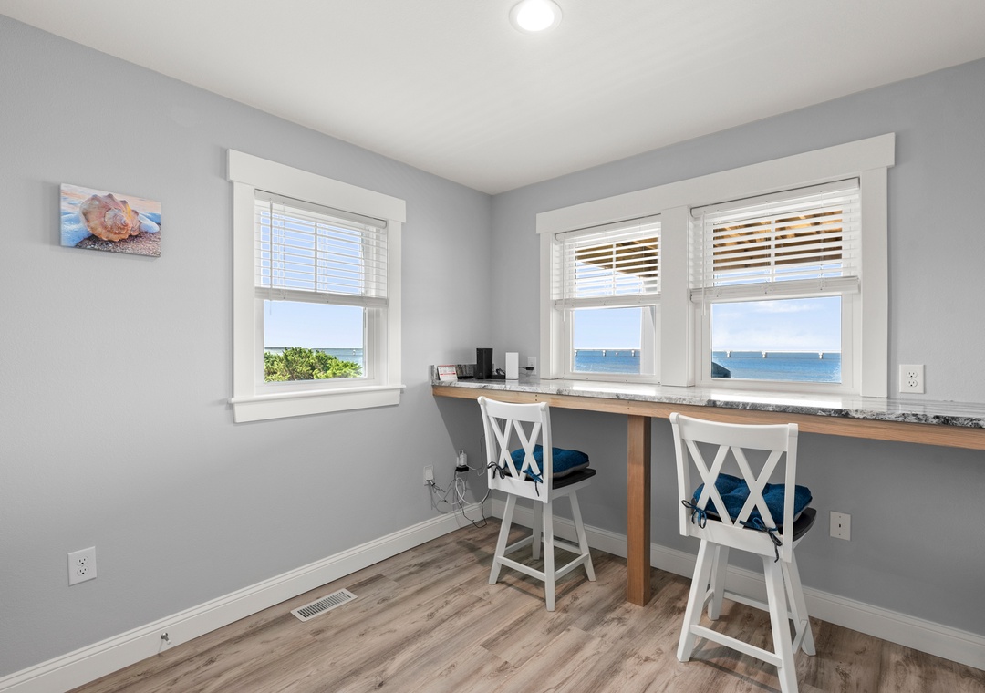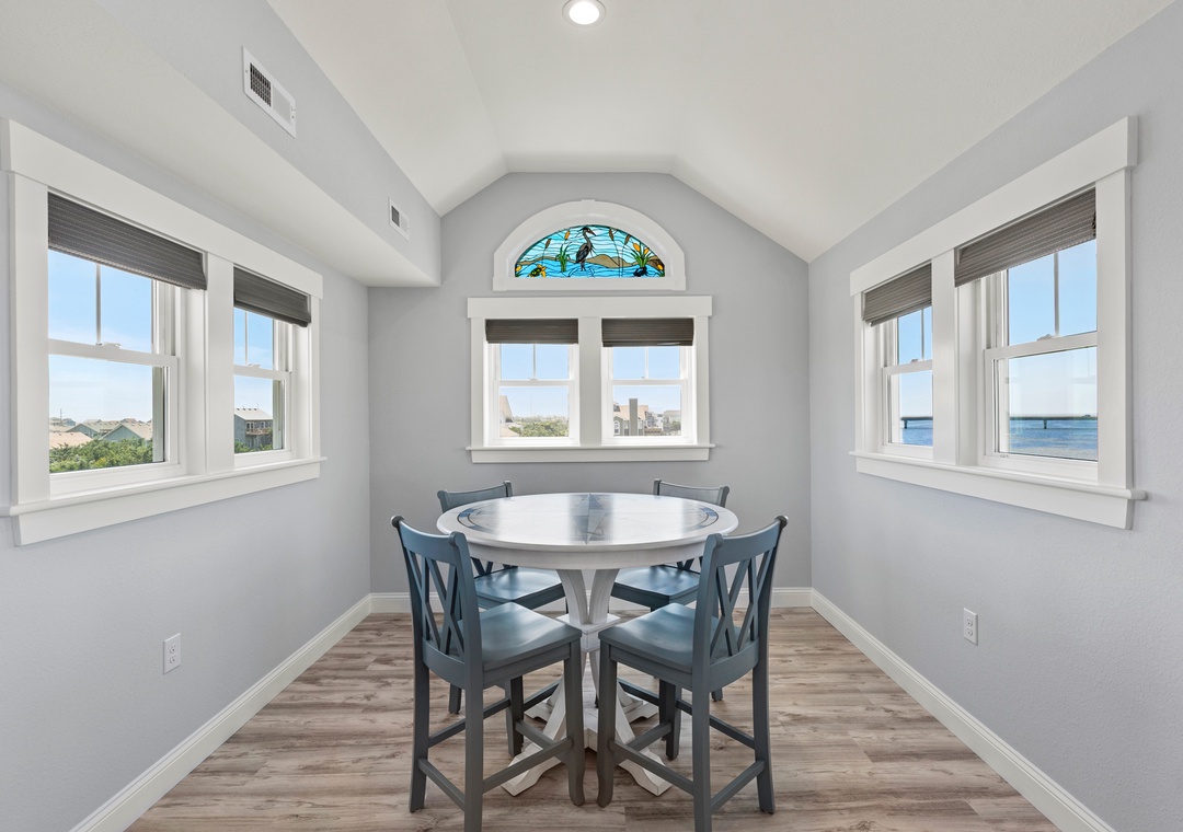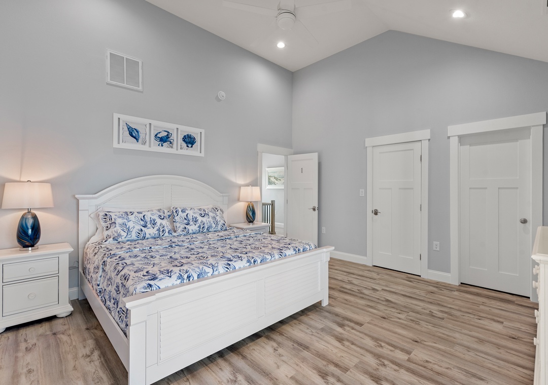 The good times continue downstairs in the rec space where you can show off your skills on the billiard table. For more laid-back entertainment, watch a movie or the big game in the theater room with recliner seating. A wet bar and full-size fridge in the rec room is perfect for grabbing a beverage while shooting pool or refilling your concessions during movie night. Livin' the Dream is equipped with an elevator, ideal for guests with mobility needs. Skip the stairs and use it to send luggage and groceries to the upper levels. Guests who need to stay caught up with work or school remotely can use the designated office on the third level. Outside, the fabulous soundfront backyard features a refreshing private pool, bubbly hot tub and plenty of space for lounging in the sun. The pool can be heated certain times of the year, perfect for Spring and Fall getaways. Parking won't be an issue, with three carports that provide covered parking for six vehicles, along with four additional parking spaces in the driveway.