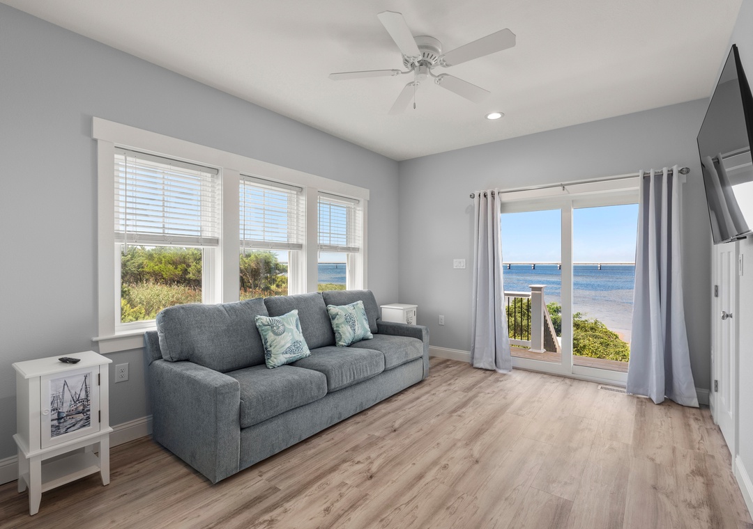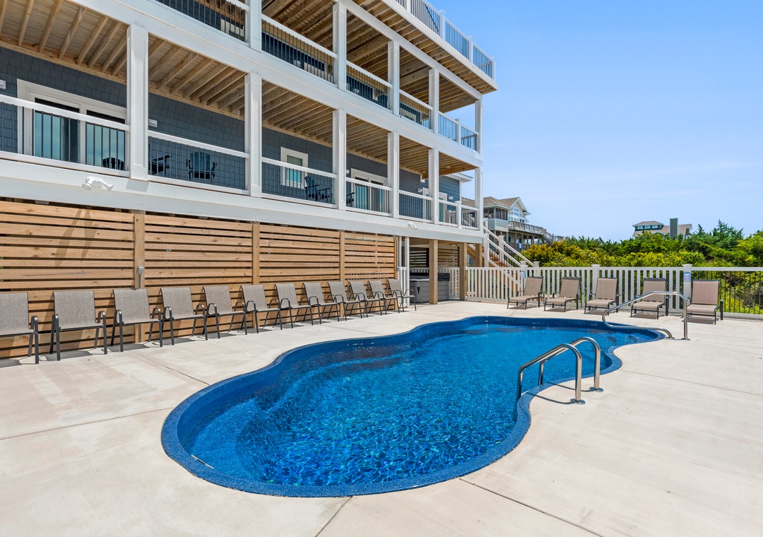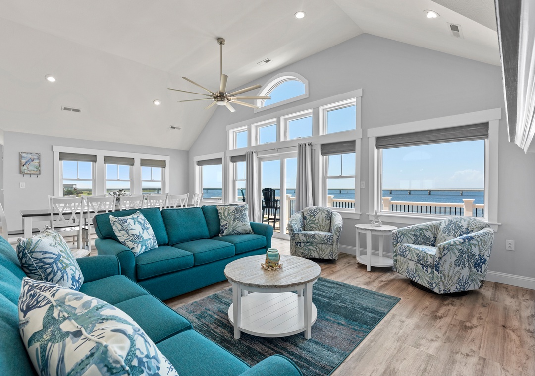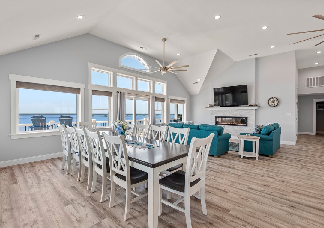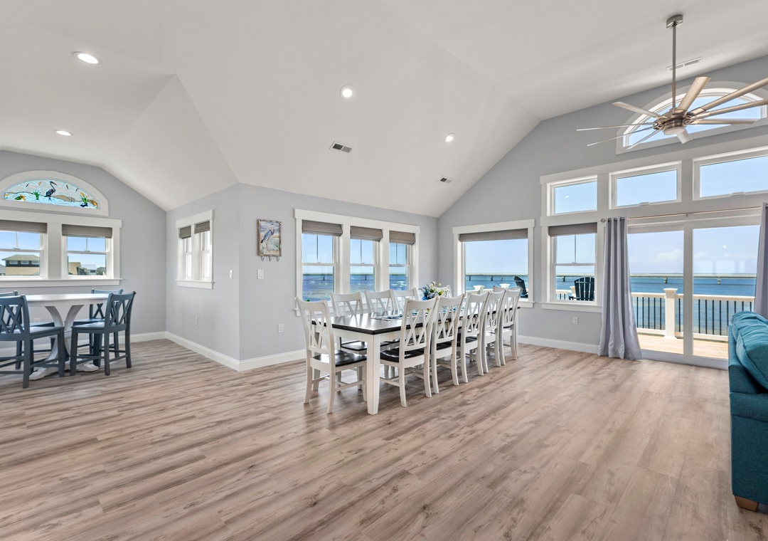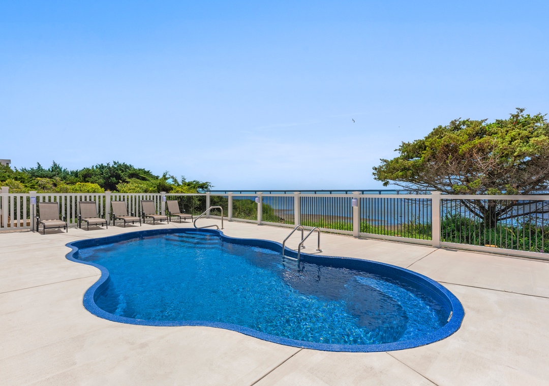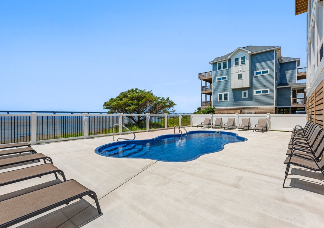You'll truly be Livin' The Dream during your stay at this magnificent 10-bedroom waterfront home with private pool, hot tub, rec room and theater room. Livin' the Dream is situated on 3/4 of an acre, one of the largest soundfront lots in Rodanthe, and features a private beach and direct access to the water for kayaking, paddleboarding, fishing and crabbing. Enjoy the best of both worlds with a prime location that puts you right on the Pamlico Sound while still being less than 1,000 feet from the sparkling Atlantic Ocean. With over 6,100 square feet of living space, Livin' the Dream is perfect for multiple groups, extended families, reunions and retreats. All ten bedrooms include ensuite baths for plenty of privacy. Three levels of west-facing decks provide plenty of outdoor living space where you can take in the water views and breathtaking sunsets.
