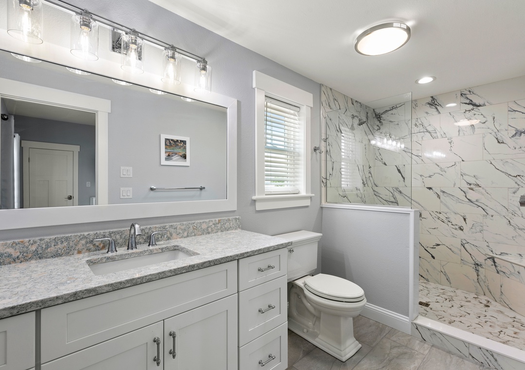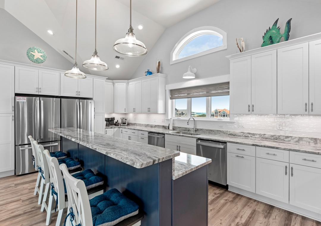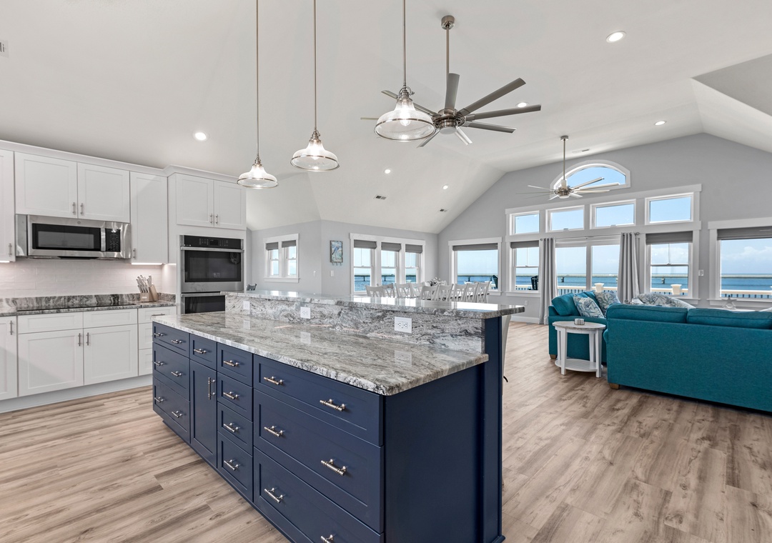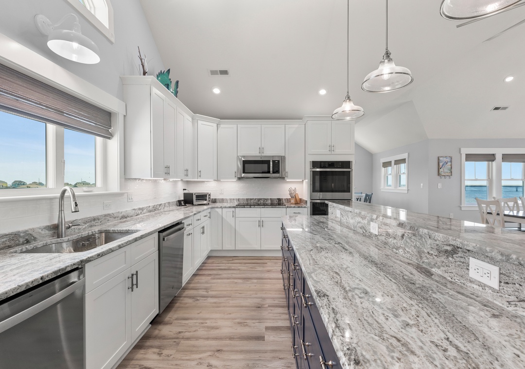 Inside, you'll find thoughtfully selected high-end finishes including marble, granite and hardwood flooring throughout. The main gathering space on the top level is designed for entertainment and spending time with loved ones, with a wall of west-facing windows showcasing the panoramic sound views. The gourmet kitchen is a chef's dream, with a large center island for plenty of prep space that looks out over the open-concept great room for socializing and admire the view while cooking. Two refrigerators will easily store everyone's provisions, and two dishwashers make cleaning up for large groups a breeze.