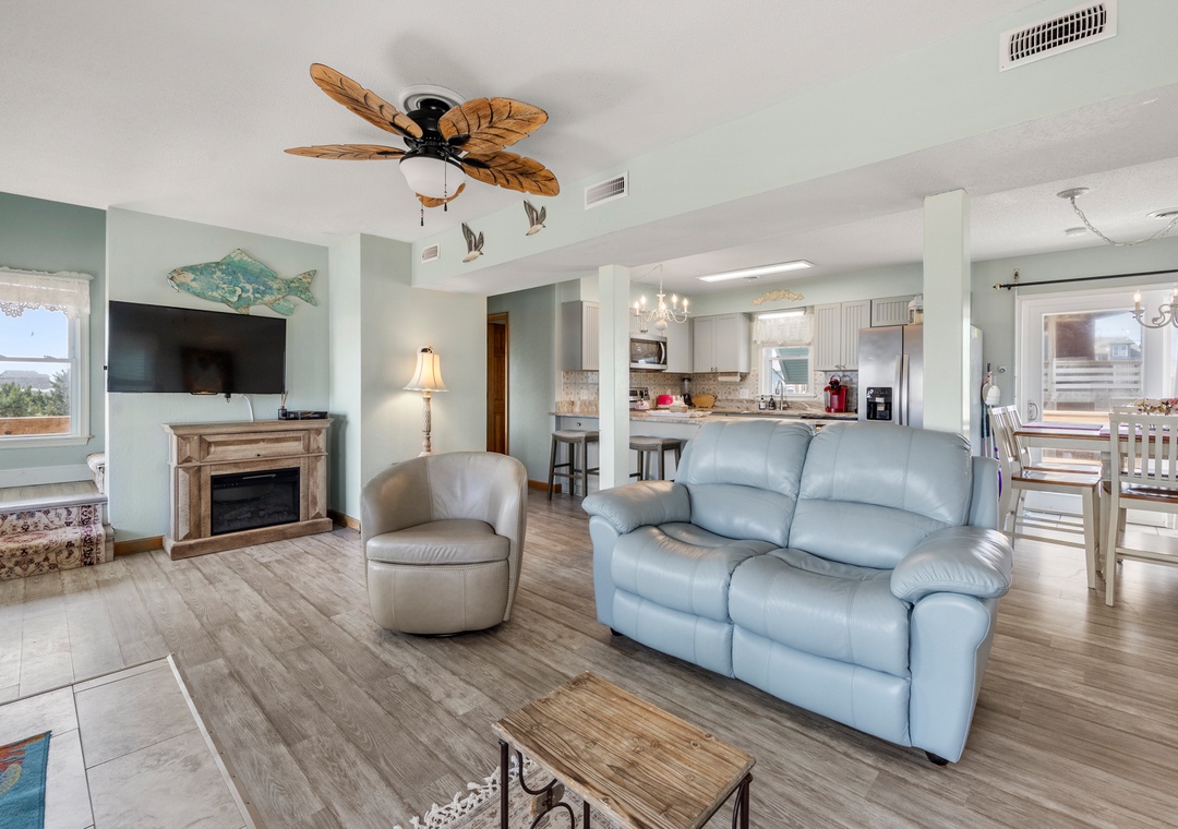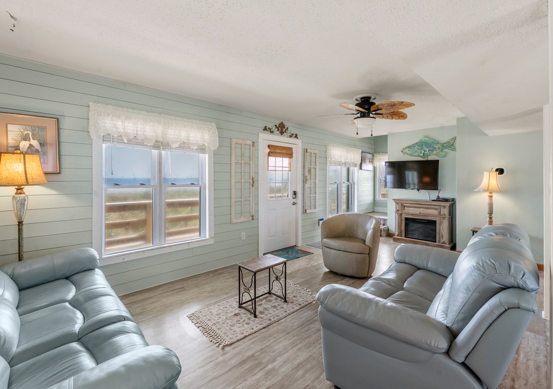 A traditional wrap-around porch on the main level is the perfect place to relax in the shade while admiring the ocean view and enjoying the salty breeze. Inside, the ocean view continues from the spacious great room with plenty of seating and a cozy electric fireplace. The open-concept layout with sightlines from front to back makes the main level an ideal space for gathering. Prepare meals in the newly remodeled kitchen with stainless steel appliances and gorgeous marble countertops. A sun deck just off the dining area is the perfect place to soak up some Vitamin D. Back inside, LVP and tile flooring flow throughout this entire pet-friendly house, ideal for sandy feet and paws returning from the beach. All three bedrooms are located upstairs, including the primary. This king suite is attached to a semi-private bath with walk-in shower. Two queen bedrooms will comfortably accommodate family and friends, who can also utilize the second full bathroom on the main level. Bed and bath linens are always included at no extra charge, and the beds will be made with fresh sheets and pillowcases prior to your arrival.