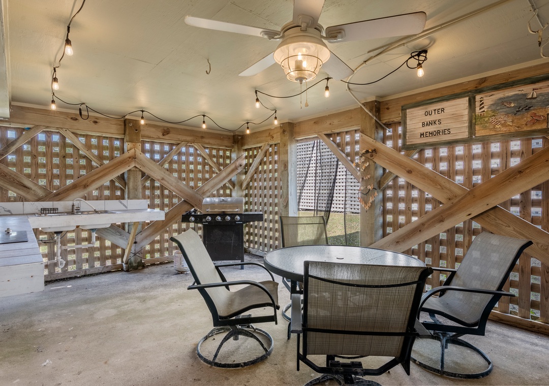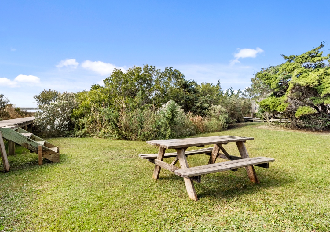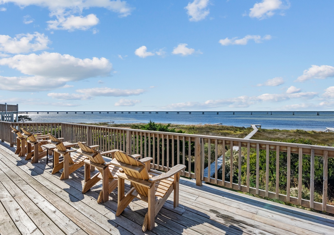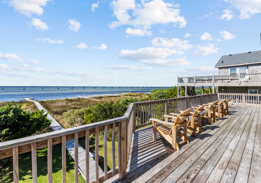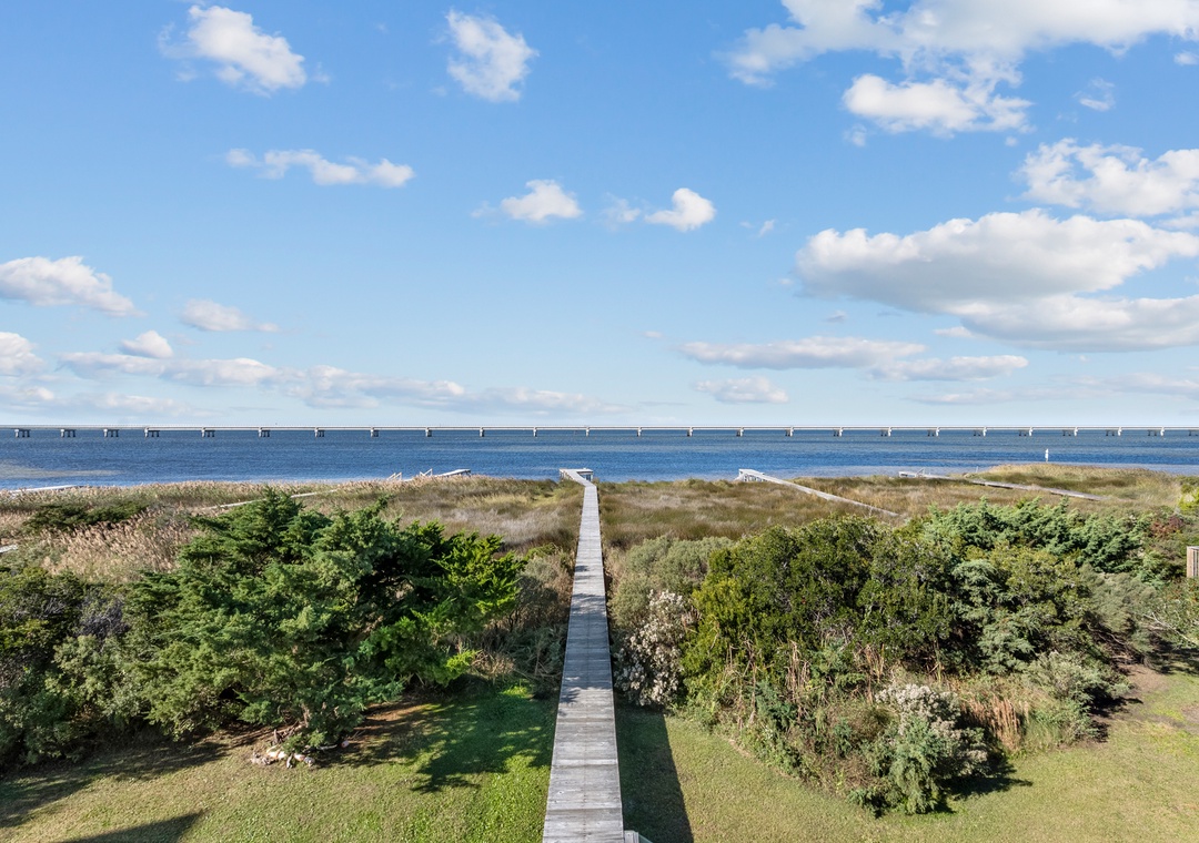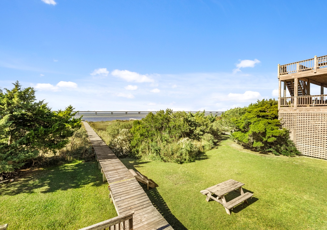 Your soundfront experience begins with your very own private pier, which includes a dock for launching craft into the Pamlico Sound. A grassy area in the backyard and covered storage space on the ground level offer plenty of room for watersports gear and beach toys. The ground level also includes an outdoor kitchen with stovetop, microwave, sink, gas grill and table with seating for effortless al fresco dining.