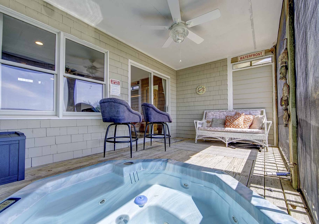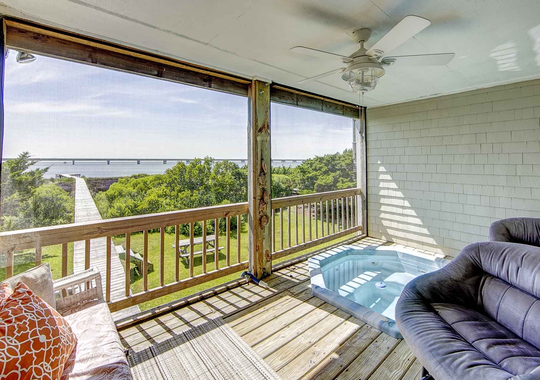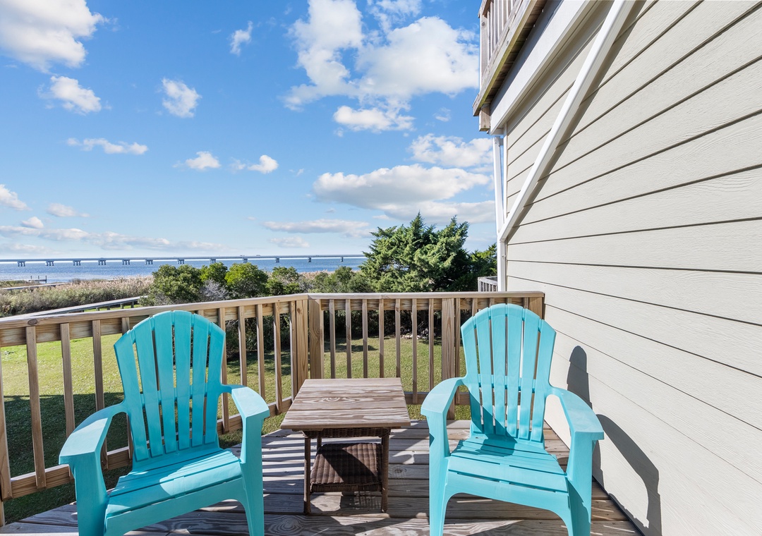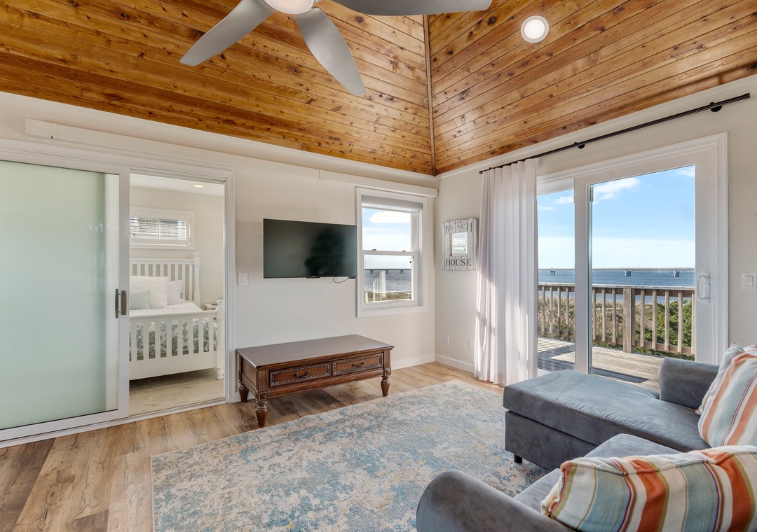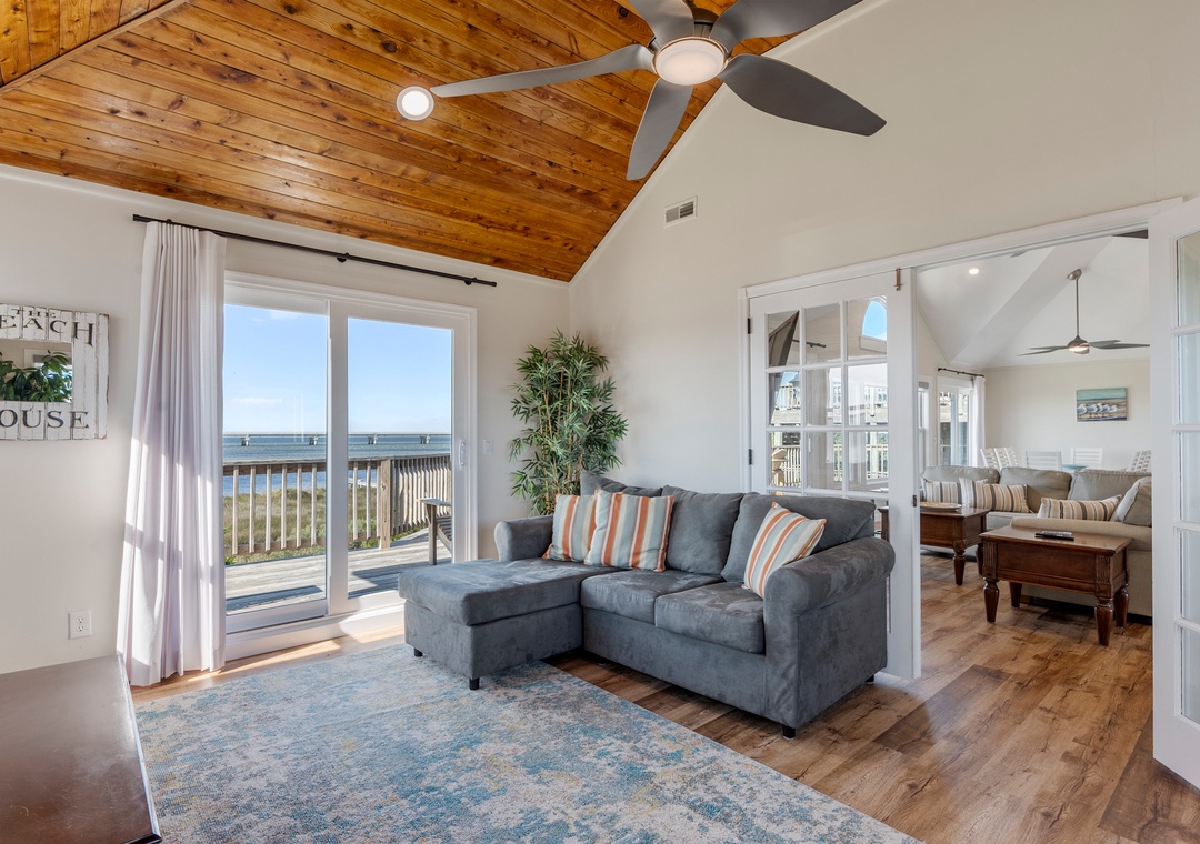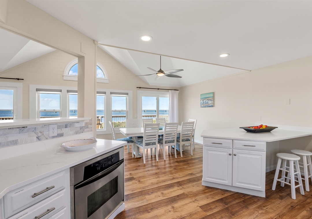 Your soundfront experience begins with your very own private pier, which includes a dock for launching craft into the Pamlico Sound. A grassy area in the backyard and covered storage space on the ground level offer plenty of room for watersports gear and beach toys. The ground level also includes an outdoor kitchen with stovetop, microwave, sink, gas grill and table with seating for effortless al fresco dining.