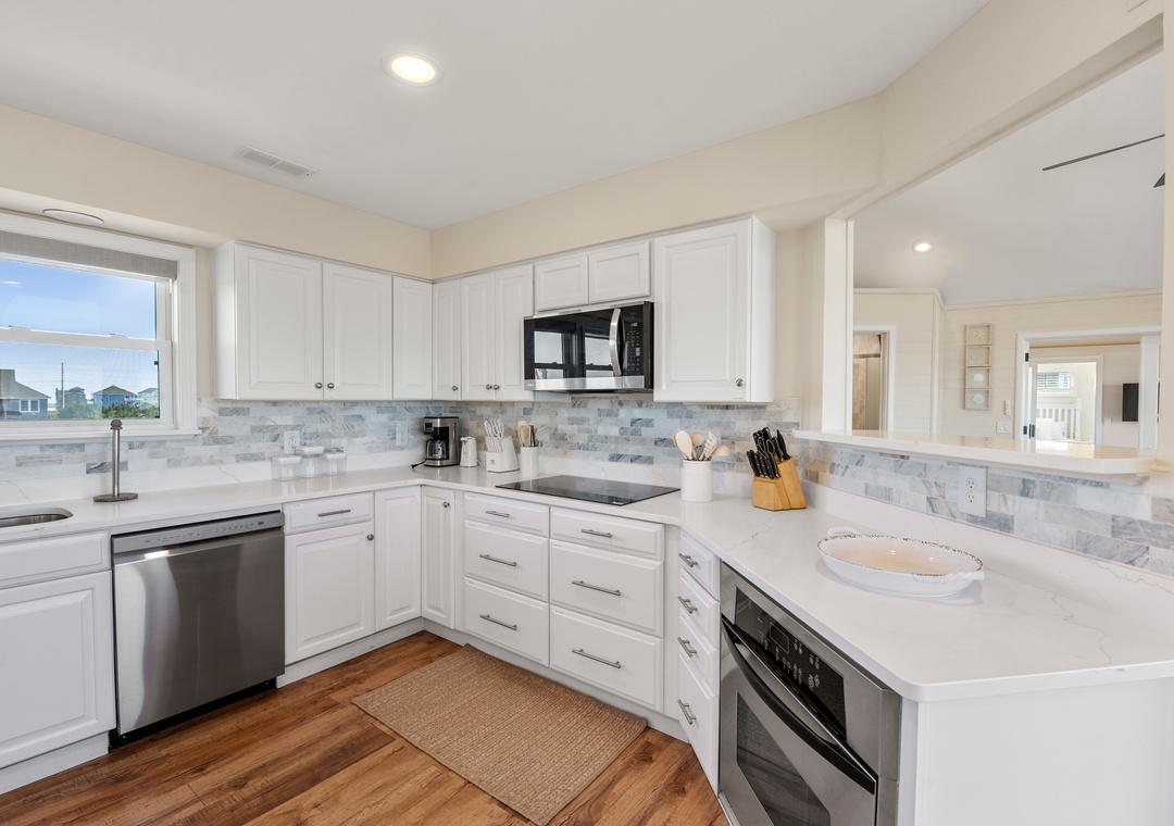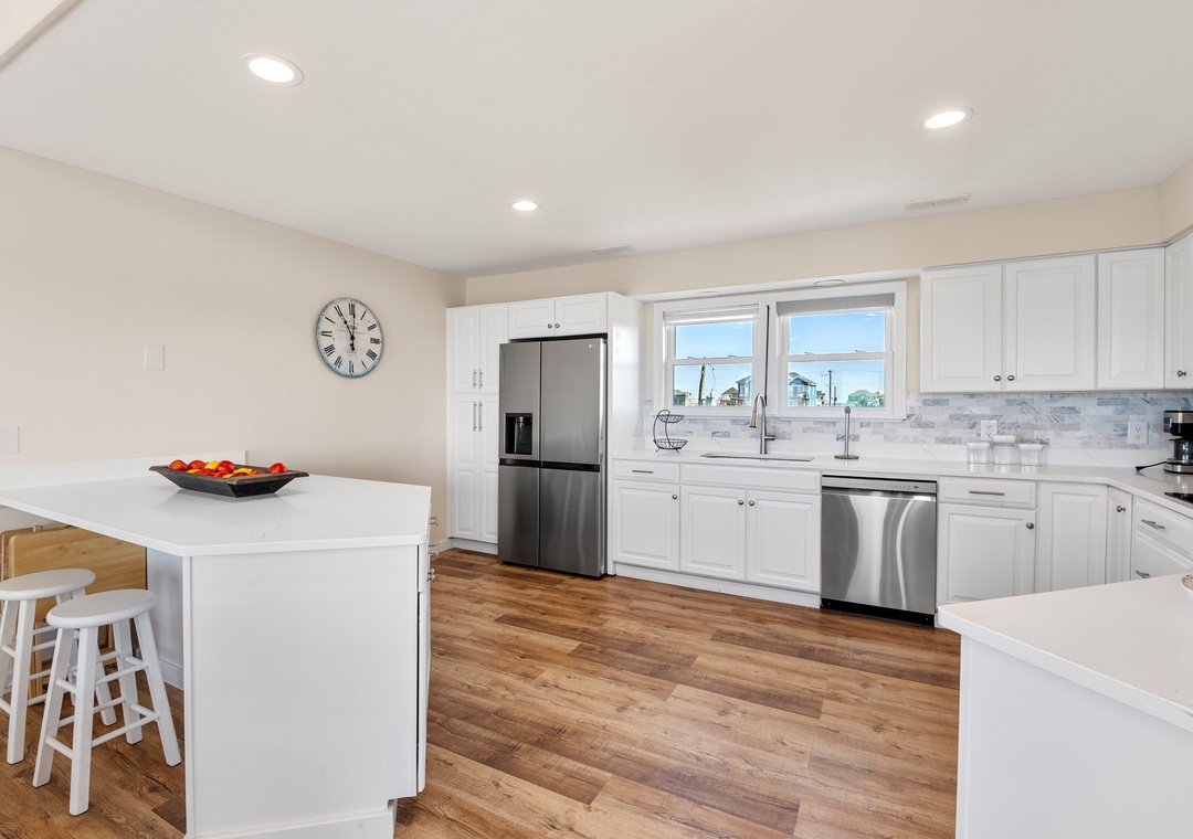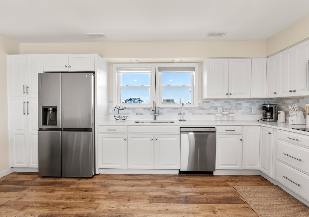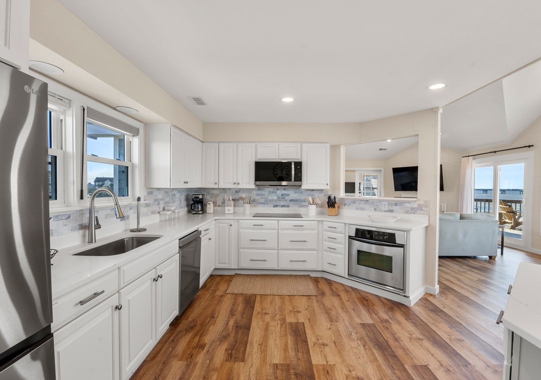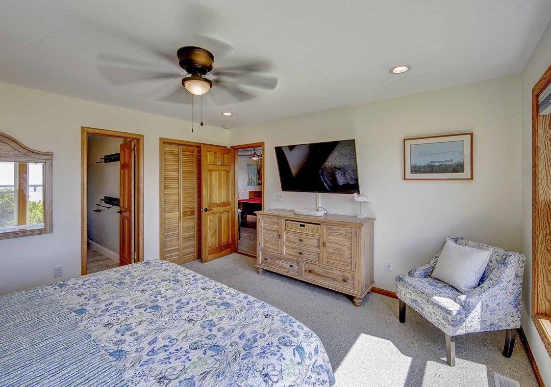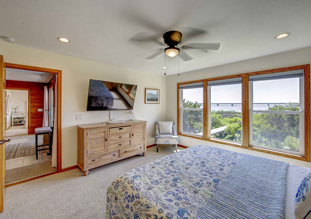 Your soundfront experience begins with your very own private pier, which includes a dock for launching craft into the Pamlico Sound. A grassy area in the backyard and covered storage space on the ground level offer plenty of room for watersports gear and beach toys. The ground level also includes an outdoor kitchen with stovetop, microwave, sink, gas grill and table with seating for effortless al fresco dining.