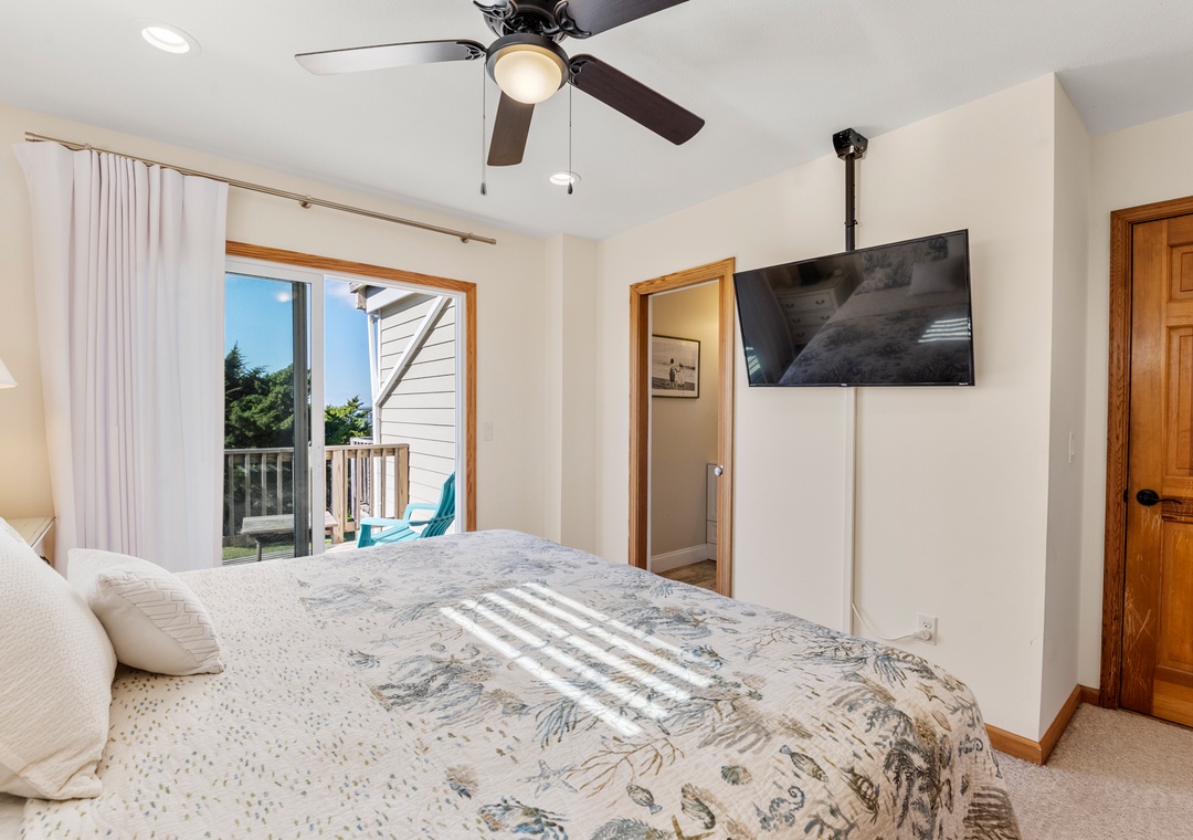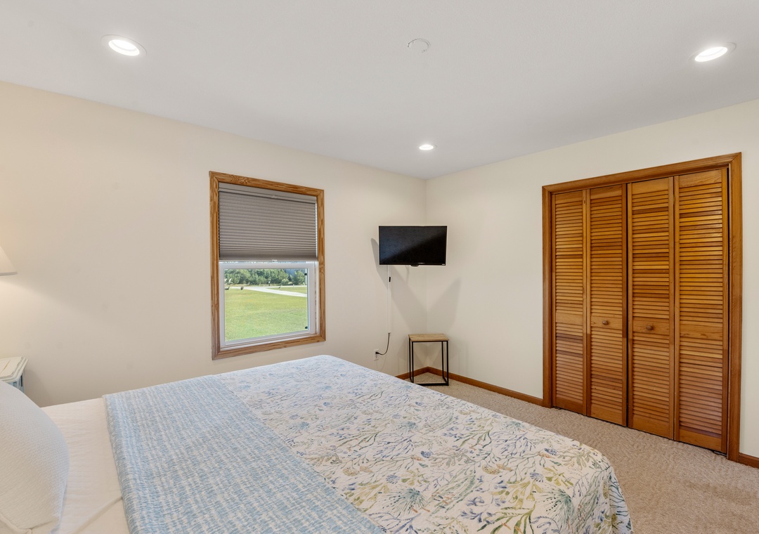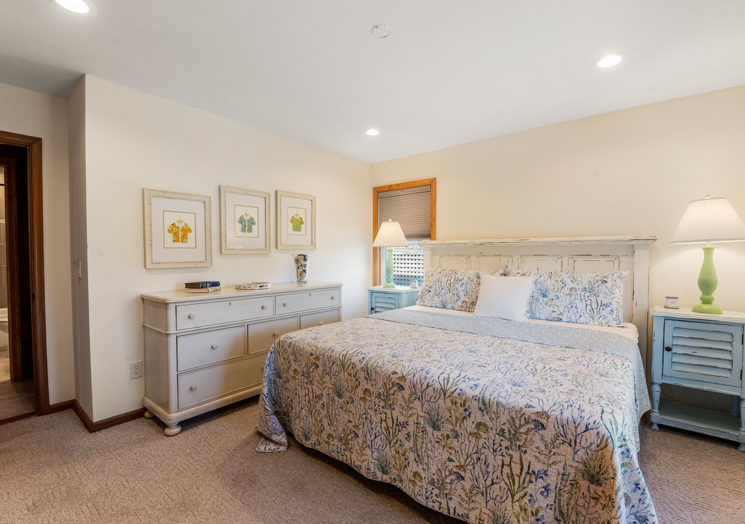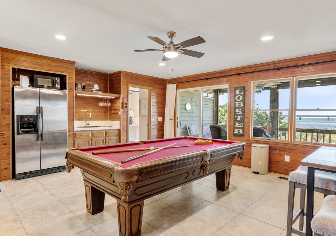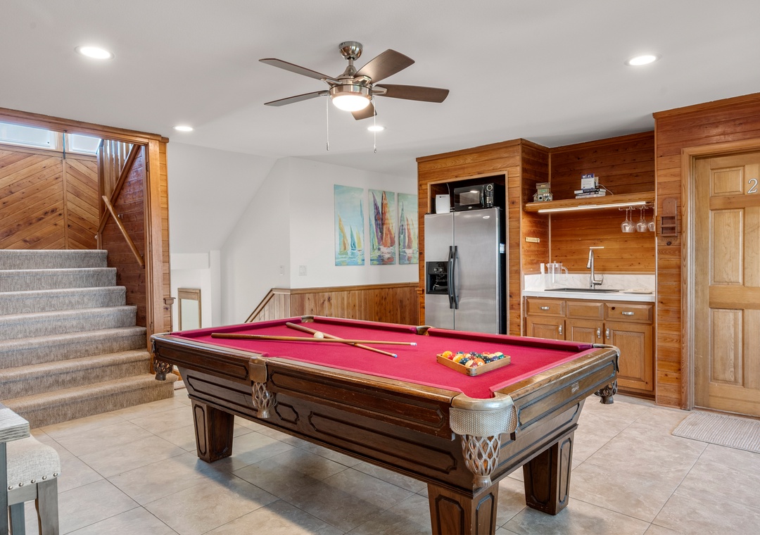 Downstairs, the mid-level consists of five additional king bedrooms, four of which are ensuite for plenty of privacy. Show off your billiard skills on the pool table in the rec room, which includes a wet bar, full-size fridge and microwave for convenient drinks and snacks. From there, you'll have direct access onto the mid-level deck where a sunken 6-person hot tub awaits you. It's the perfect place to unwind at the end of the day while watching the sun go down.