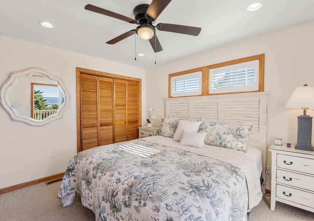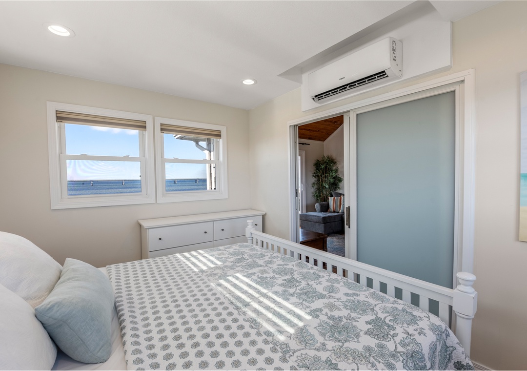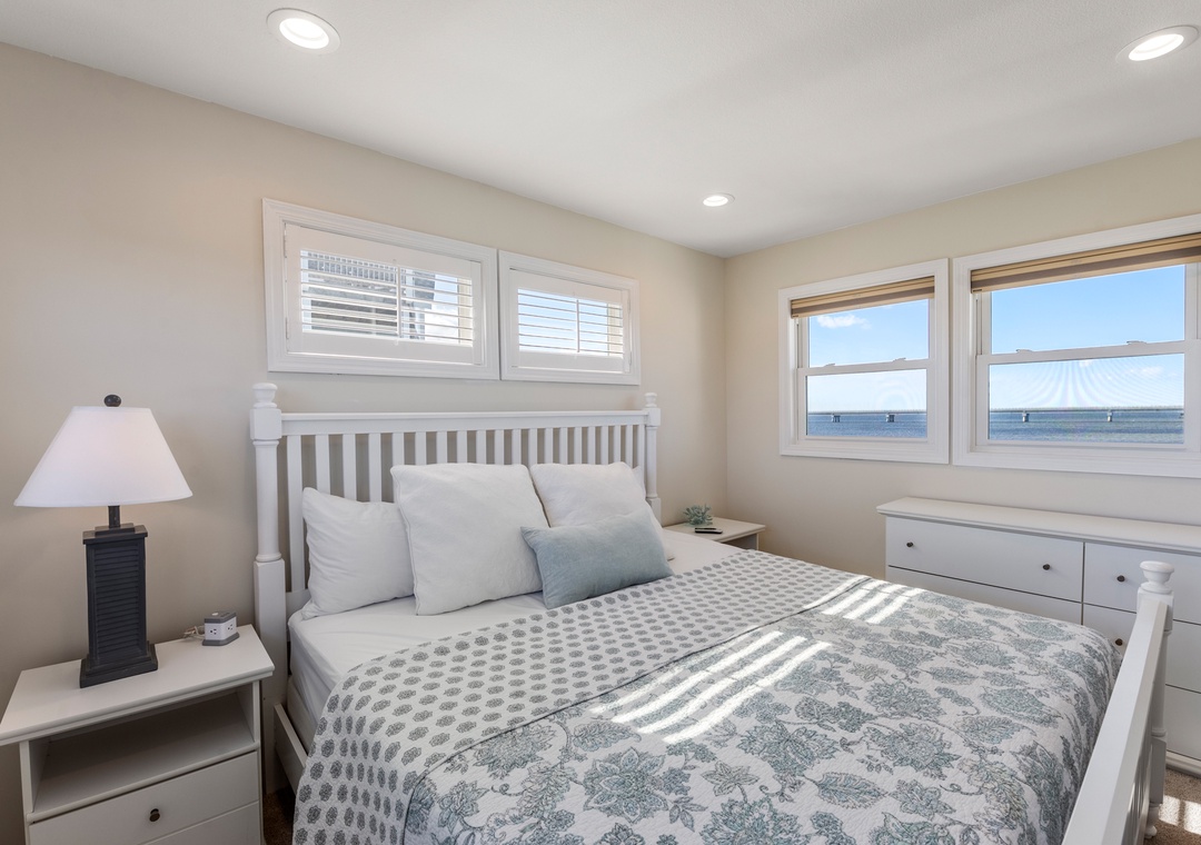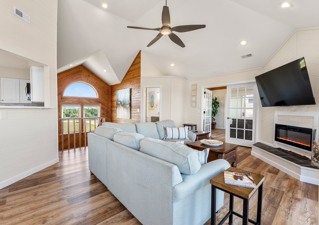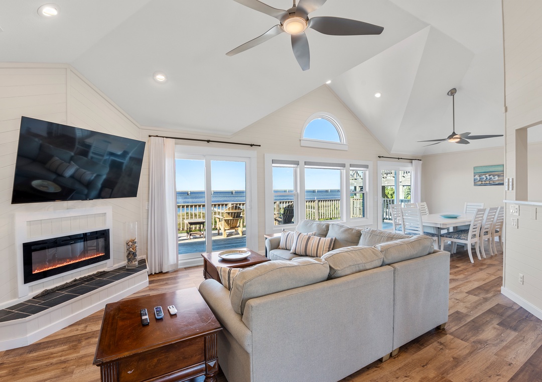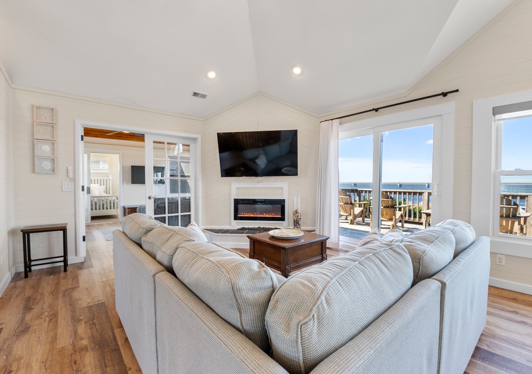 The upper levels of Windrush By The Sound are equally impressive, featuring updates and sought-after amenities throughout. A reverse floorplan makes the most of the waterfront location, with the main living area on the top floor where everyone can enjoy the unobstructed views of the sound. There's plenty of space to gather and entertain in the open-concept great room with cozy electric fireplace and a wall of west-facing windows for admiring the view. It leads out to a soundfront deck where you can soak up the sun by day or lounge under the stars at night. Back inside, the spacious and recently renovated kitchen features quartz countertops and stainless steel appliances. An island with bar seating for four plus a large dining table for eight allows everyone to sit down and enjoy meals together. Just off the living area you'll find a media room that offers the same fabulous view along with a Smart TV for watching your favorites shows, movies or the big game. The first of six king bedrooms is also located on this floor.