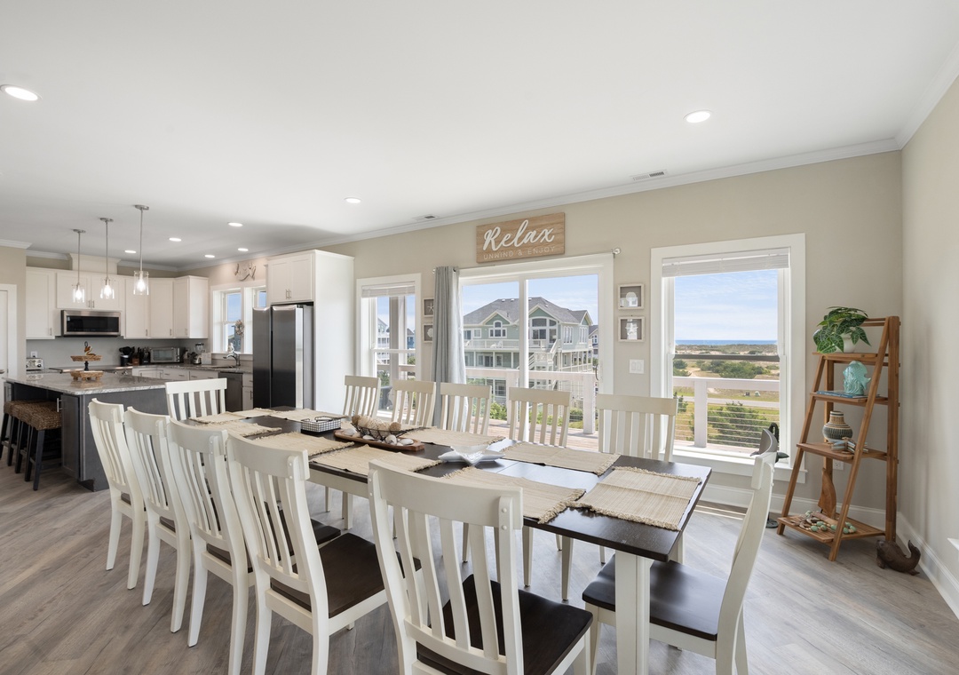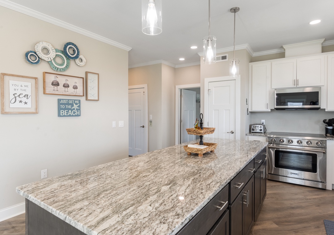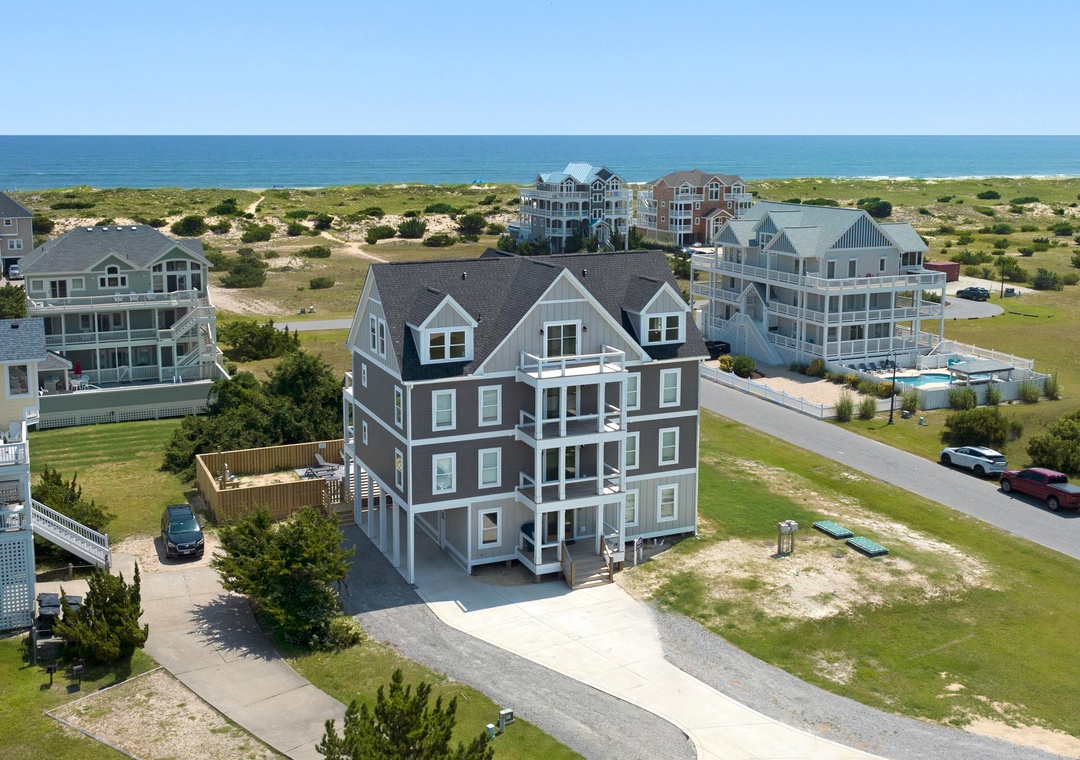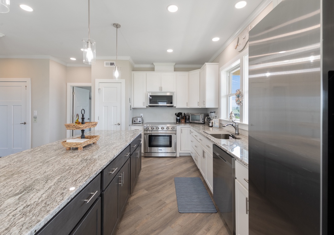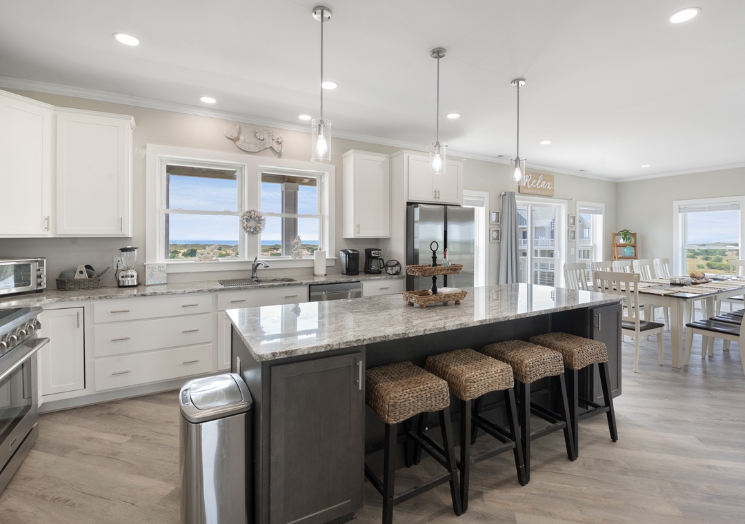 Inside, you'll have a whopping 6,400 square feet of living space - plenty of room for multiple or extended families to share. Eight bedrooms, each with ensuite baths, will give everyone in your group their own private retreat. When it's time to gather, choose from the main living area or massive rec room - there's certainly no shortage of opportunities to hang out and make memories. After a day at the beach or exploring Hatteras Island, come home and relax in the open-concept great room with panoramic views of the ocean. Meal prep can be a family affair in the brand new kitchen featuring stainless steel appliances, including a Thor range.