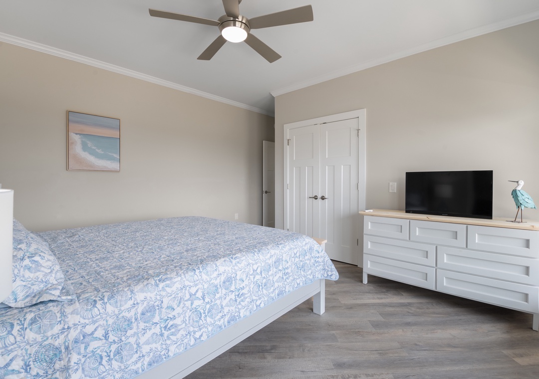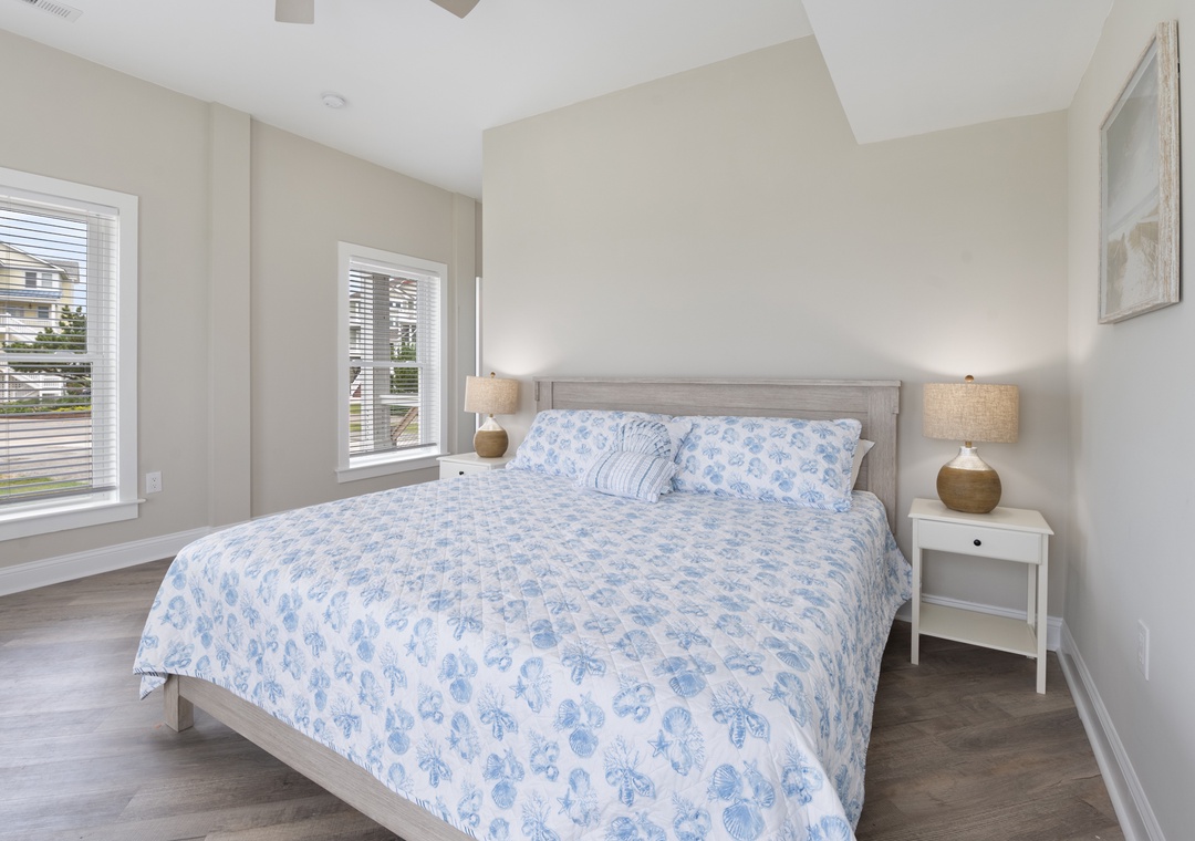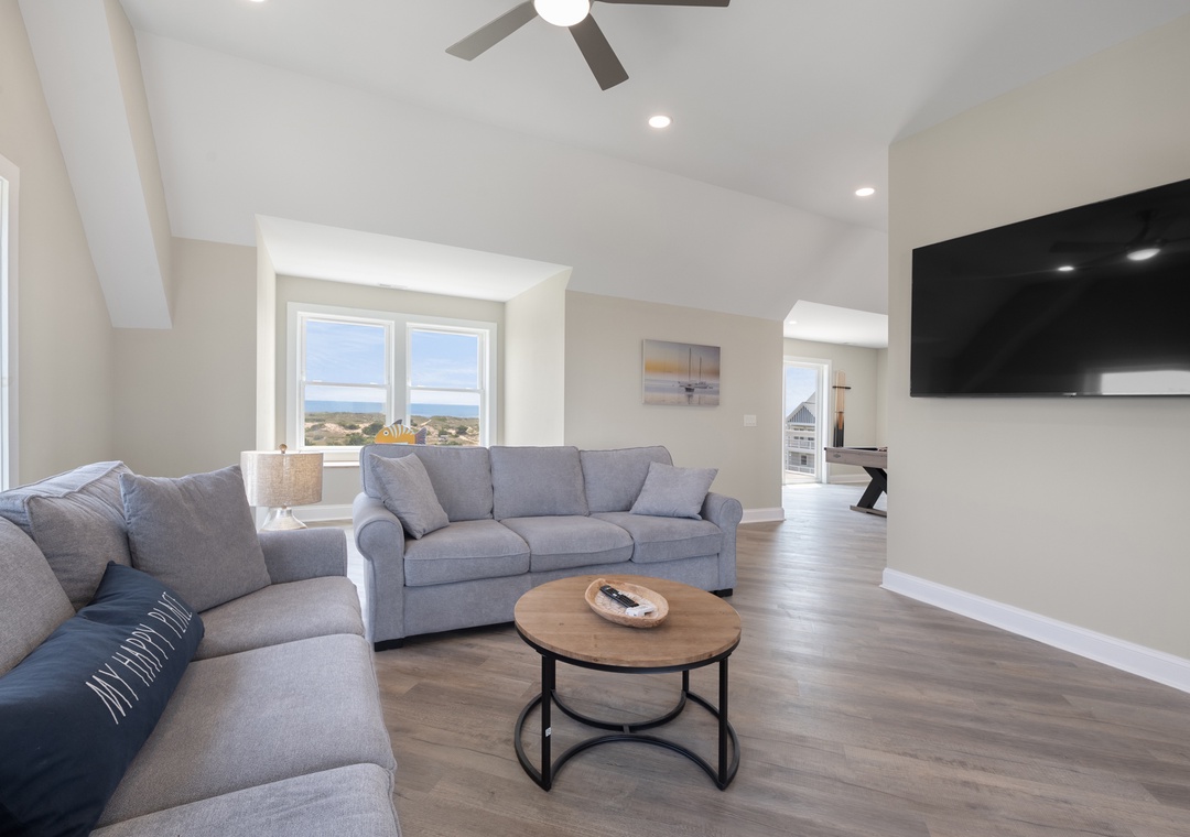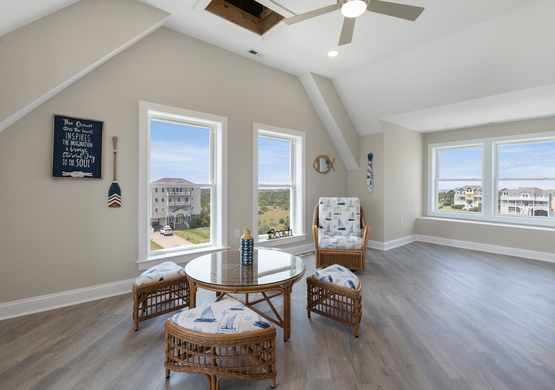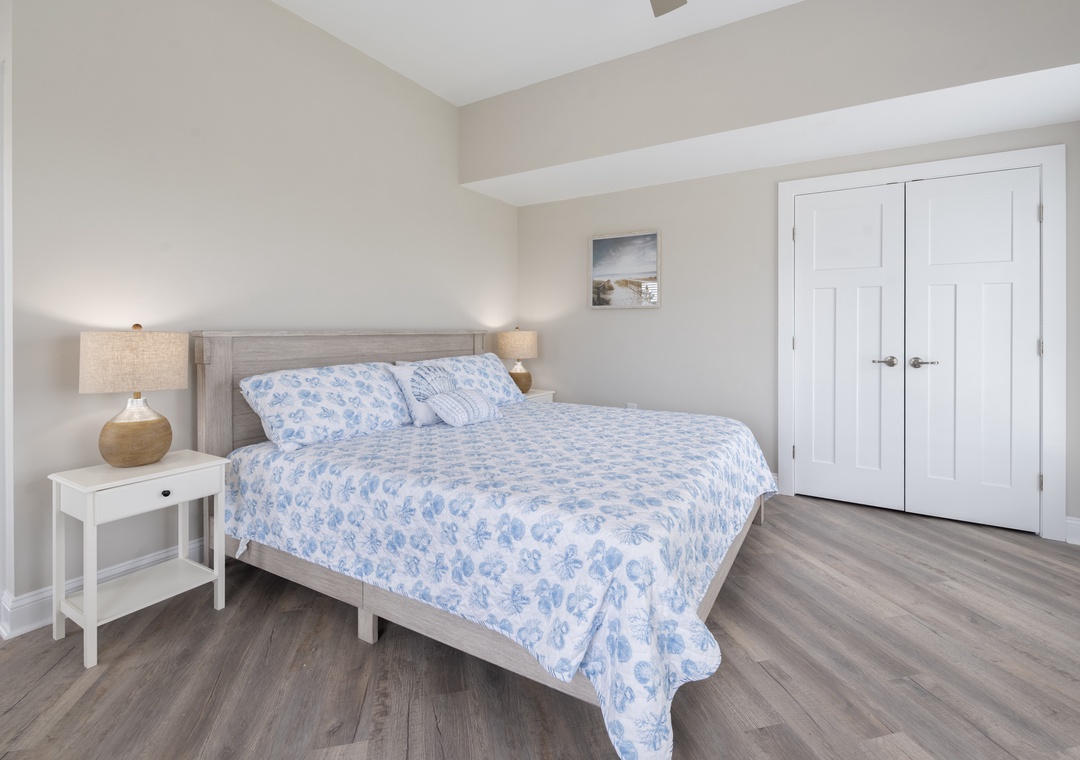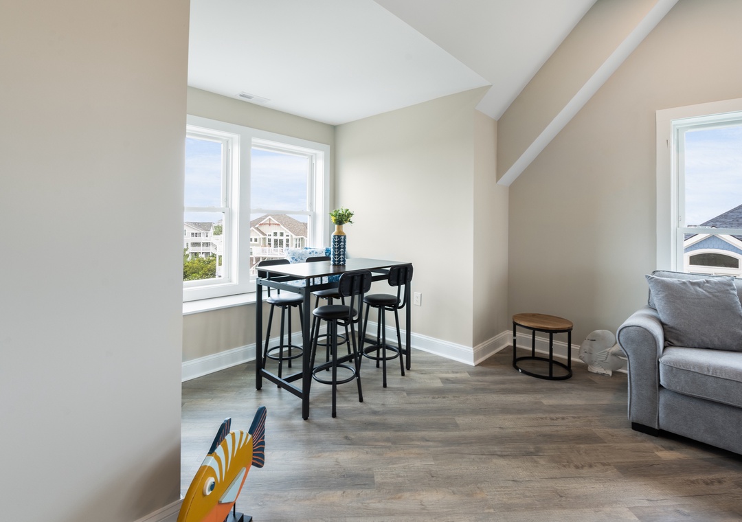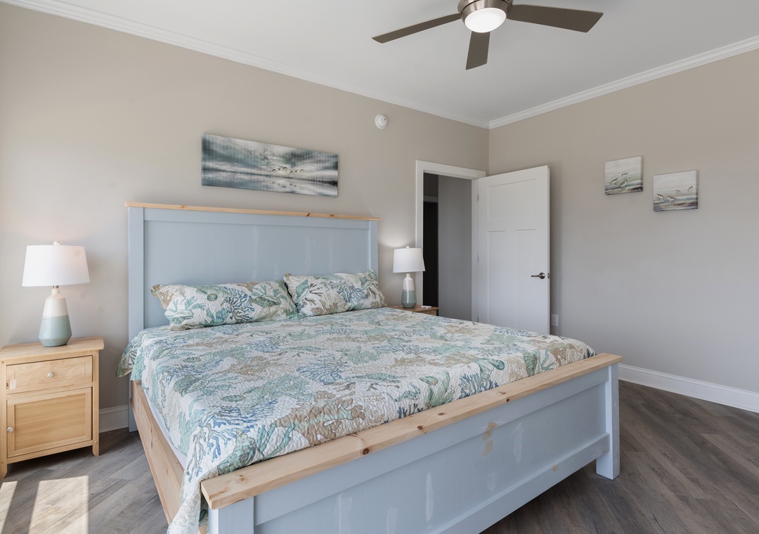After dinner, head upstairs and let the good times roll in the top-level party room. The entire fourth floor is dedicated to this expansive entertainment space, furnished with a pool table, pub tables, seating and the best ocean view in the house. Downstairs, watch the big game or host a movie night in the den with comfortable seating and a large TV. Prepare your concessions using the kitchenette equipped with a full-size refrigerator, ice maker and microwave. Grey Pearl Villa features an elevator, ideal for guests with mobility issues. Skip the stairs and use it to send luggage and groceries to the upper levels. One of the two king suites on the ground level includes a private bath with roll-in shower. Bed and bath linens are always included at no extra charge, and the beds will be made with fresh sheets and pillowcases prior to your arrival.