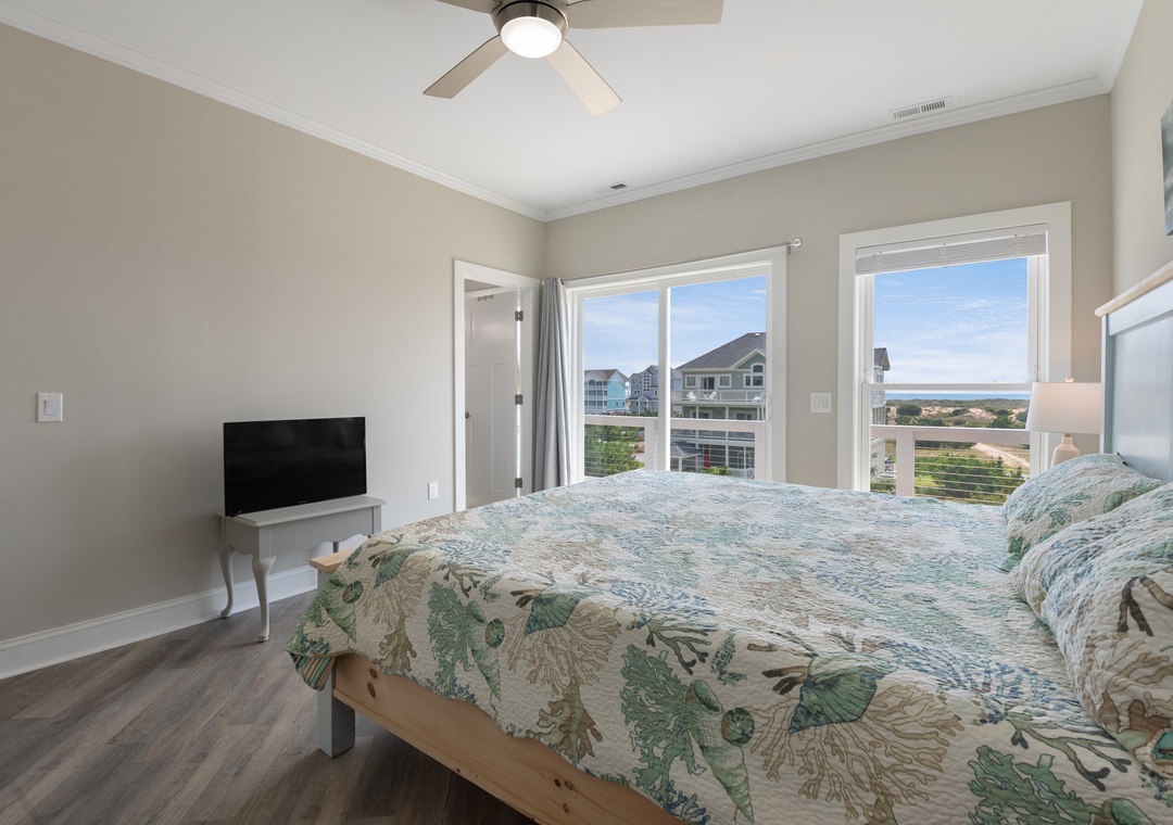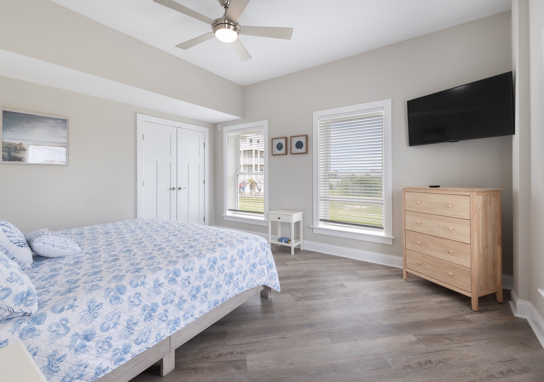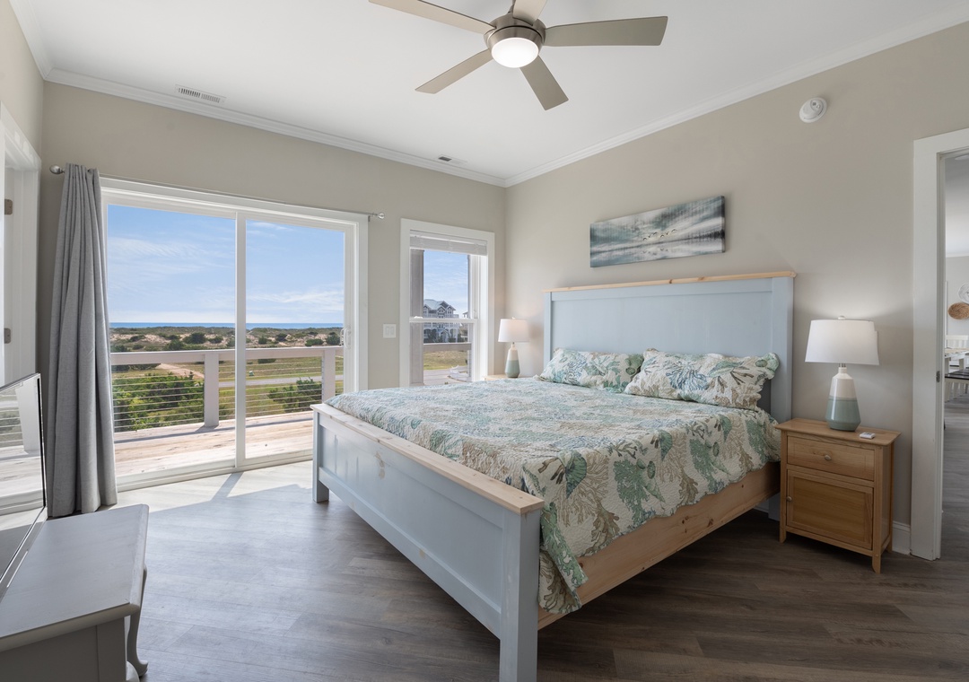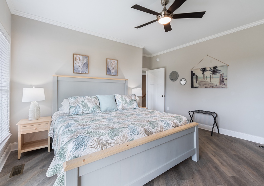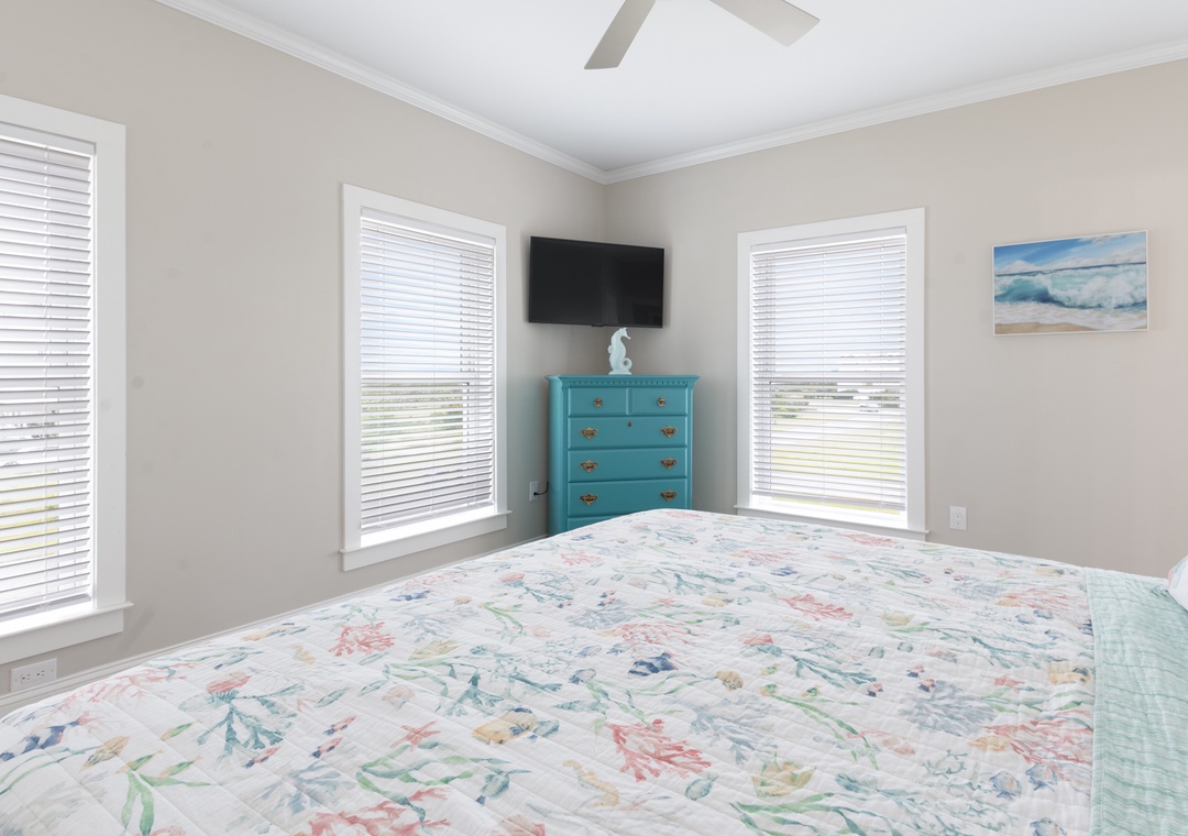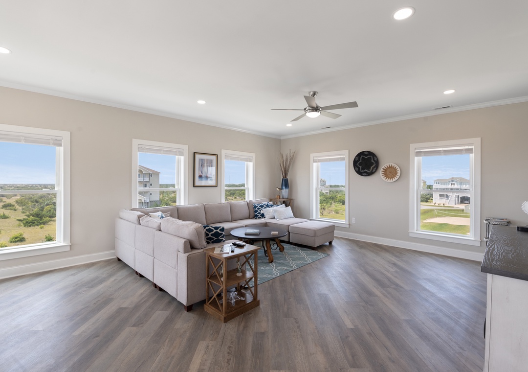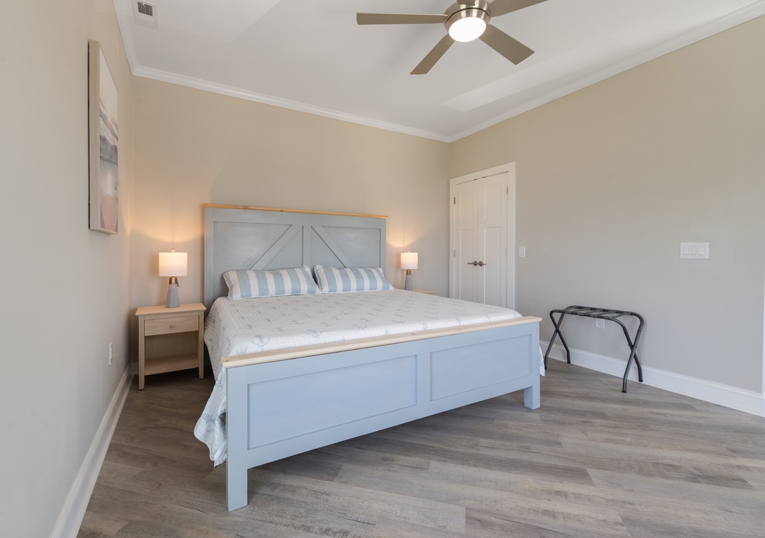 After dinner, head upstairs and let the good times roll in the top-level party room. The entire fourth floor is dedicated to this expansive entertainment space, furnished with a pool table, pub tables, seating and the best ocean view in the house. Downstairs, watch the big game or host a movie night in the den with comfortable seating and a large TV. Prepare your concessions using the kitchenette equipped with a full-size refrigerator, ice maker and microwave. Grey Pearl Villa features an elevator, ideal for guests with mobility issues. Skip the stairs and use it to send luggage and groceries to the upper levels. One of the two king suites on the ground level includes a private bath with roll-in shower. Bed and bath linens are always included at no extra charge, and the beds will be made with fresh sheets and pillowcases prior to your arrival.