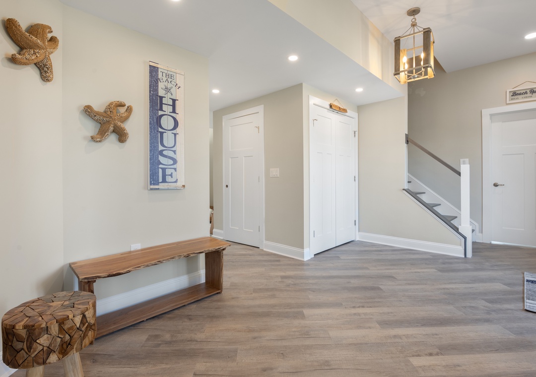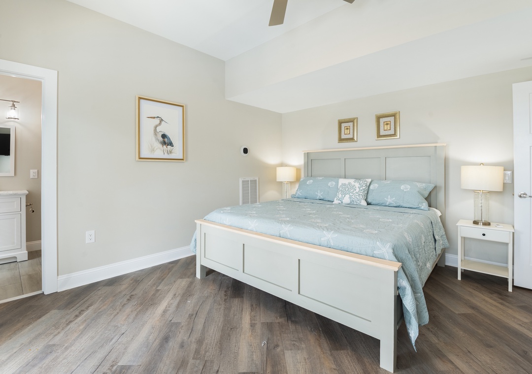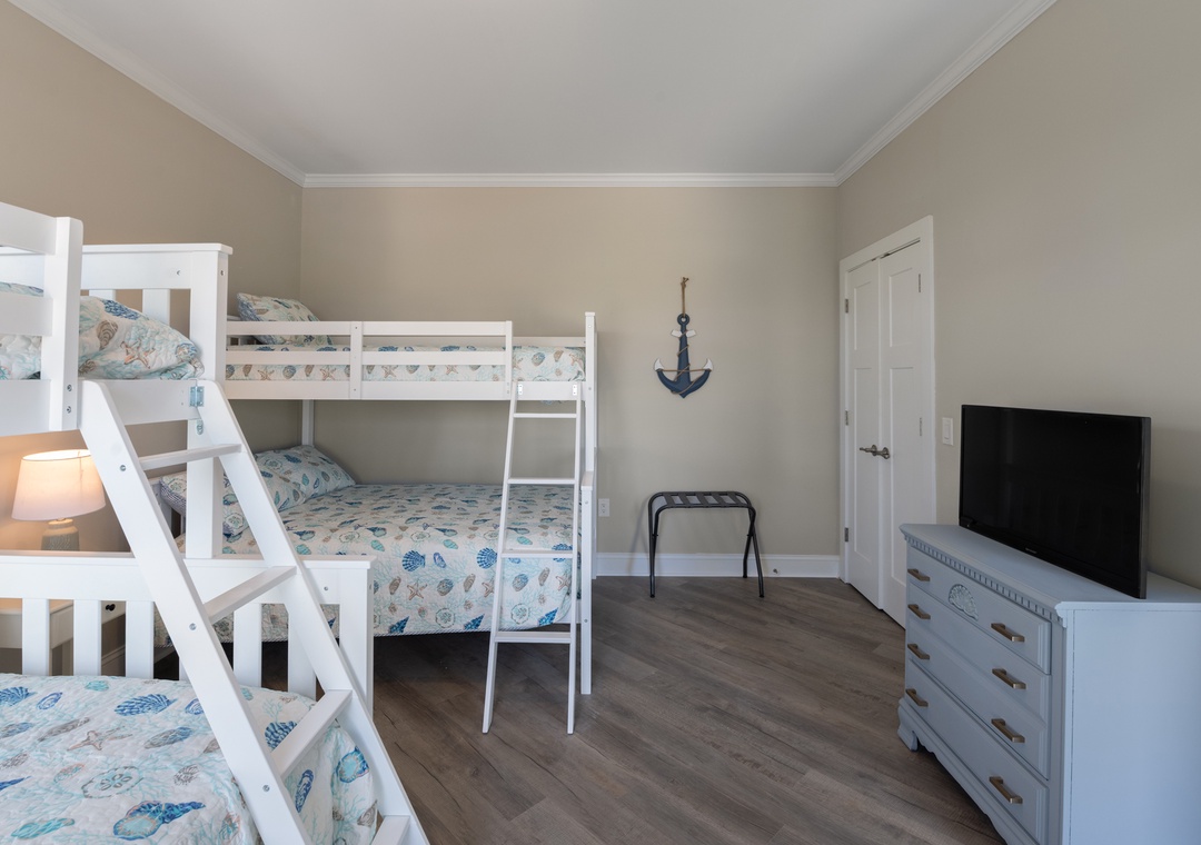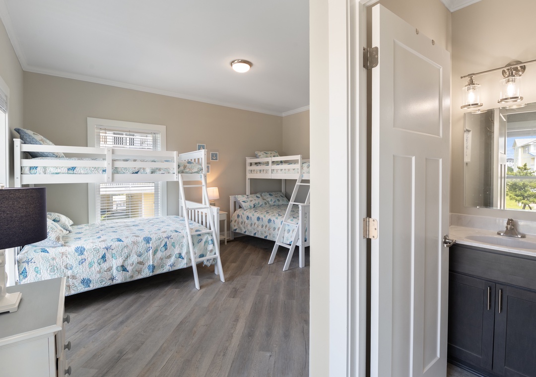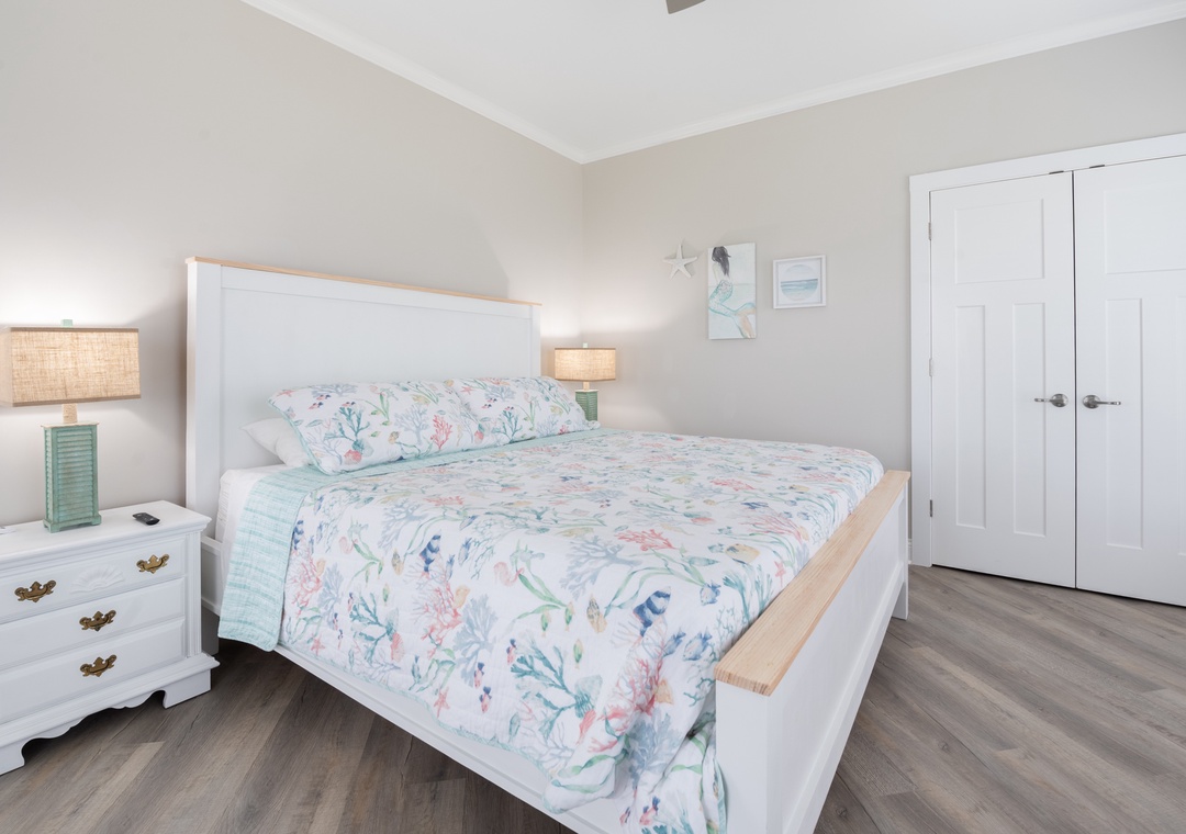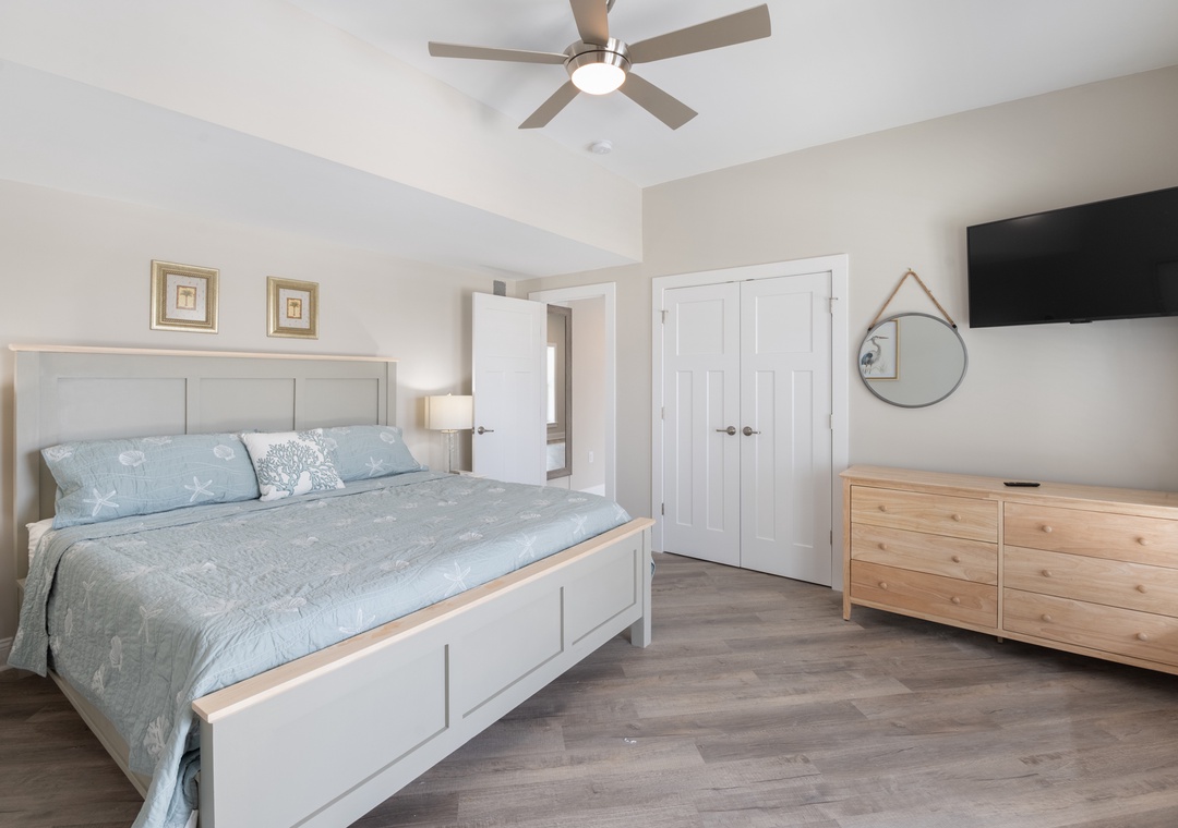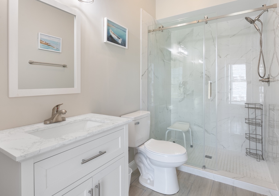 After dinner, head upstairs and let the good times roll in the top-level party room. The entire fourth floor is dedicated to this expansive entertainment space, furnished with a pool table, pub tables, seating and the best ocean view in the house. Downstairs, watch the big game or host a movie night in the den with comfortable seating and a large TV. Prepare your concessions using the kitchenette equipped with a full-size refrigerator, ice maker and microwave. Grey Pearl Villa features an elevator, ideal for guests with mobility issues. Skip the stairs and use it to send luggage and groceries to the upper levels. One of the two king suites on the ground level includes a private bath with roll-in shower. Bed and bath linens are always included at no extra charge, and the beds will be made with fresh sheets and pillowcases prior to your arrival.