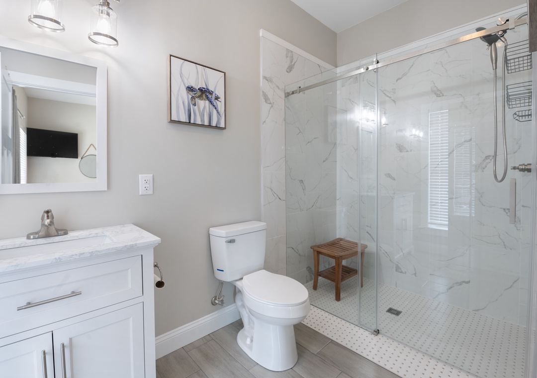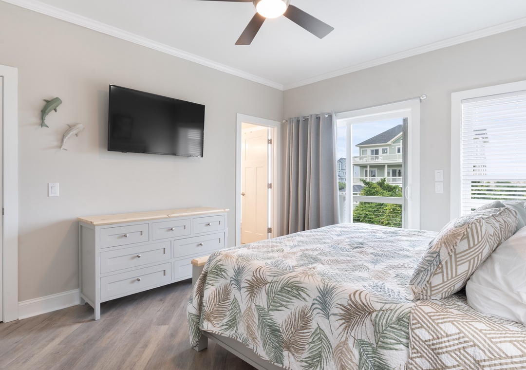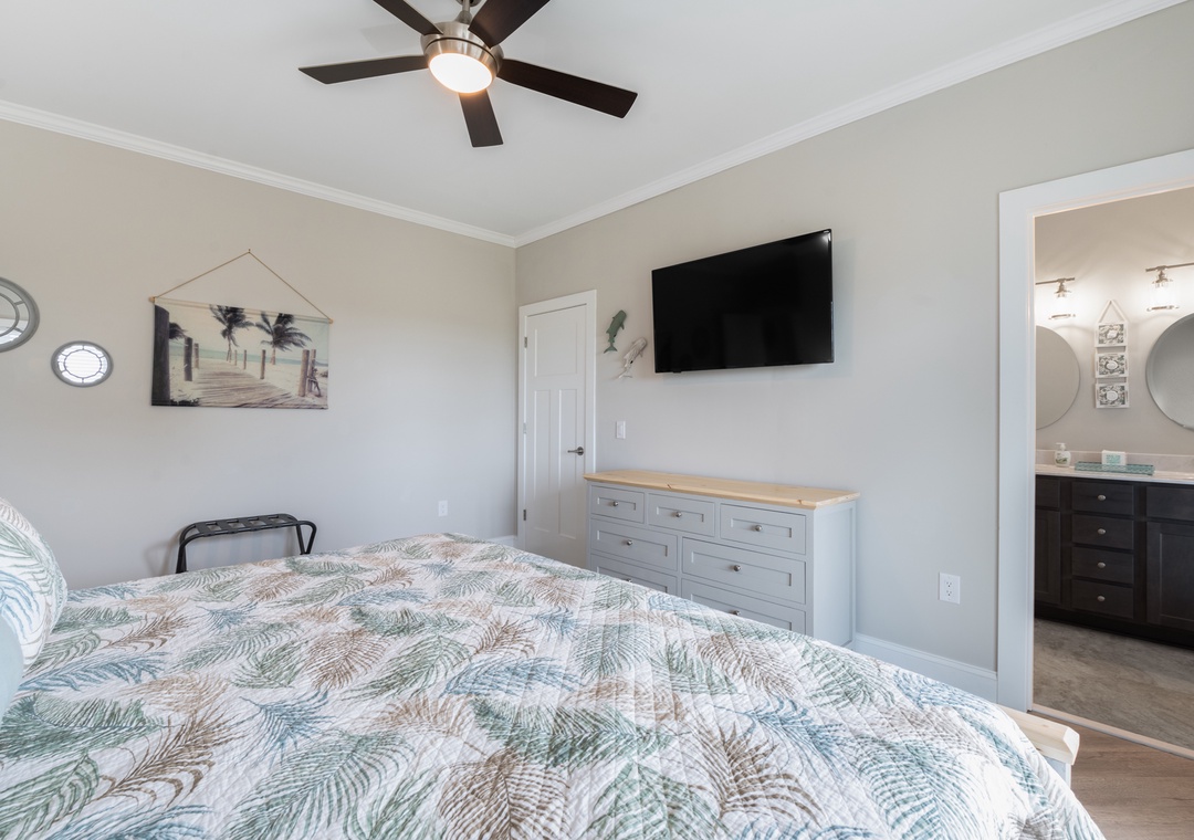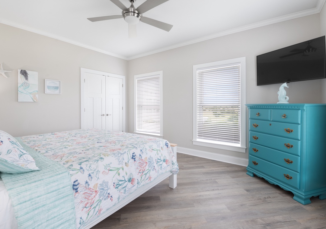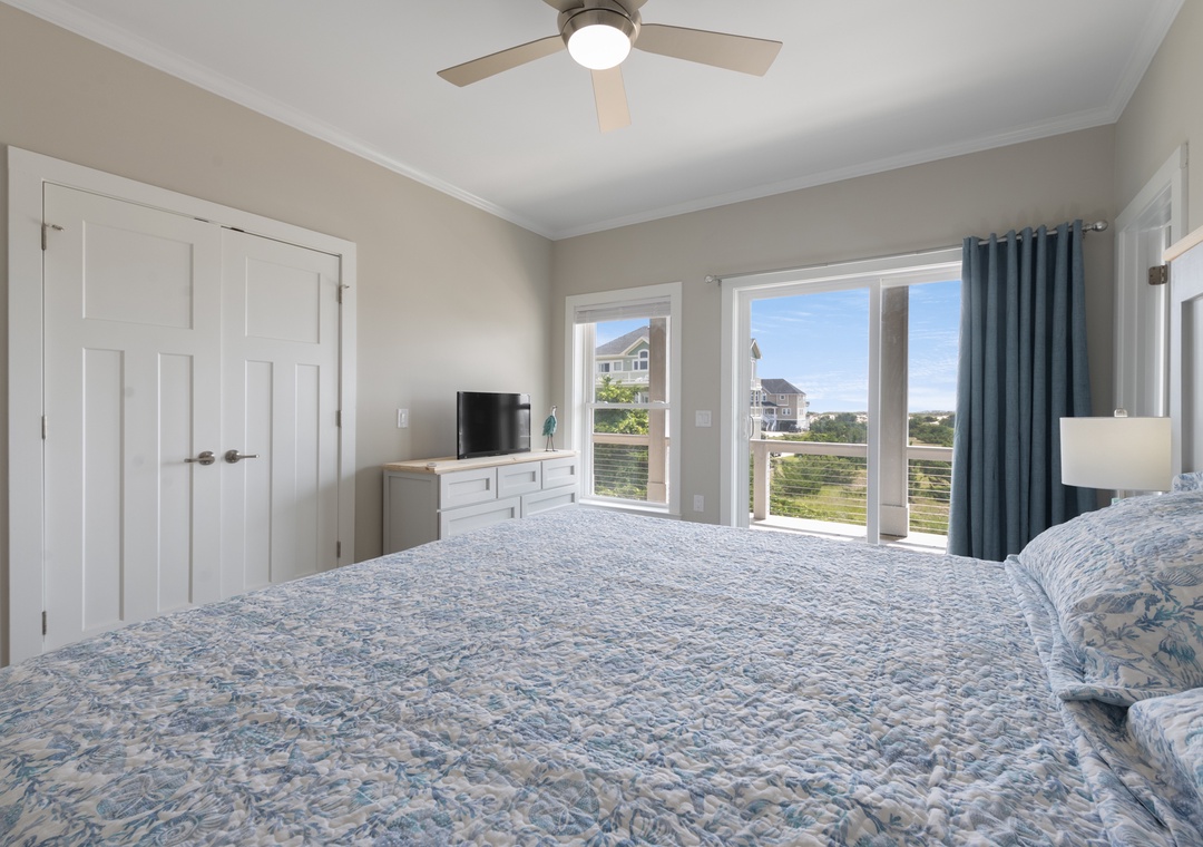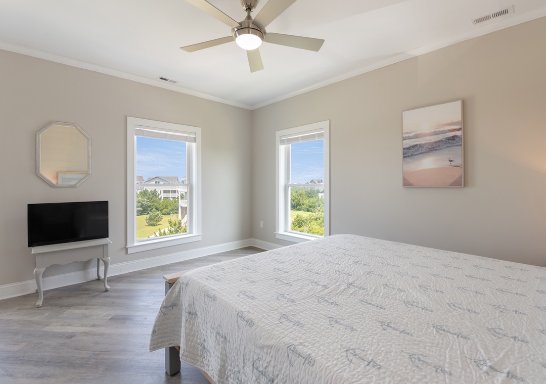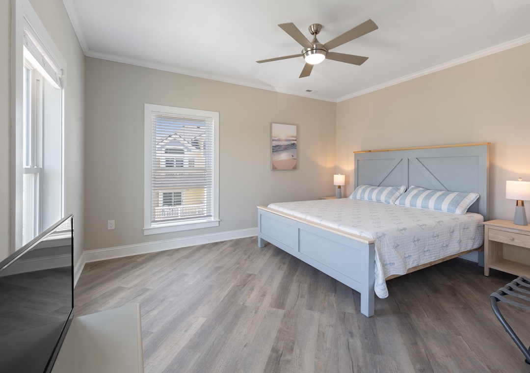 After dinner, head upstairs and let the good times roll in the top-level party room. The entire fourth floor is dedicated to this expansive entertainment space, furnished with a pool table, pub tables, seating and the best ocean view in the house. Downstairs, watch the big game or host a movie night in the den with comfortable seating and a large TV. Prepare your concessions using the kitchenette equipped with a full-size refrigerator, ice maker and microwave. Grey Pearl Villa features an elevator, ideal for guests with mobility issues. Skip the stairs and use it to send luggage and groceries to the upper levels. One of the two king suites on the ground level includes a private bath with roll-in shower. Bed and bath linens are always included at no extra charge, and the beds will be made with fresh sheets and pillowcases prior to your arrival.