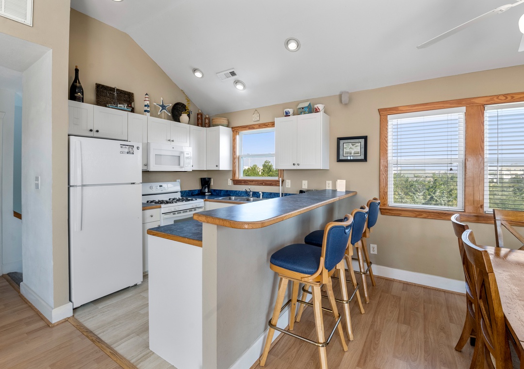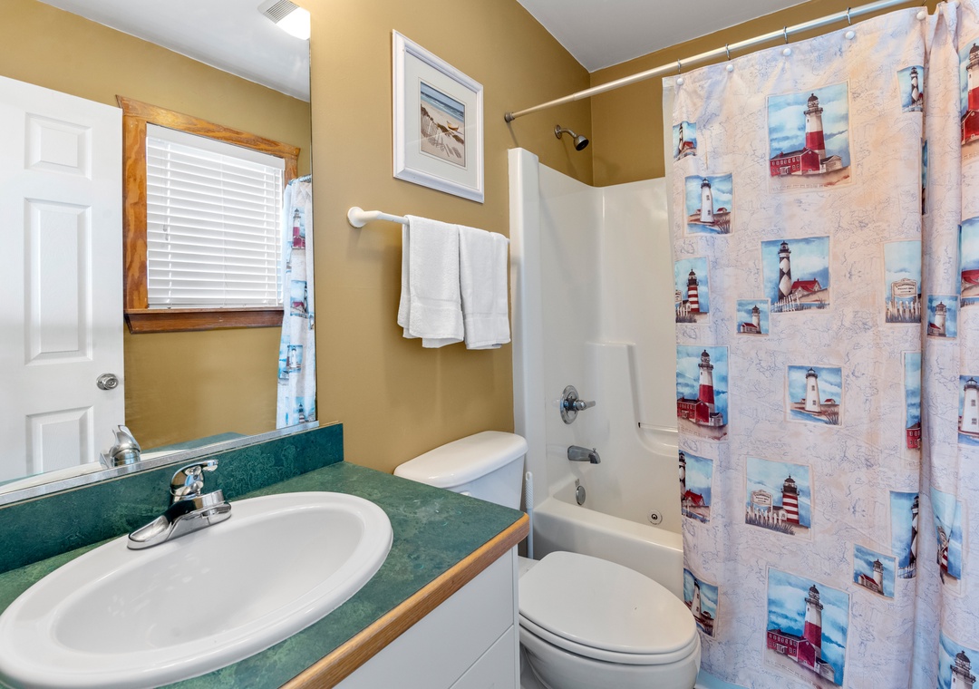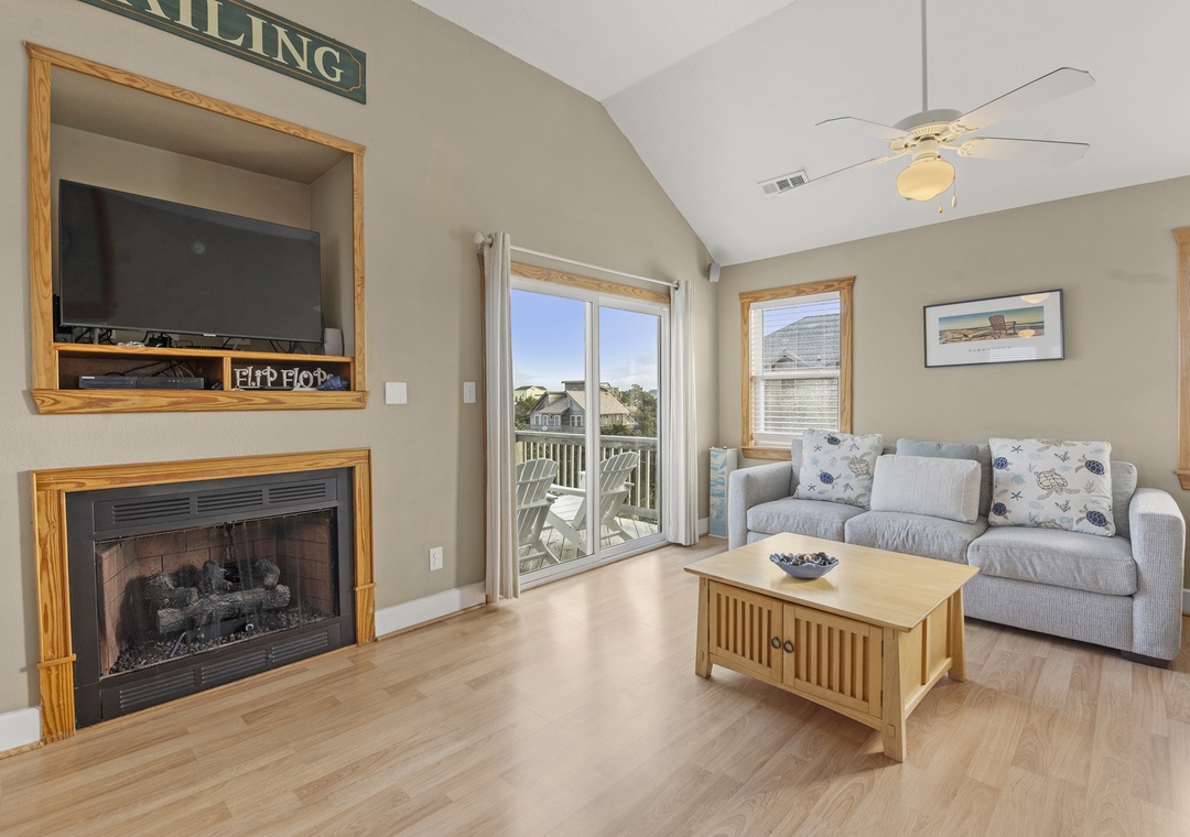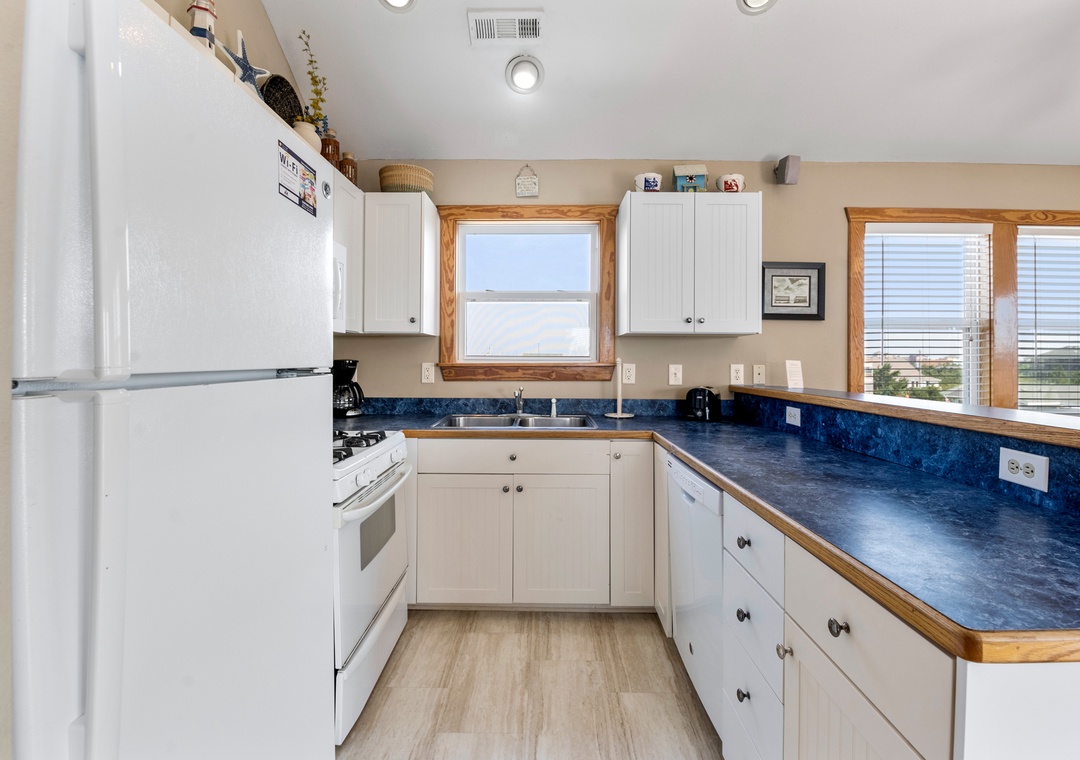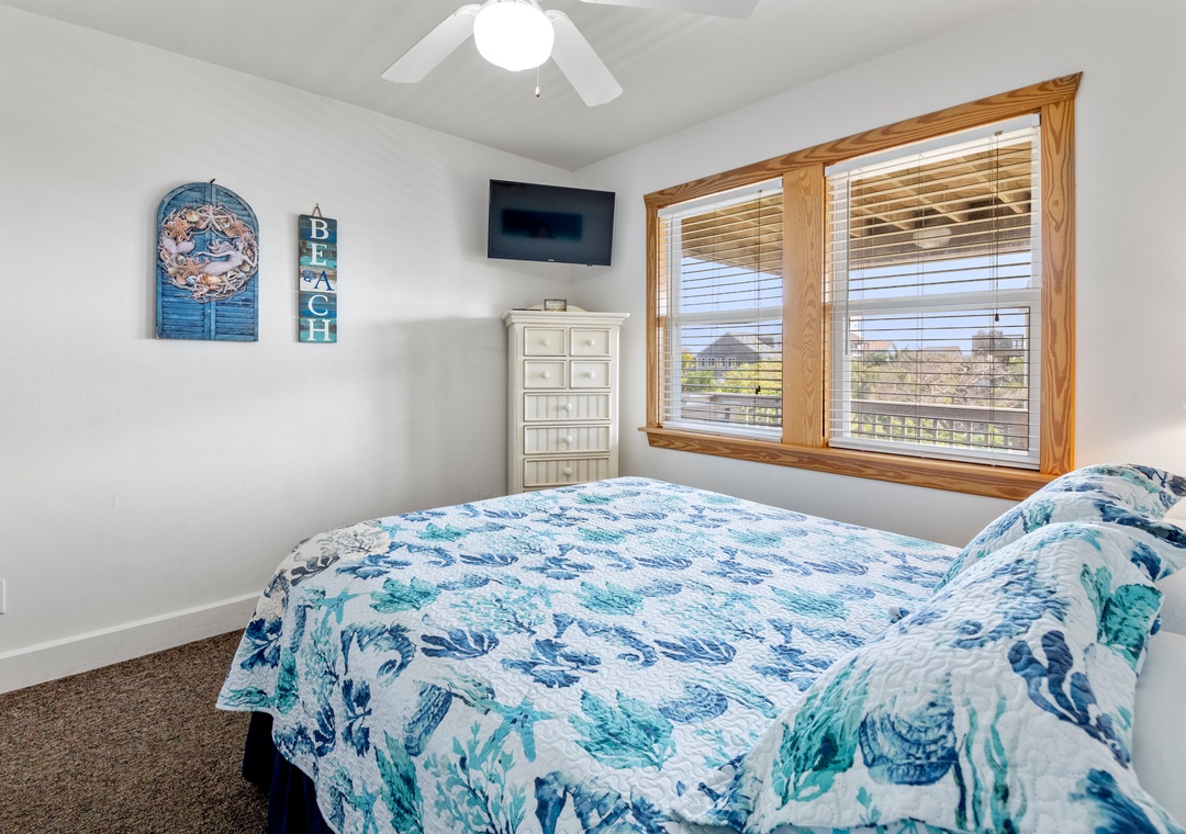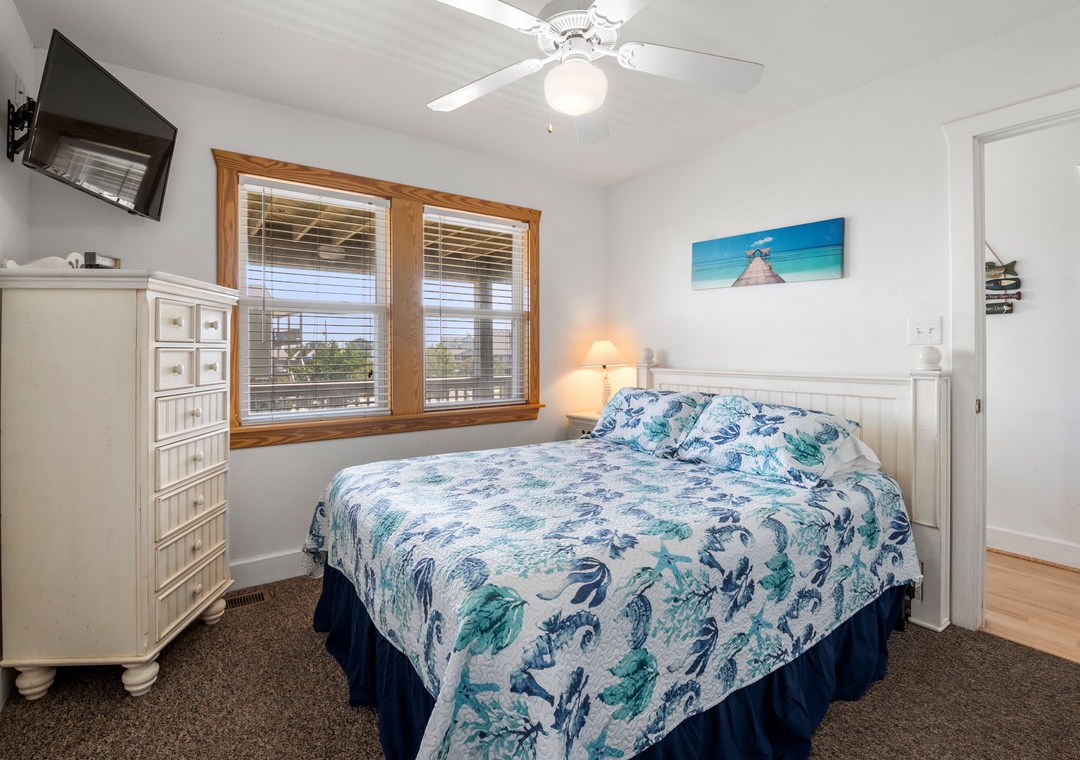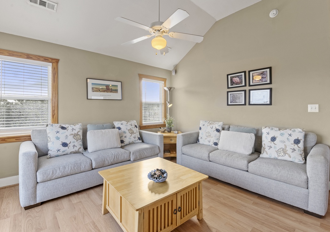 Sea Breeze Blue features a reverse floor plan with an open-concept living, dining and kitchen area on the top level. Watch a family movie on the TV with surround sound or snuggle up in front of the gas fireplace on cool spring or autumn nights. In warmer weather, sip a glass of sweet tea on the screened porch while listening to the ocean waves. The great room leads directly out to an east-facing sun deck, perfect for watching the sunrise. This level also includes the primary bedroom where you'll wake up and start each exciting day of your vacation. Downstairs, you'll find the second queen ensuite with a jetted tub, along with two other bedrooms for comfortably accommodating family and friends. Bed and bath linens are always included at no extra charge, and the beds will be made with fresh sheets and pillowcases prior to your arrival.
