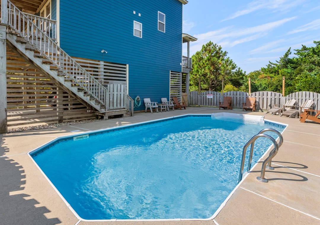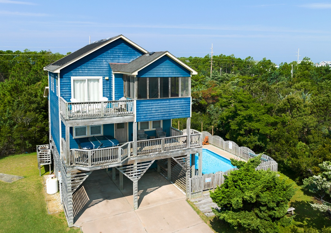 After a day at the beach. come home and take a refreshing dip in the private, solar heated pool or a relaxing soak in the seven-person hot tub. Whether lounging in the sun on the pool deck or splashing in the refreshing water, you're in for a good time. For lunch, cook up your fresh catch on the charcoal grill and eat around the picnic table. With all of this, who could ask for more? Make Sea Breeze Blue your choice and let the sea breezes blow your blues away!