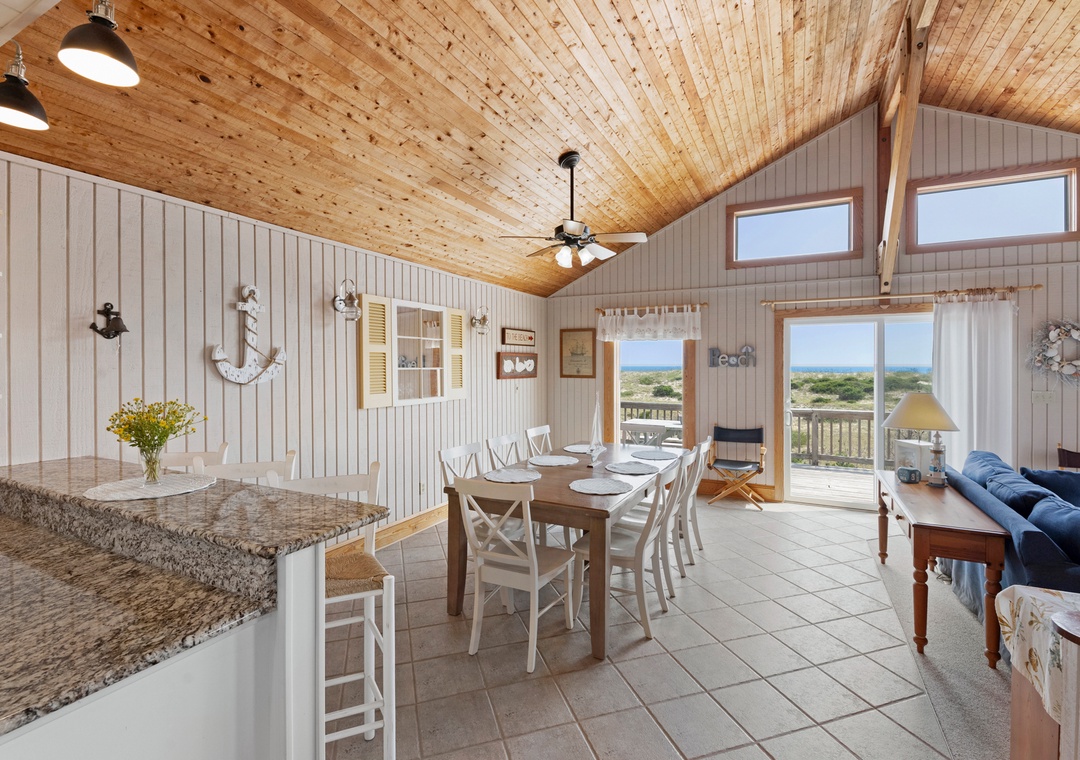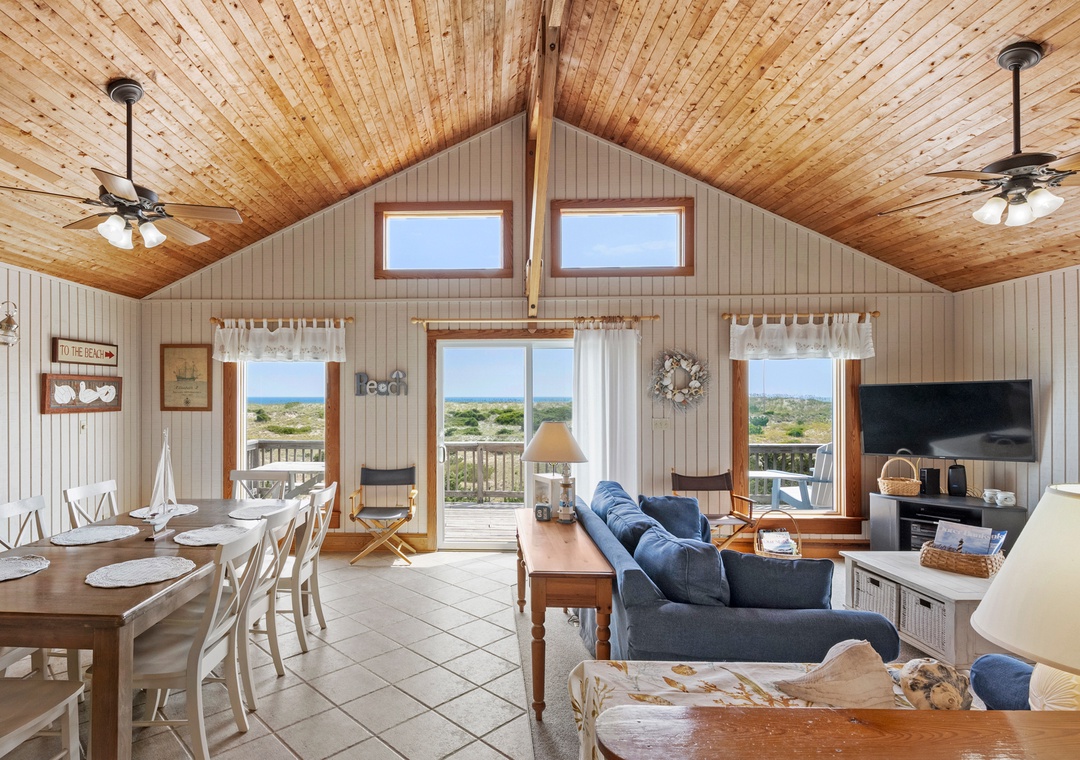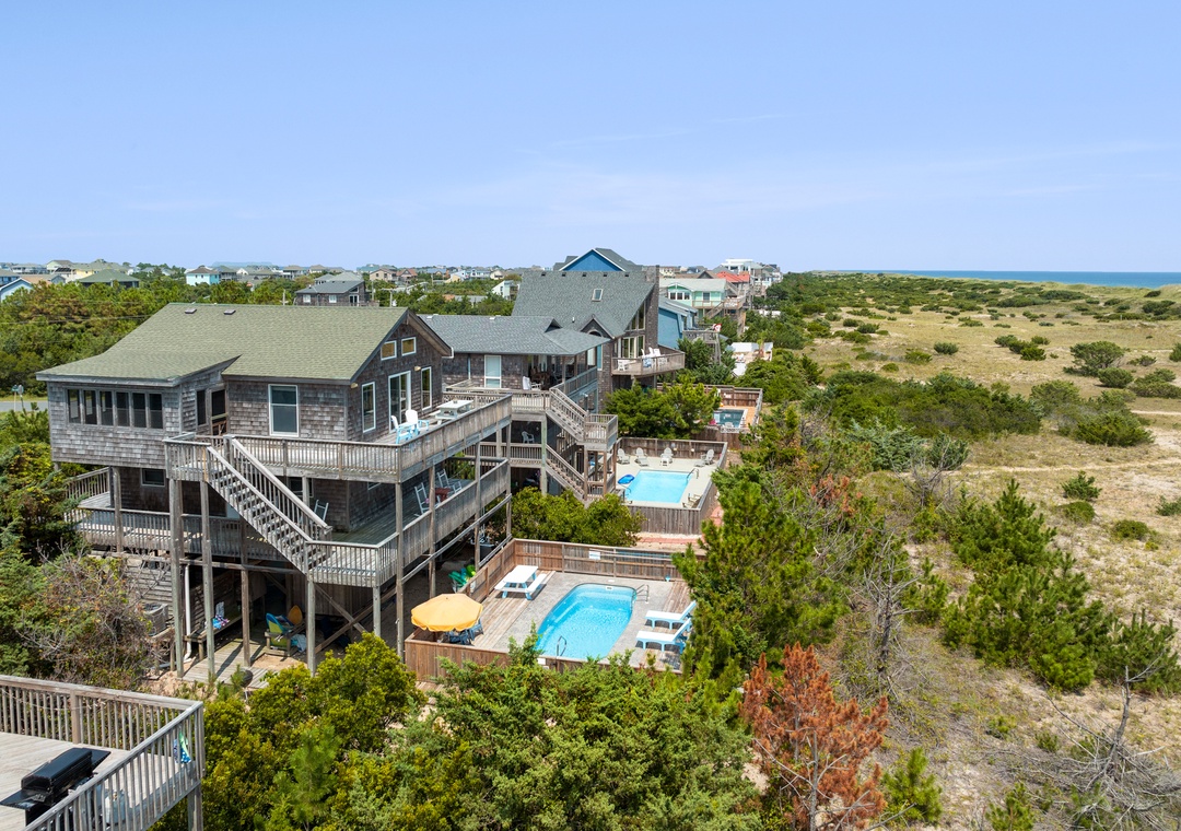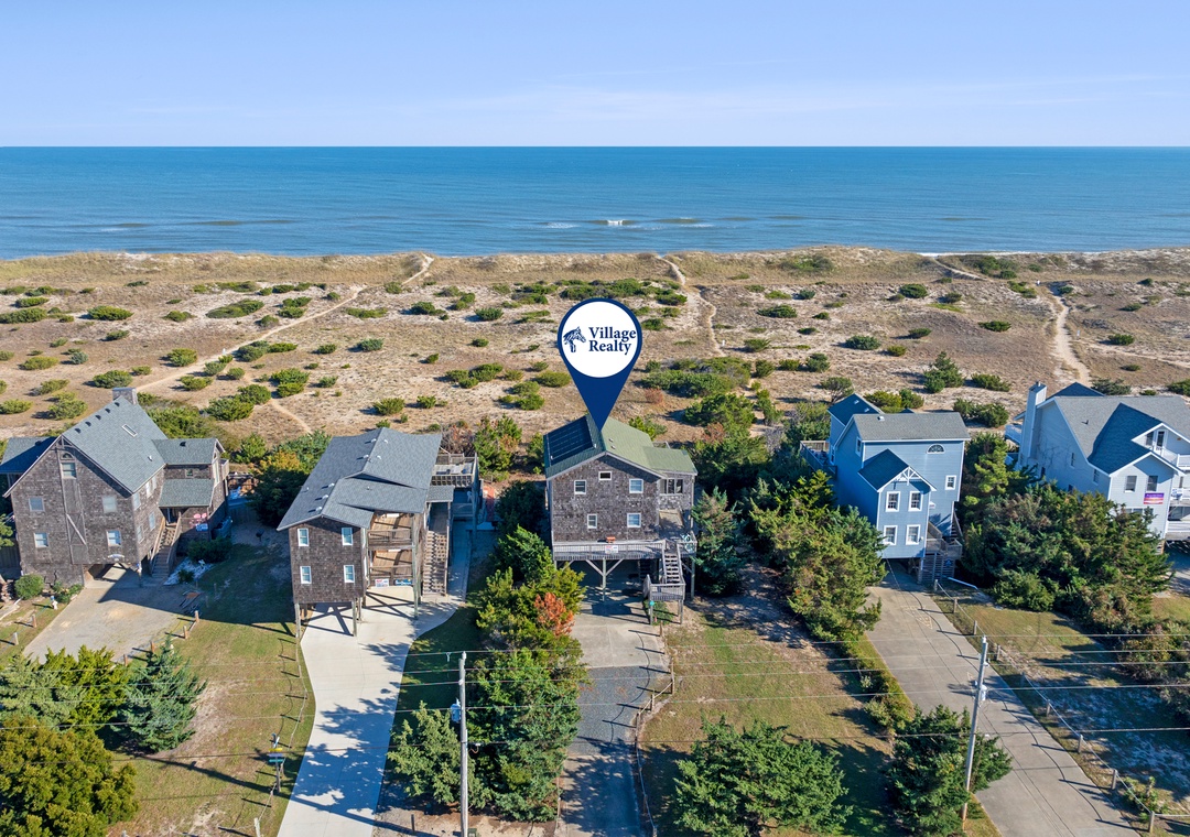 New to the Village Realty program and now accepting reservations for 2025! Break free from the hustle and bustle of everyday life and retreat to Sandescape in the Hatteras Colony community of Salvo. This oceanfront home offers direct beach access, unobstructed views and morning sunrises over the Atlantic. Your family will love having their very own private pool (with free solar heat!) right in the backyard for around-the-clock outdoor fun. A reverse floor plan takes full advantage of the ocean views, which can be enjoyed from all the common areas on the top level. Vaulted ceilings with original wood paneling and exposed beams add to the coastal charm of this classic beach cottage. A spacious living area provides plenty of comfortable seating, with an open-concept layout ideal for gathering. It leads out to a wrap-around oceanfront deck where you can soak up some Vitamin D while enjoying the view. Or make your way to the screened-in porch and relax in the shade with a cold beverage. Back inside, everyone can pitch in with meal prep using the well-equipped kitchen boasting gorgeous granite countertops and bar seating. The first of four bedrooms is also located on the top level and includes deck access and an adjacent hall bath that's been recently updated. Three more bedrooms are situated on the lower level, along with two more remodeled baths. Sandescape welcomes dogs, so your four-legged companions can join you on the pet-friendly beaches of Hatteras Island.