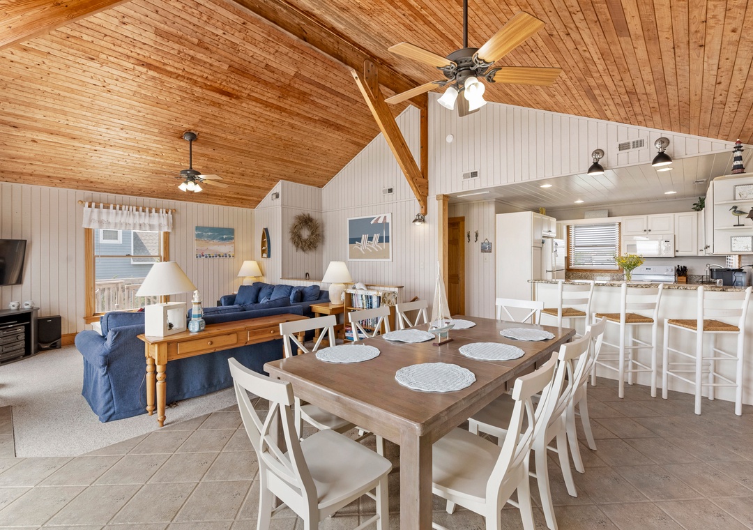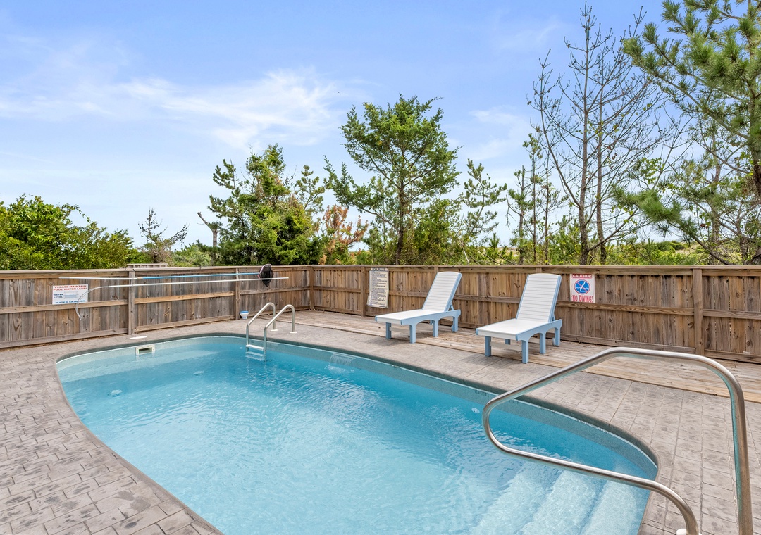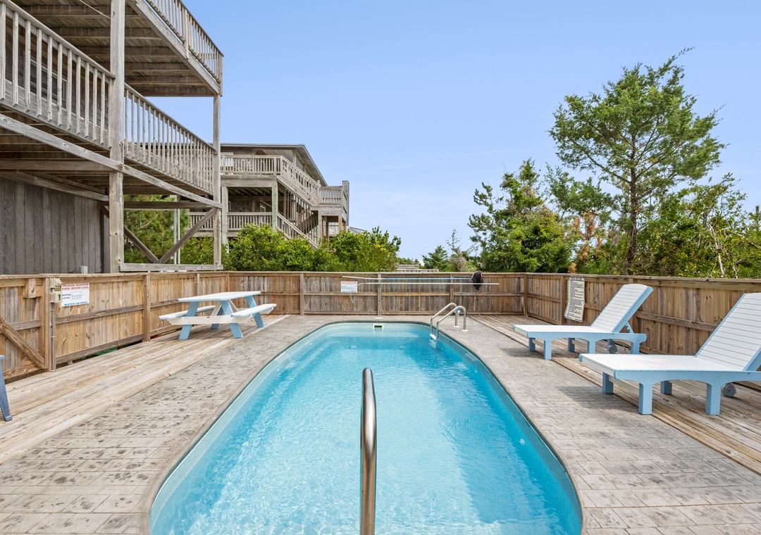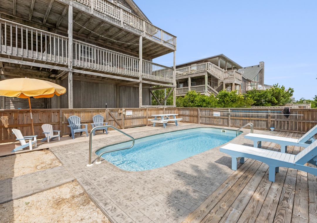 New to the Village Realty program and now accepting reservations for 2025! Break free from the hustle and bustle of everyday life and retreat to Sandescape in the Hatteras Colony community of Salvo. This oceanfront home offers direct beach access, unobstructed views and morning sunrises over the Atlantic. Your family will love having their very own private pool (with free solar heat!) right in the backyard for around-the-clock outdoor fun. A reverse floor plan takes full advantage of the ocean views, which can be enjoyed from all the common areas on the top level. Vaulted ceilings with original wood paneling and exposed beams add to the coastal charm of this classic beach cottage. A spacious living area provides plenty of comfortable seating, with an open-concept layout ideal for gathering. It leads out to a wrap-around oceanfront deck where you can soak up some Vitamin D while enjoying the view. Or make your way to the screened-in porch and relax in the shade with a cold beverage. Back inside, everyone can pitch in with meal prep using the well-equipped kitchen boasting gorgeous granite countertops and bar seating. The first of four bedrooms is also located on the top level and includes deck access and an adjacent hall bath that's been recently updated. Three more bedrooms are situated on the lower level, along with two more remodeled baths. Sandescape welcomes dogs, so your four-legged companions can join you on the pet-friendly beaches of Hatteras Island.