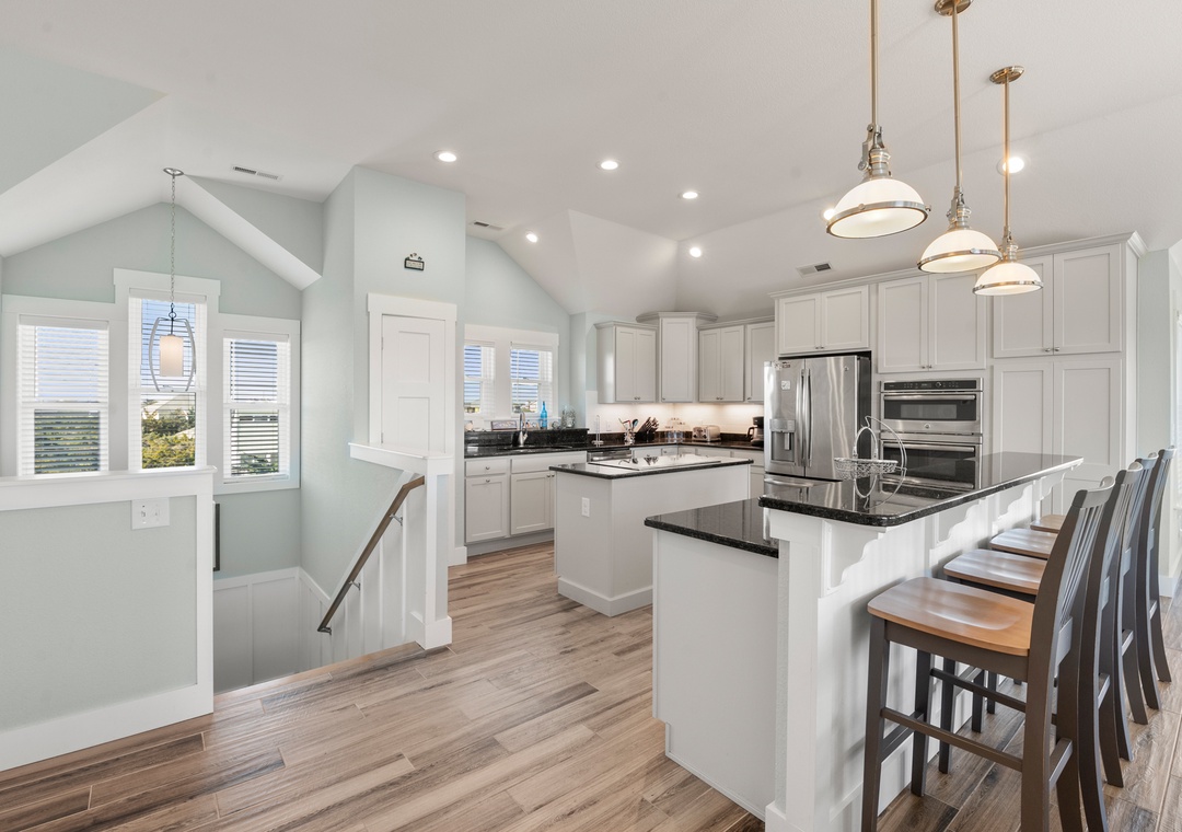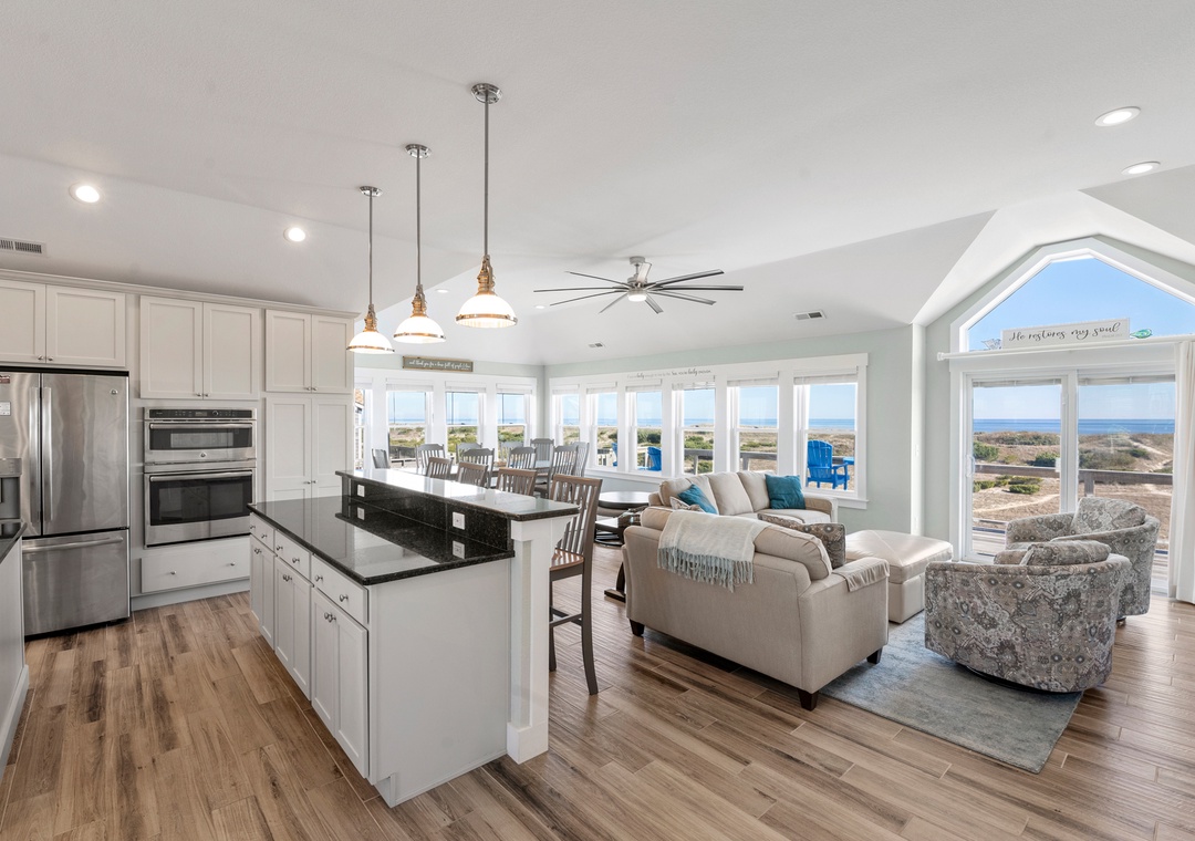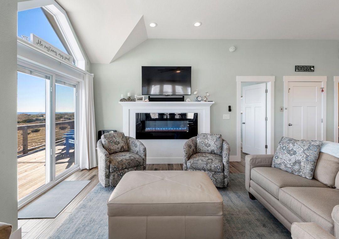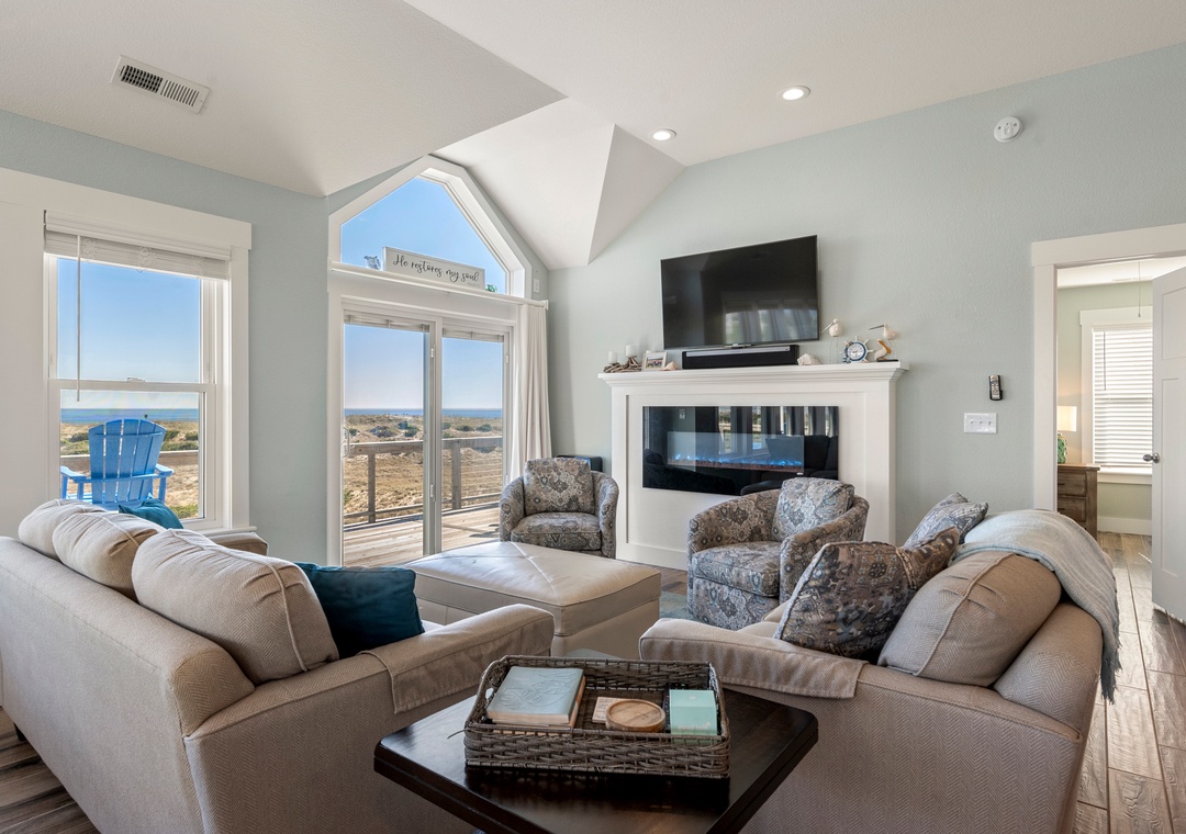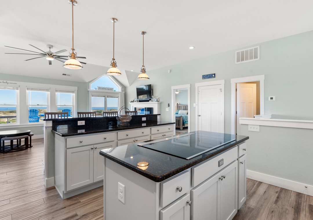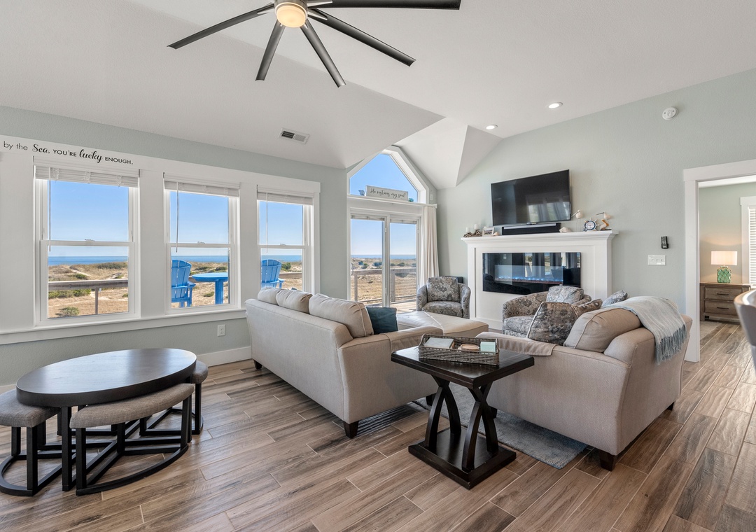 The great room on the top level is designed for entertaining and spending time with loved ones. Curl up in front of the cozy electric fireplace and admire the panoramic ocean views showcased by the wall of east-facing windows. Comfortable furnishings, a soothing color palette and LVP flooring throughout create a casual, family-friendly space. Embrace your inner chef in the gourmet kitchen that boasts two islands, granite countertops and stainless steel GE Profile appliances. An expansive oceanfront sun deck serves as an extension of the great room for effortless indoor/outdoor living. It's the perfect spot to watch the sunrise with your morning coffee or simply take in the salt air and ocean breezes. Salt & Light is equipped with an elevator, ideal for guests with mobility needs or for sending luggage and groceries to the upper levels.