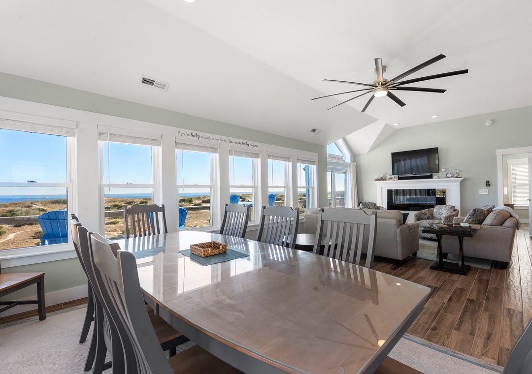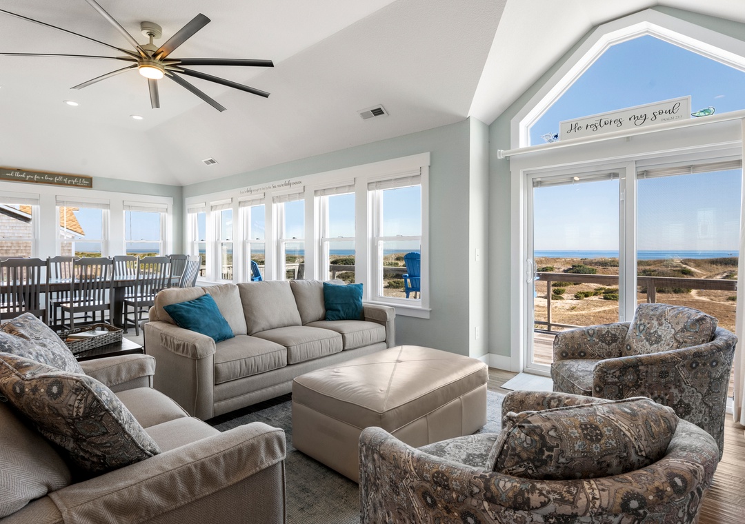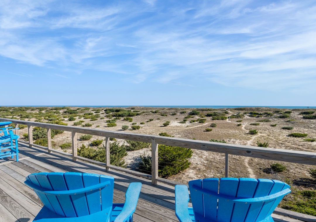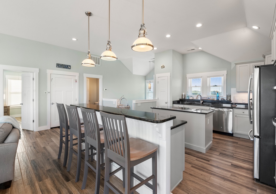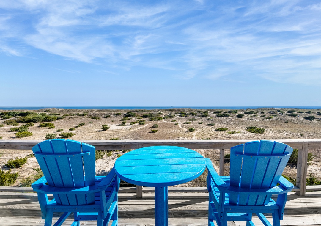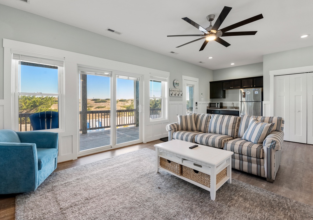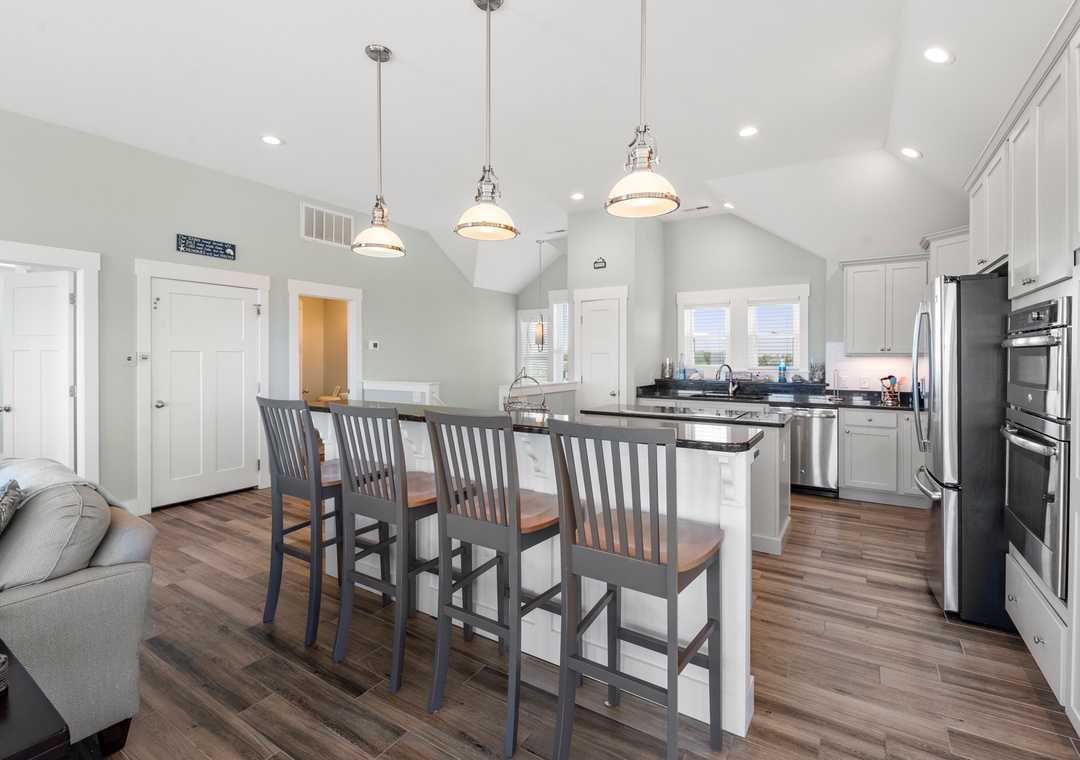 The great room on the top level is designed for entertaining and spending time with loved ones. Curl up in front of the cozy electric fireplace and admire the panoramic ocean views showcased by the wall of east-facing windows. Comfortable furnishings, a soothing color palette and LVP flooring throughout create a casual, family-friendly space. Embrace your inner chef in the gourmet kitchen that boasts two islands, granite countertops and stainless steel GE Profile appliances. An expansive oceanfront sun deck serves as an extension of the great room for effortless indoor/outdoor living. It's the perfect spot to watch the sunrise with your morning coffee or simply take in the salt air and ocean breezes. Salt & Light is equipped with an elevator, ideal for guests with mobility needs or for sending luggage and groceries to the upper levels.