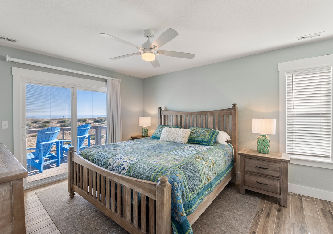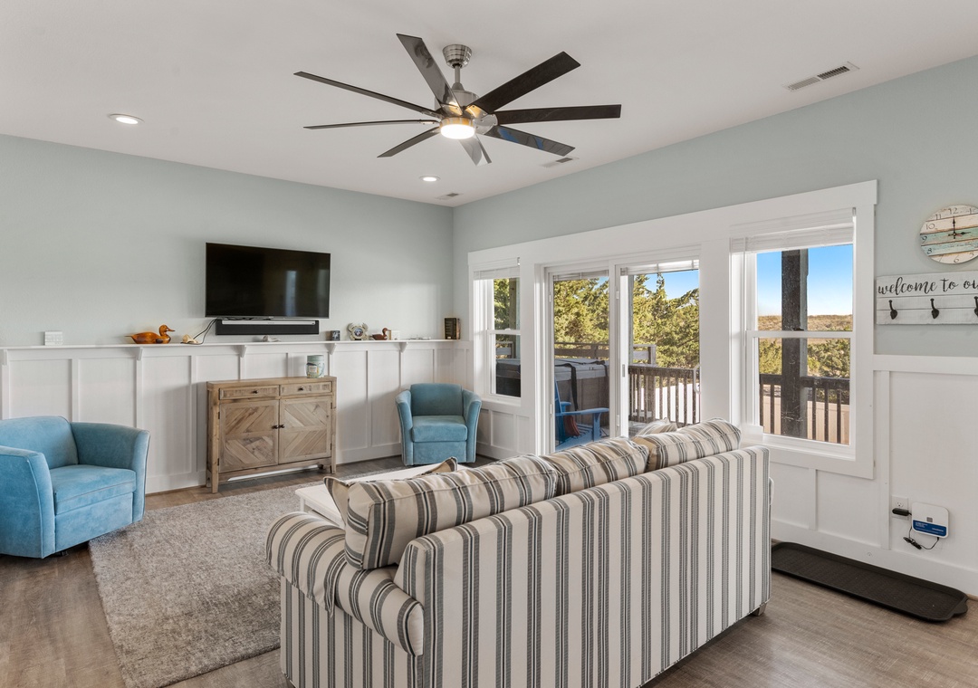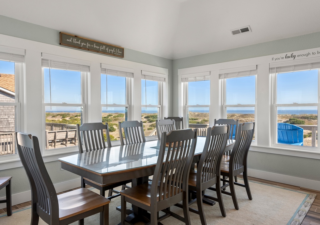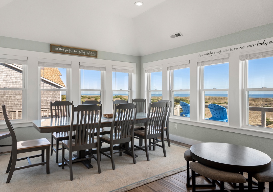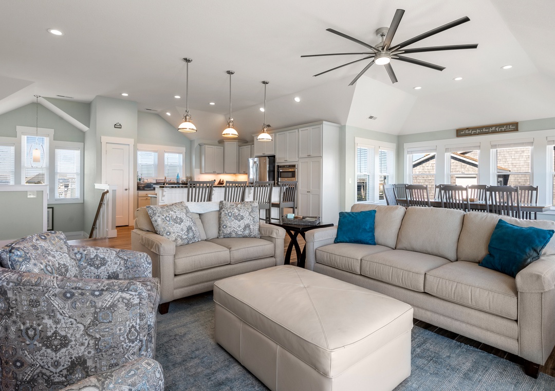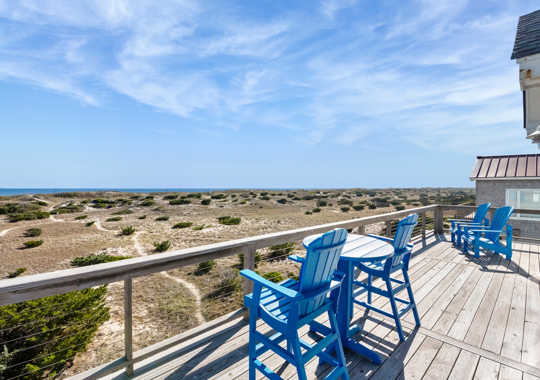 The great room on the top level is designed for entertaining and spending time with loved ones. Curl up in front of the cozy electric fireplace and admire the panoramic ocean views showcased by the wall of east-facing windows. Comfortable furnishings, a soothing color palette and LVP flooring throughout create a casual, family-friendly space. Embrace your inner chef in the gourmet kitchen that boasts two islands, granite countertops and stainless steel GE Profile appliances. An expansive oceanfront sun deck serves as an extension of the great room for effortless indoor/outdoor living. It's the perfect spot to watch the sunrise with your morning coffee or simply take in the salt air and ocean breezes. Salt & Light is equipped with an elevator, ideal for guests with mobility needs or for sending luggage and groceries to the upper levels.